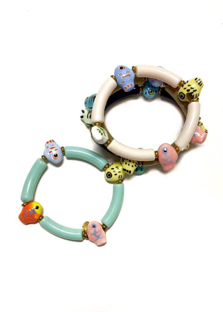 Each bracelet is strung with smooth, curved beads and finished with tiny fish charms in cheerful, hand-painted details that make every piece feel special. Lightweight and easy to slip on, it’s perfect for stacking or wearing solo when you want just a hint of whimsy.
