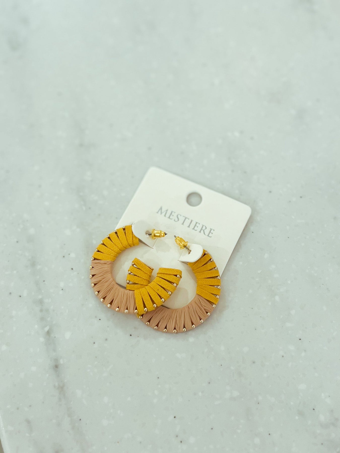 Be fashion-forward and fun with these unique Camie Circle Raffia Earrings! Featuring open circle shapes with raffia details, these lightweight earrings provide a two-tone look of both gold and beige for a truly one-of-a-kind statement. Who said earrings can't be fashionable and fun? They said it, not us!!