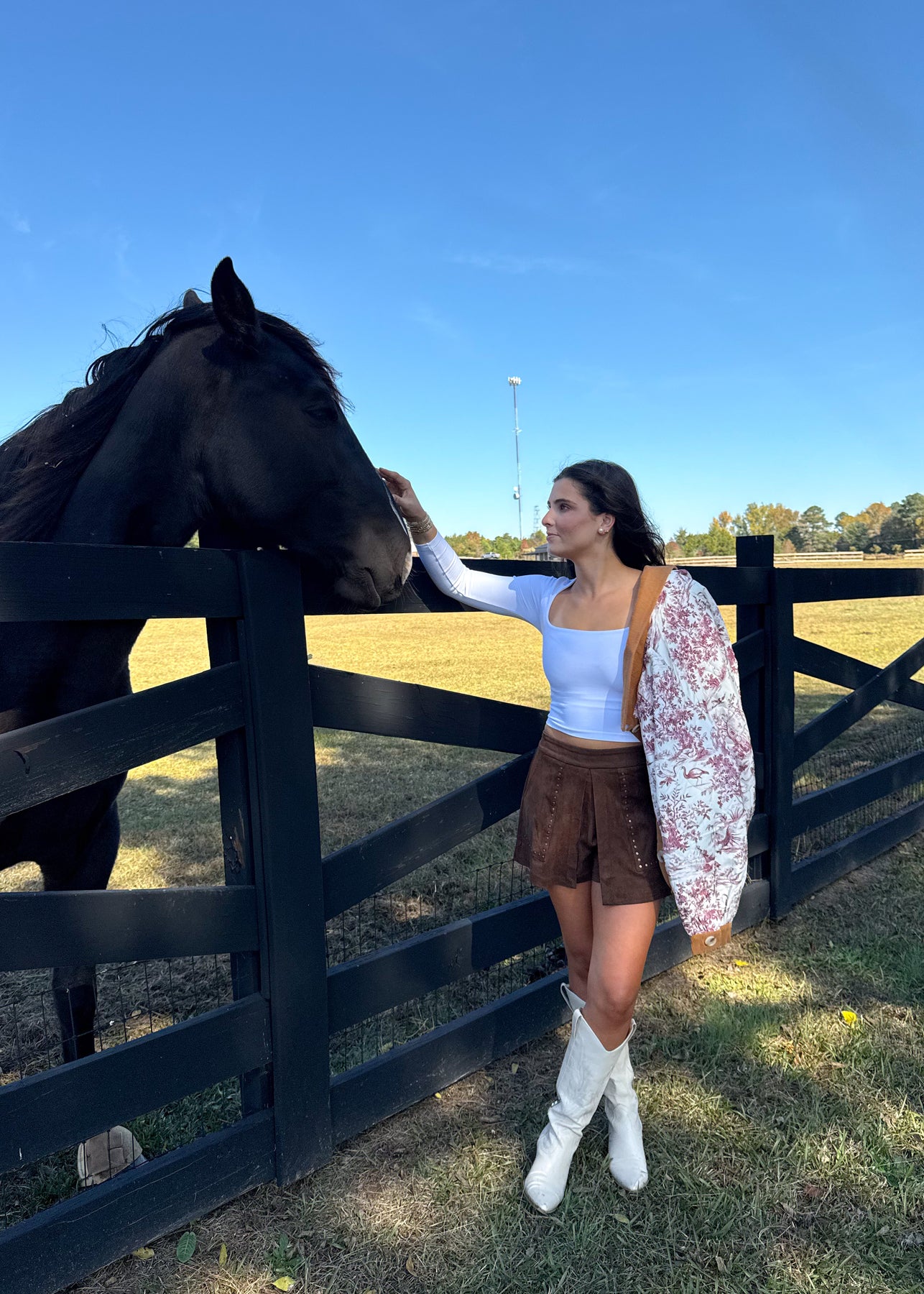 Crafted from soft faux suede, this skort blends classic Western influence with modern ease. The A-line silhouette features front pleats, practical side pockets, and antique-style stud trim for subtle edge. A hidden back zipper keeps the look clean and polished—perfect for pairing with knits, boots, or blouses for a season-spanning outfit.