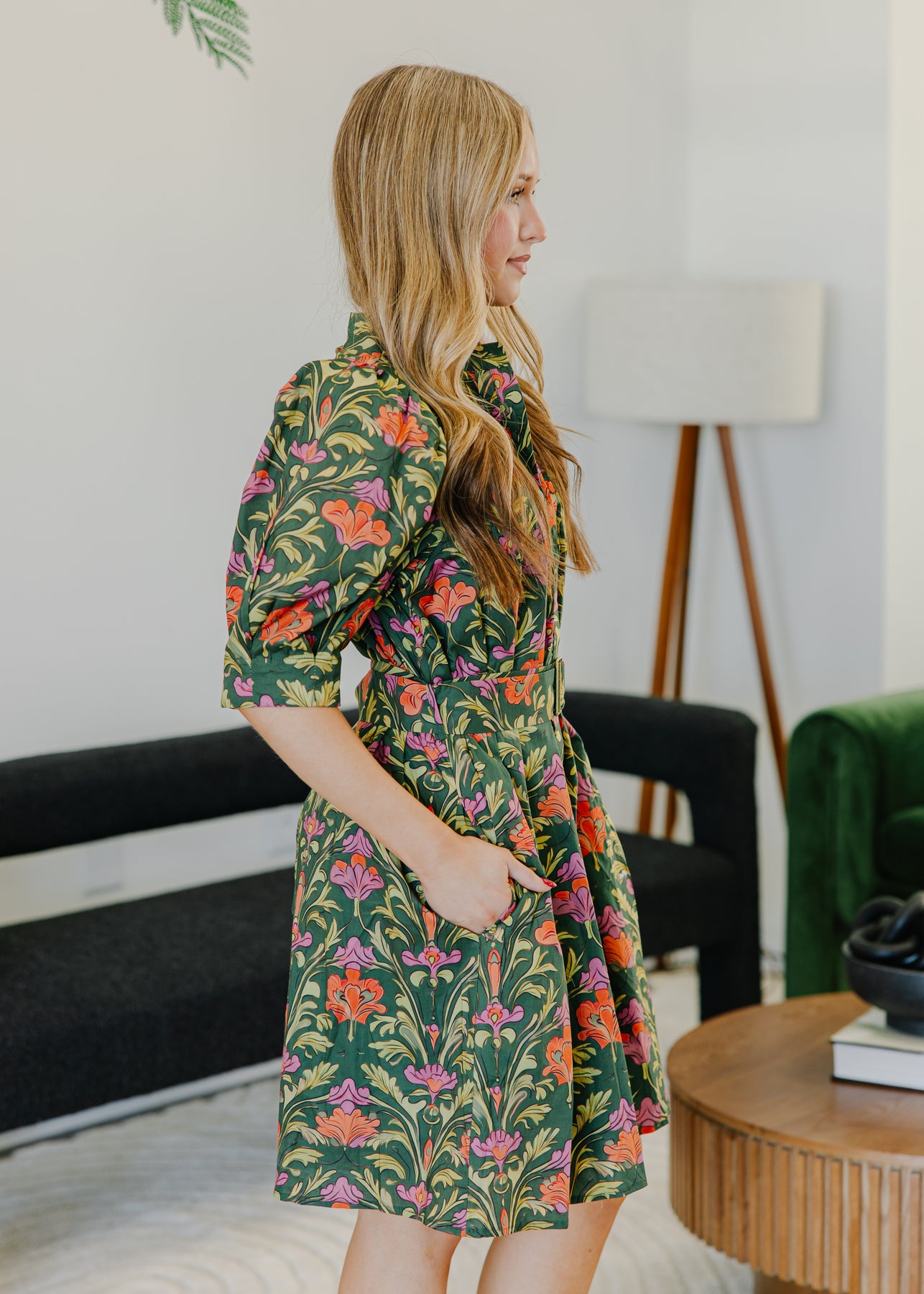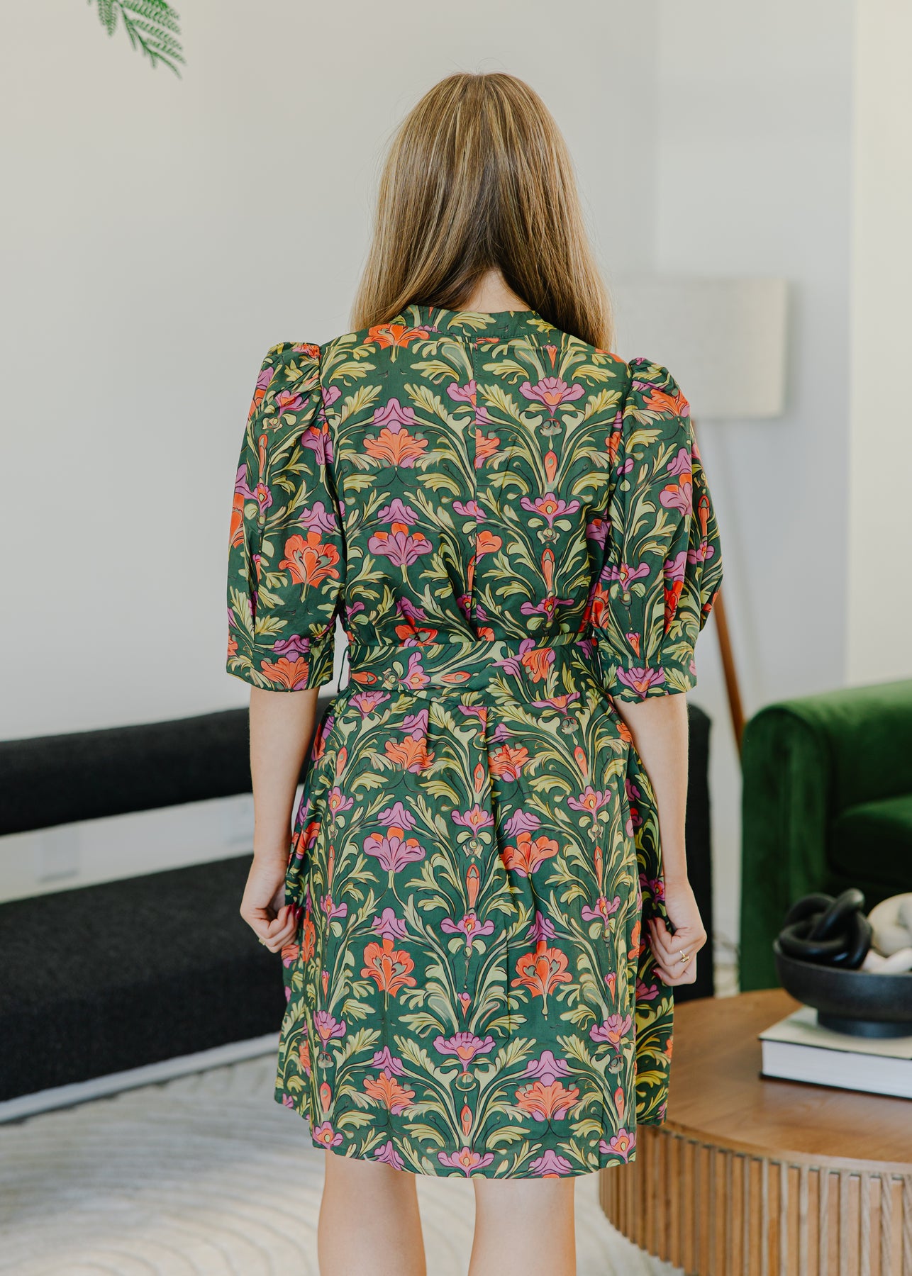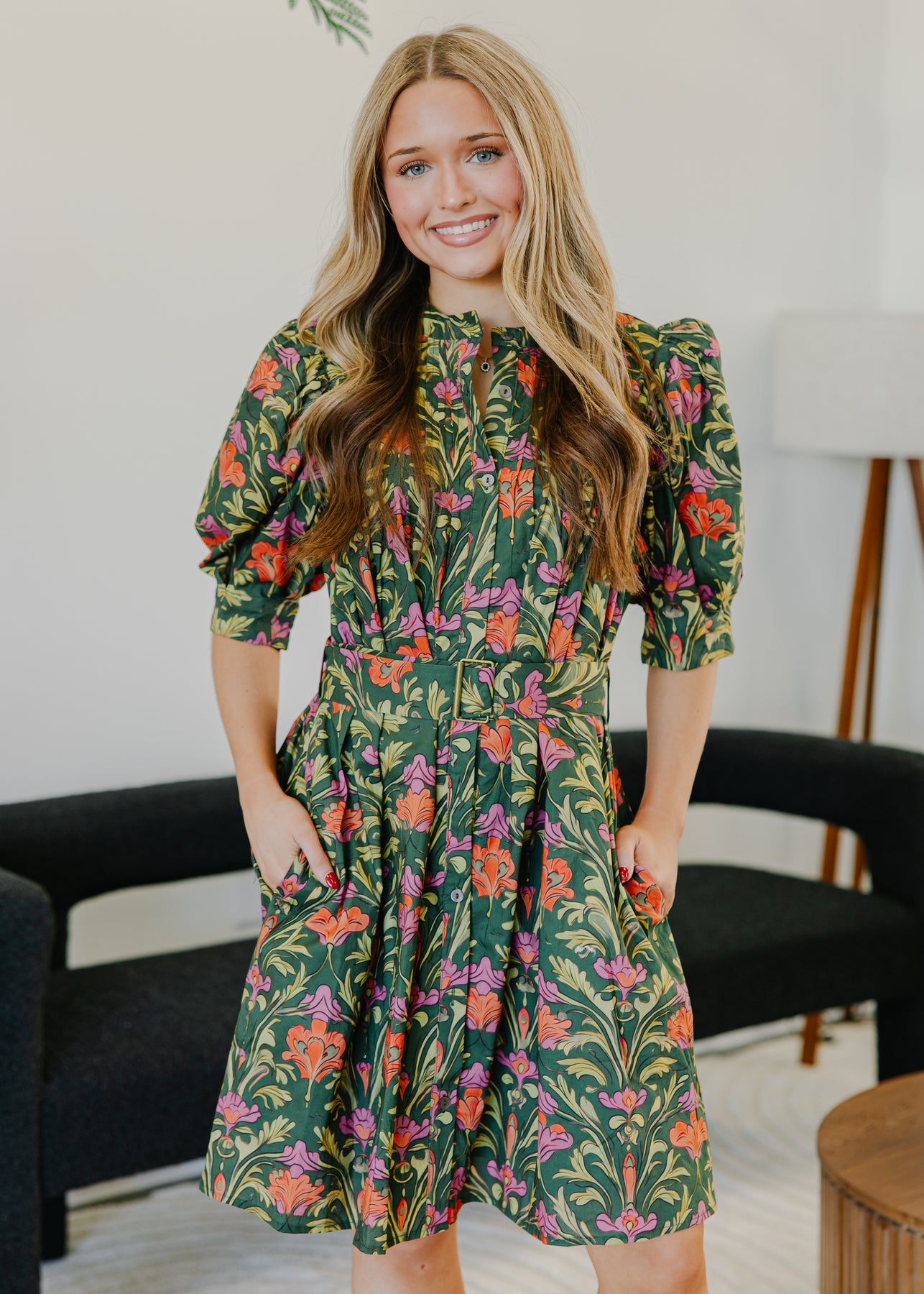This floral belted mini dress is full of charm and character, featuring a bold allover print with a rich botanical motif. Designed with a round neckline, front button detailing, and structured pleating through the bodice, it creates a flattering fit-and-flare silhouette. The matching waist belt cinches the shape, while short puff sleeves add a touch of volume.
