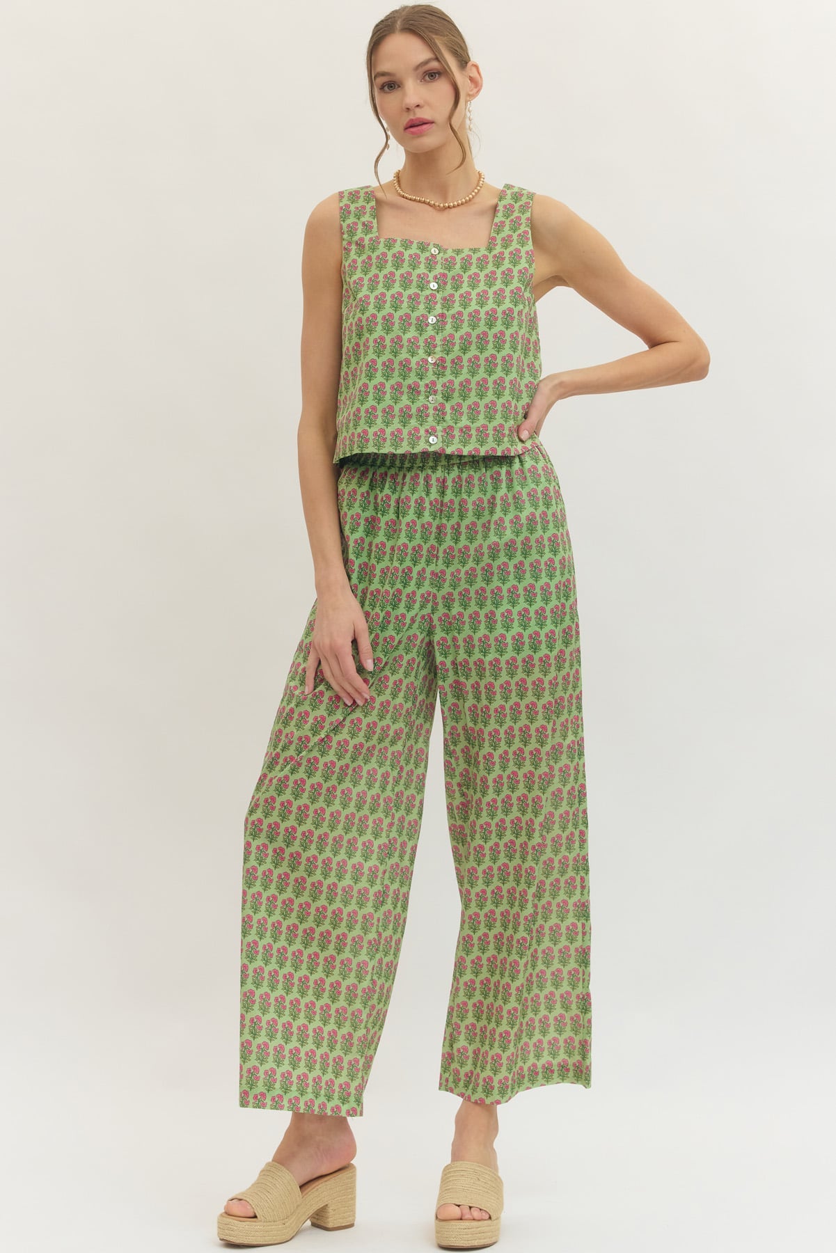 Regular price $ 48.00Easy, breezy, and made for comfort, the Marlowe Printed Wide Leg Pants are a standout choice for relaxed yet styled days. Designed with a wide leg silhouette and an elastic waistband, these pants offer a comfortable fit that moves with you while still looking polished. The all over print adds visual interest, making them perfect for pairing with simple tees, tanks, or lightweight tops. Ideal for warm weather, casual outings, or laid back weekends, these pants bring effortless style and comfort together in one easy piece.