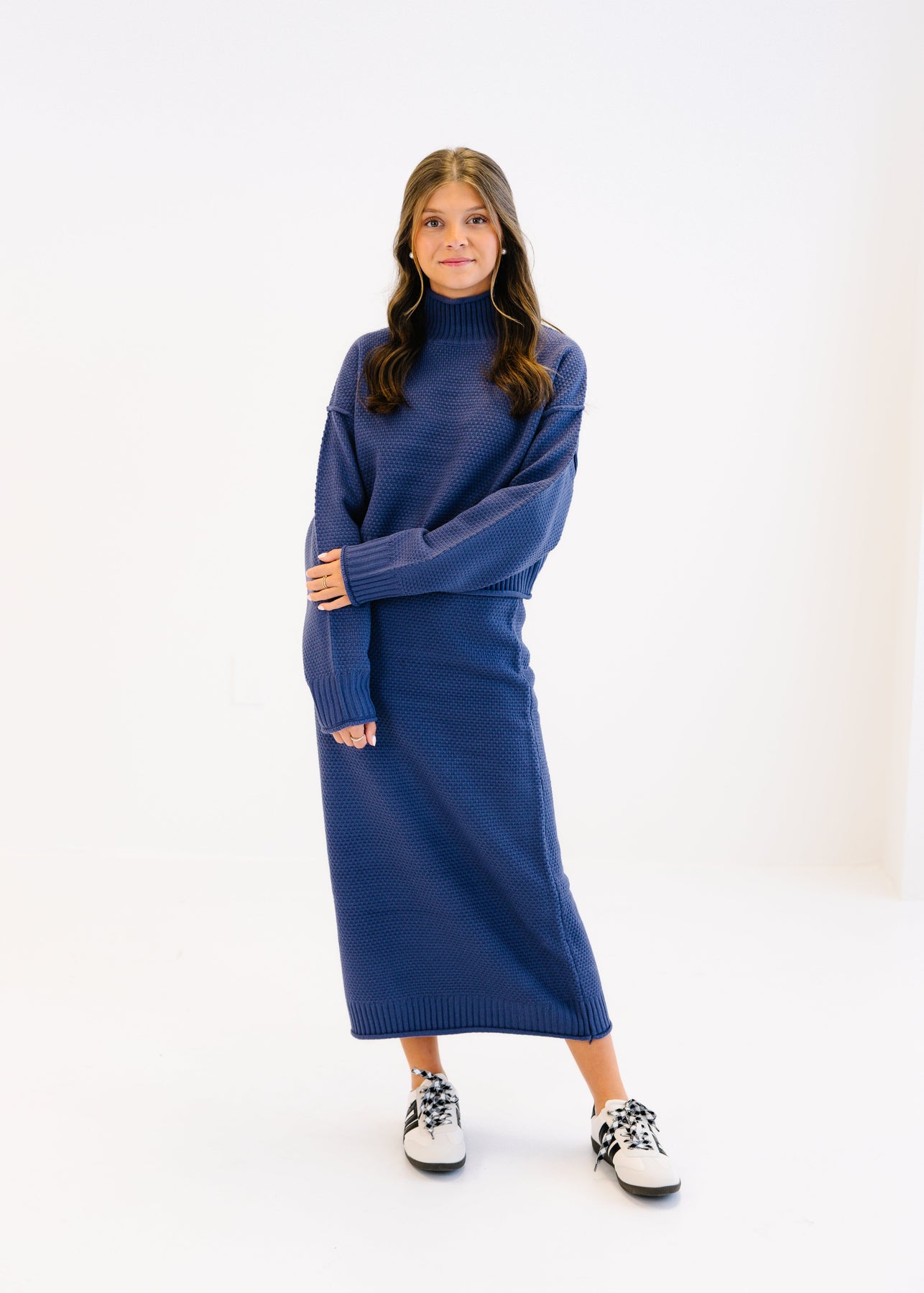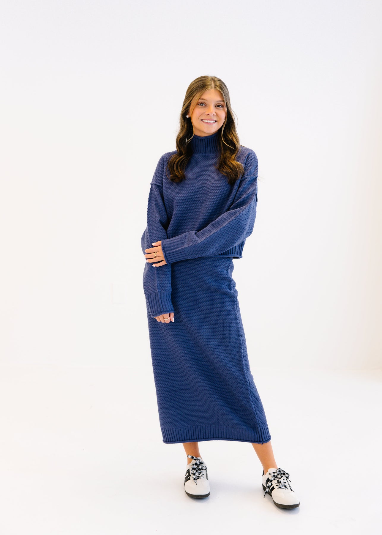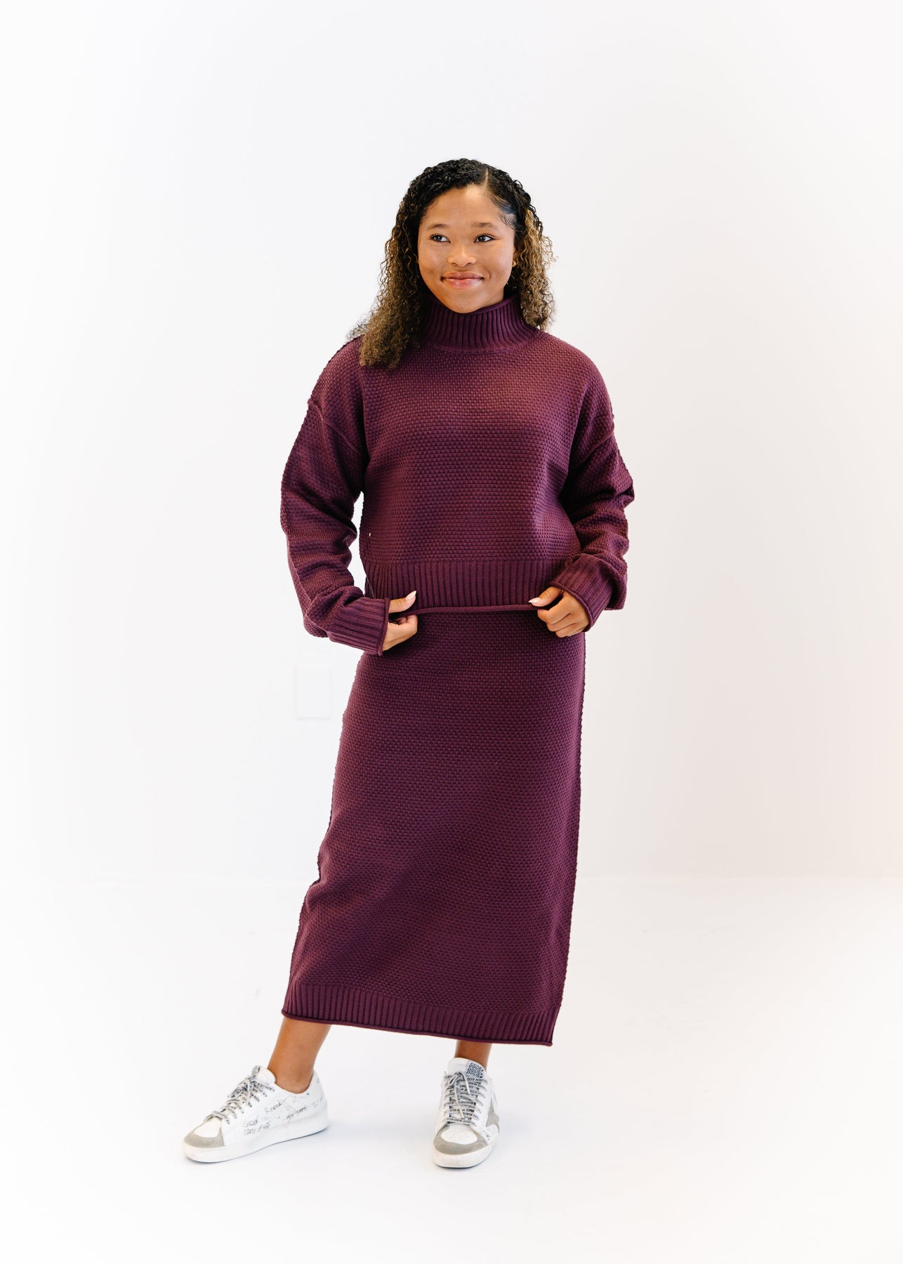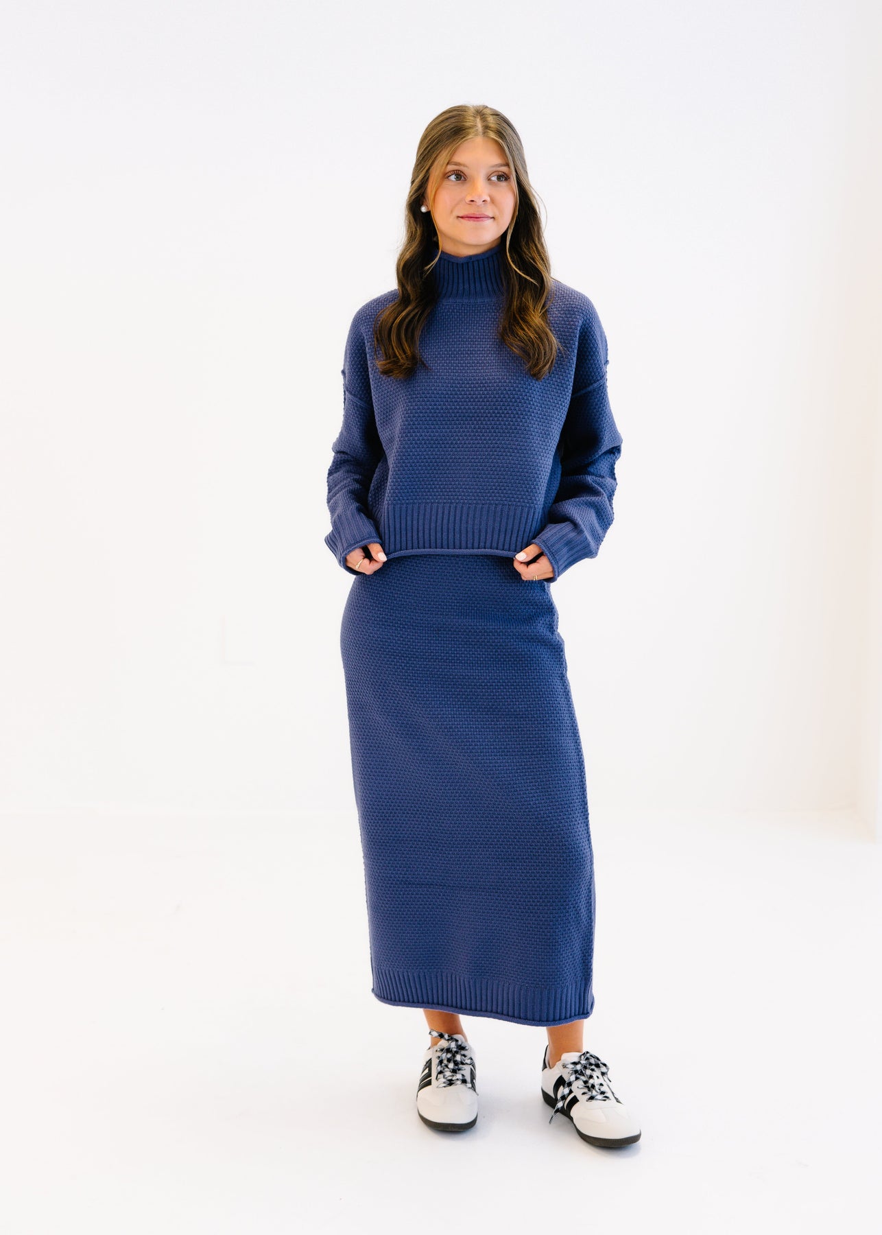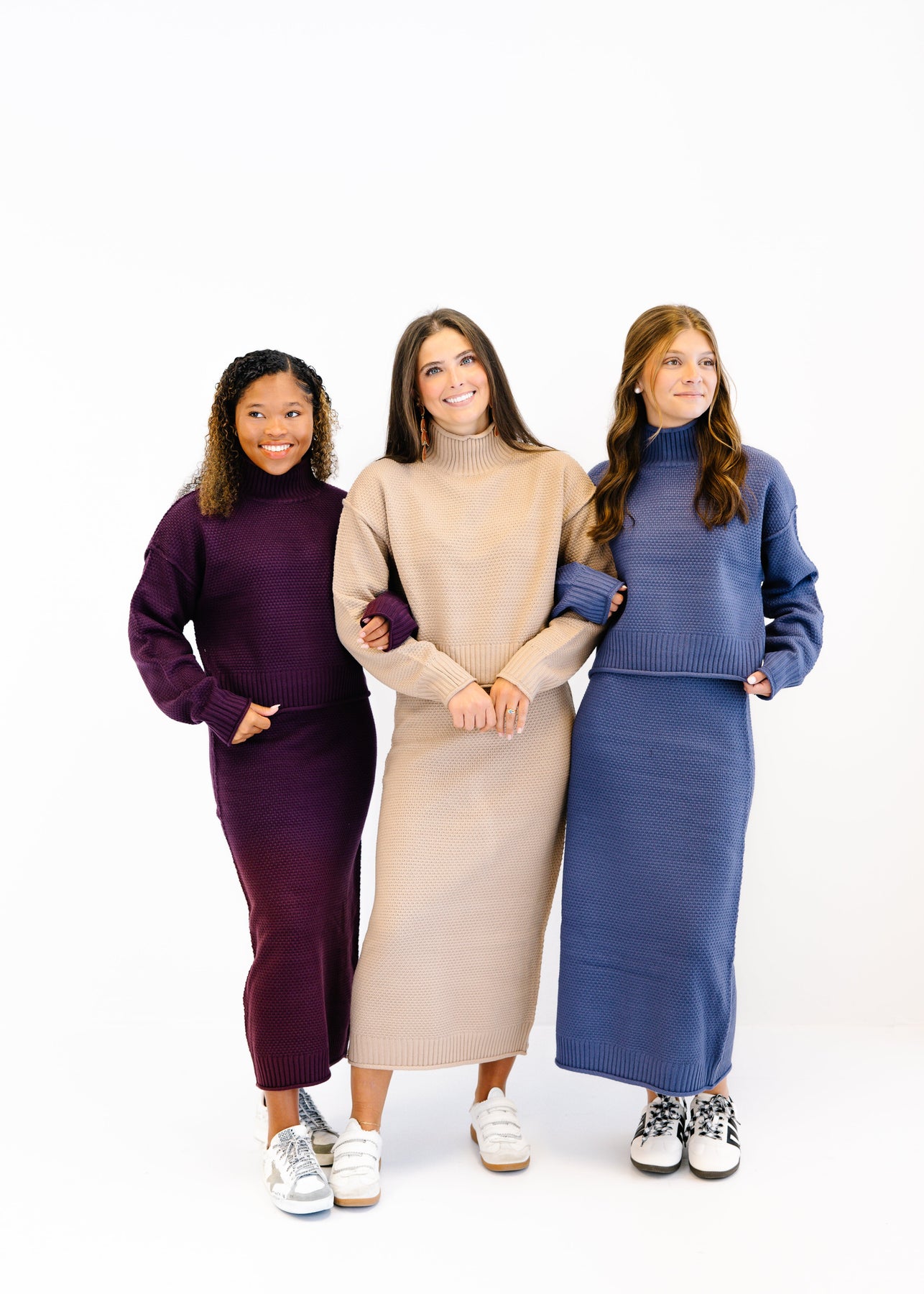 The Simone Knit Skirt Set is a perfect blend of cozy and chic. Featuring a relaxed mock-neck sweater with drop shoulders and ribbed trim, paired with a matching high-waisted, ankle-grazing skirt, this set delivers effortless style. Its textured knit fabric in a beautiful hue makes it ideal for lounging in luxury or stepping out in casual sophistication. Wear together for a polished, put-together look or mix and match with your favorite pieces for endless versatility.