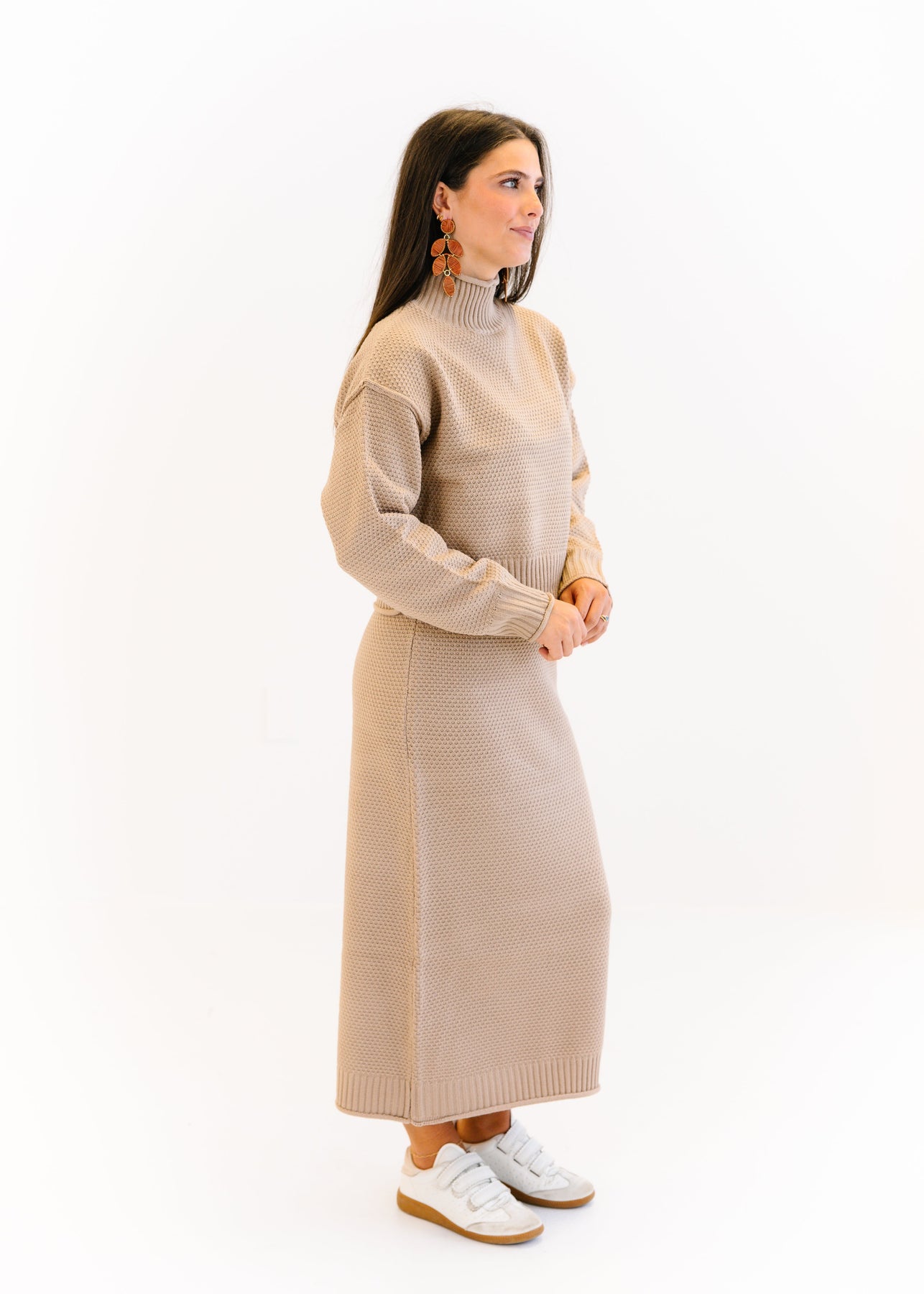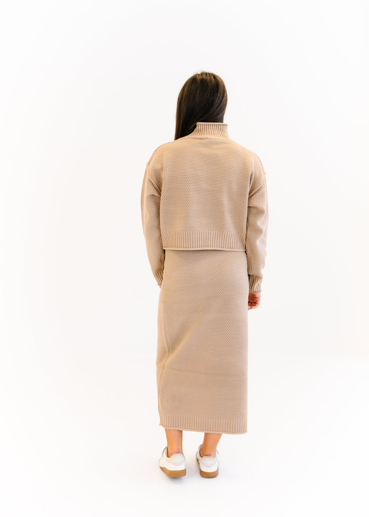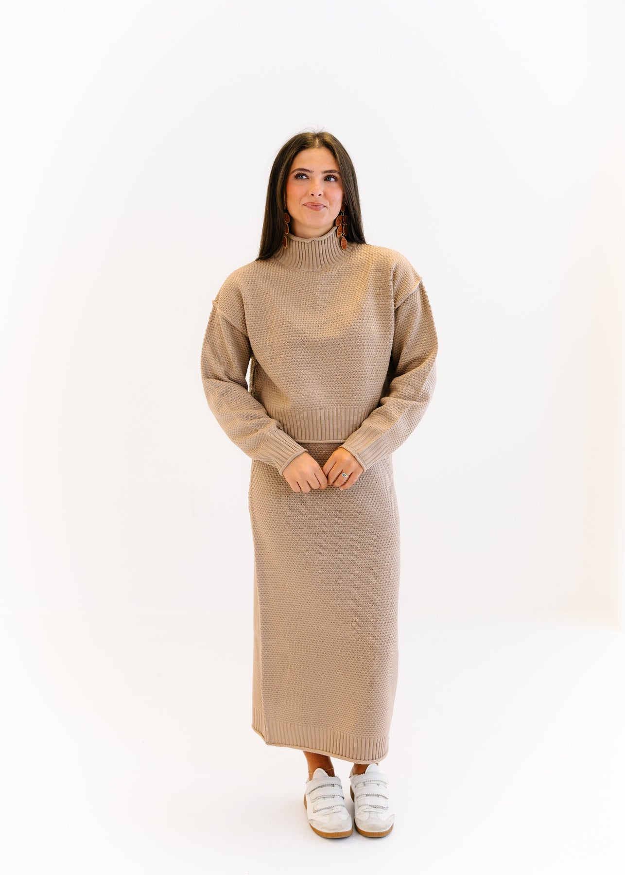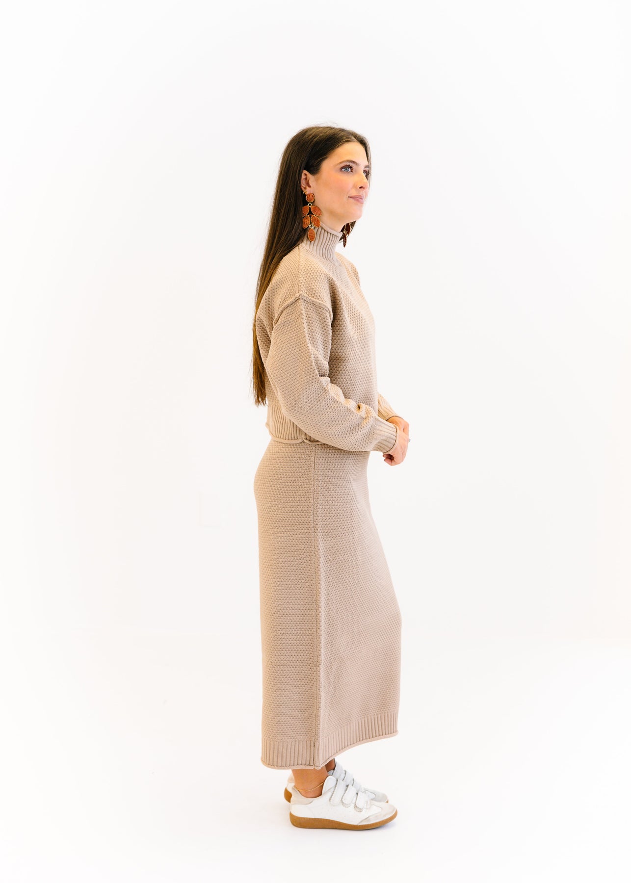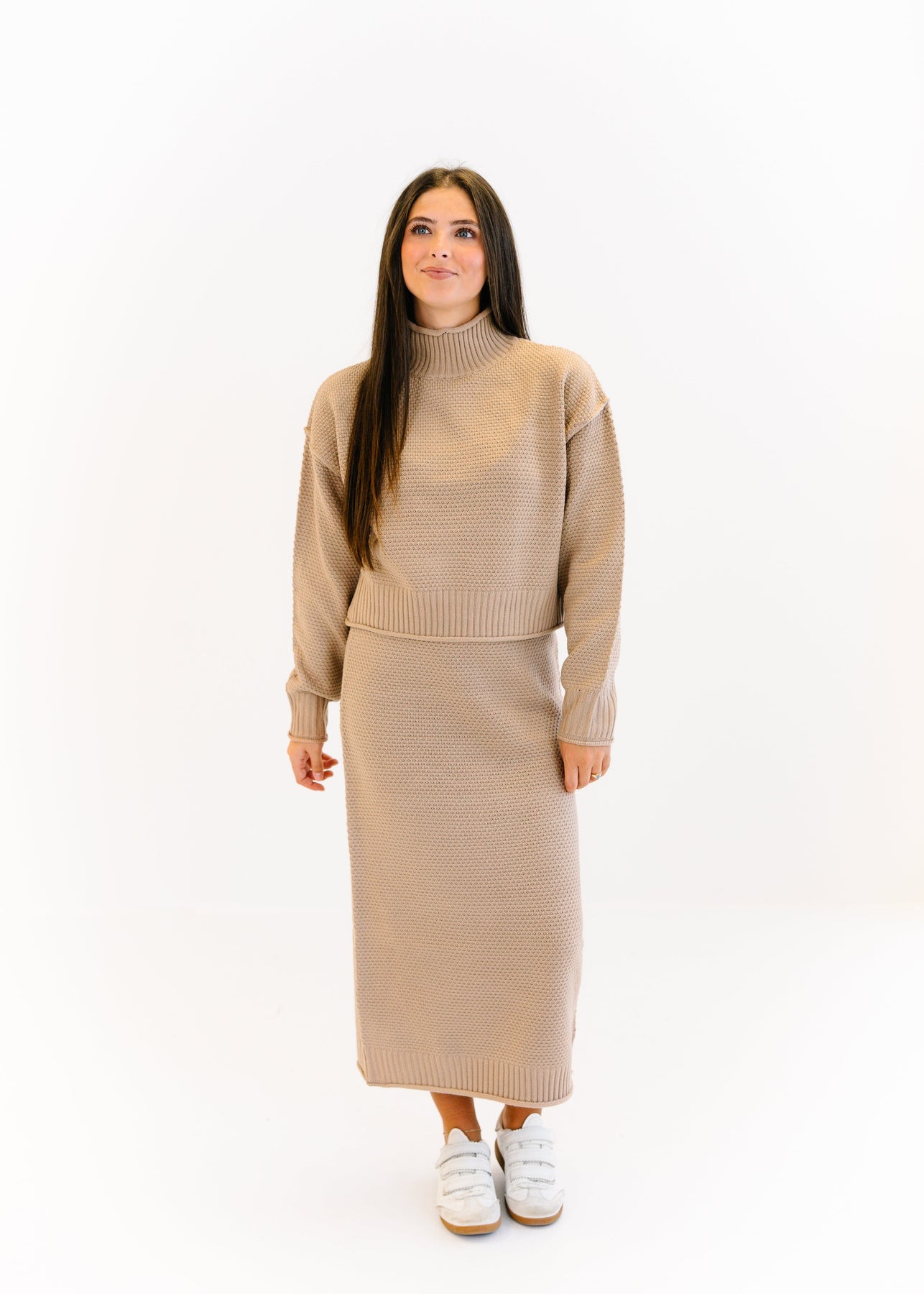The Simone Knit Skirt Set is a perfect blend of cozy and chic. Featuring a relaxed mock-neck sweater with drop shoulders and ribbed trim, paired with a matching high-waisted, ankle-grazing skirt, this set delivers effortless style. Its textured knit fabric in a beautiful hue makes it ideal for lounging in luxury or stepping out in casual sophistication. Wear together for a polished, put-together look or mix and match with your favorite pieces for endless versatility.