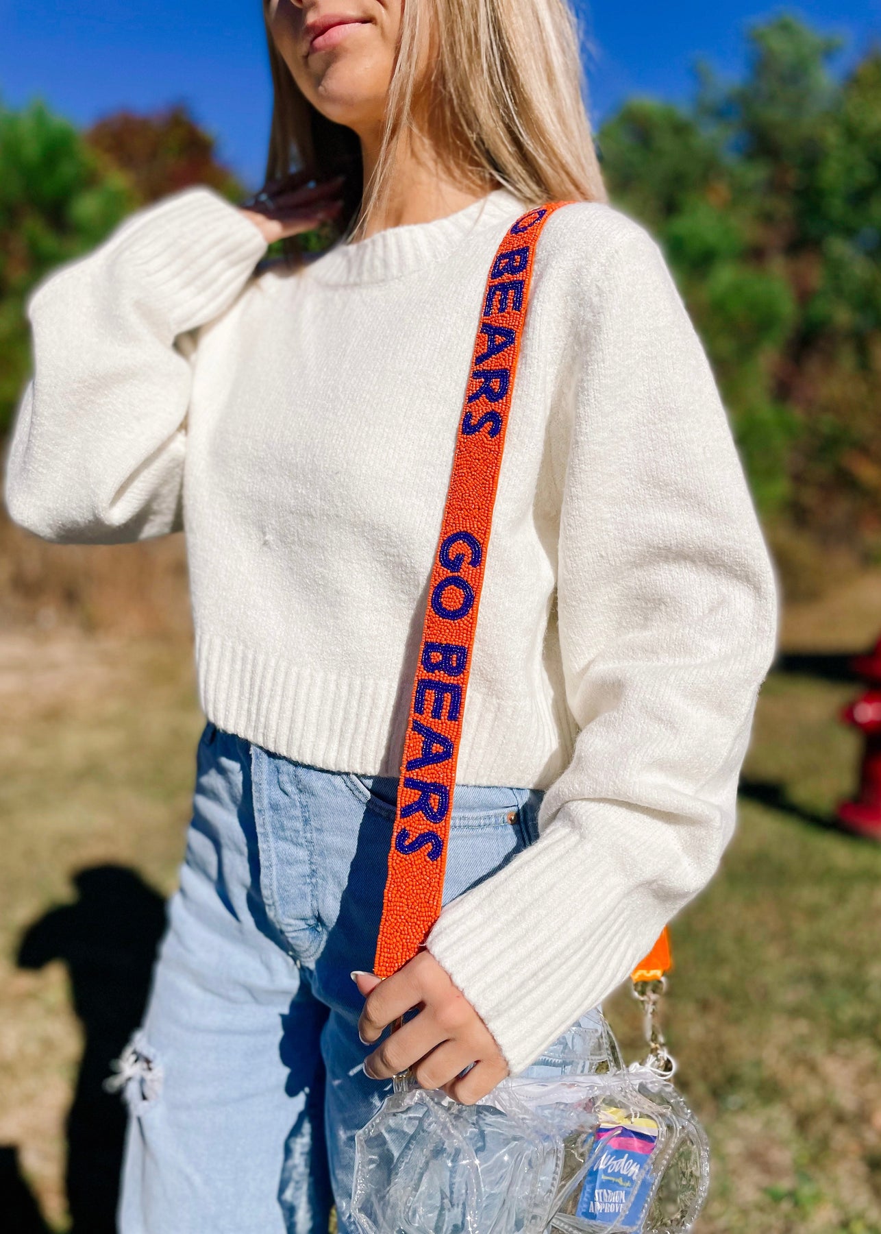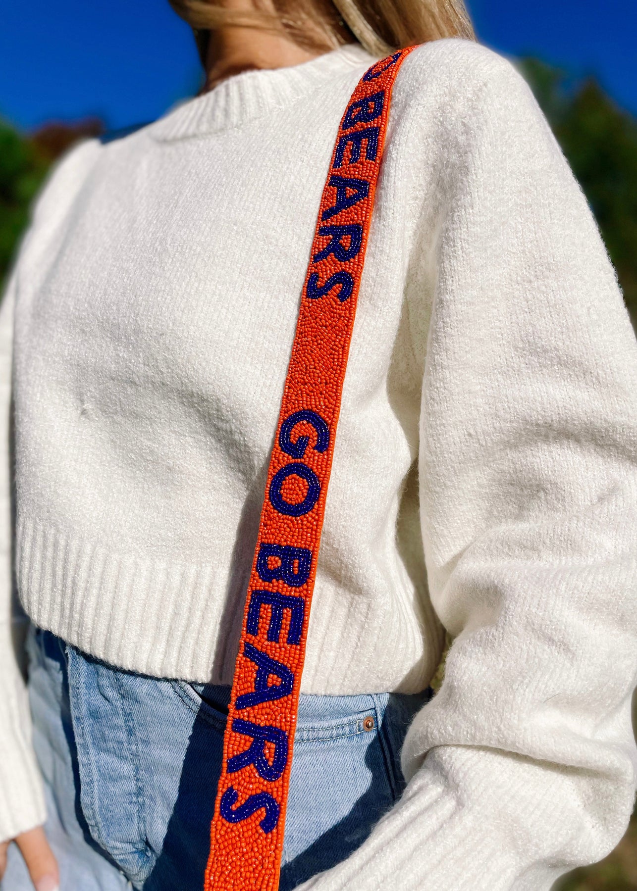 The Mercer Beaded Purse Strap is the perfect way to add style and your Mercer team spirit to any bag! Easily accessorize any game day outfit with this Mercer purse strap. This beaded purse strap is 4' L, 1.5" W, has a gold clasp closure at each end. The Mercer Beaded Purse Strap features a 'Go Bears' design.