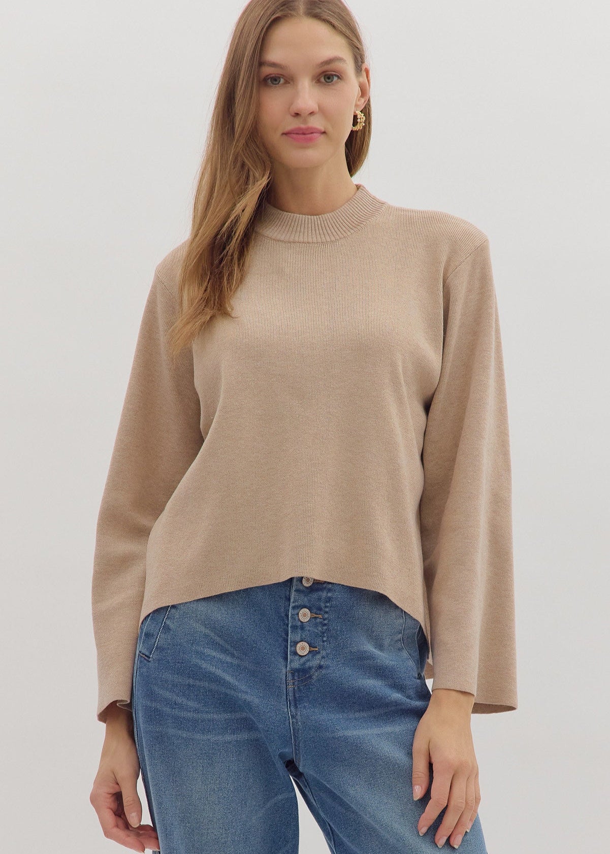 Solid long sleeve sweater knit top featuring mock neck and slit detail at sleeve openings. Unlined. Sweater knit. Non-sheer. Lightweight.