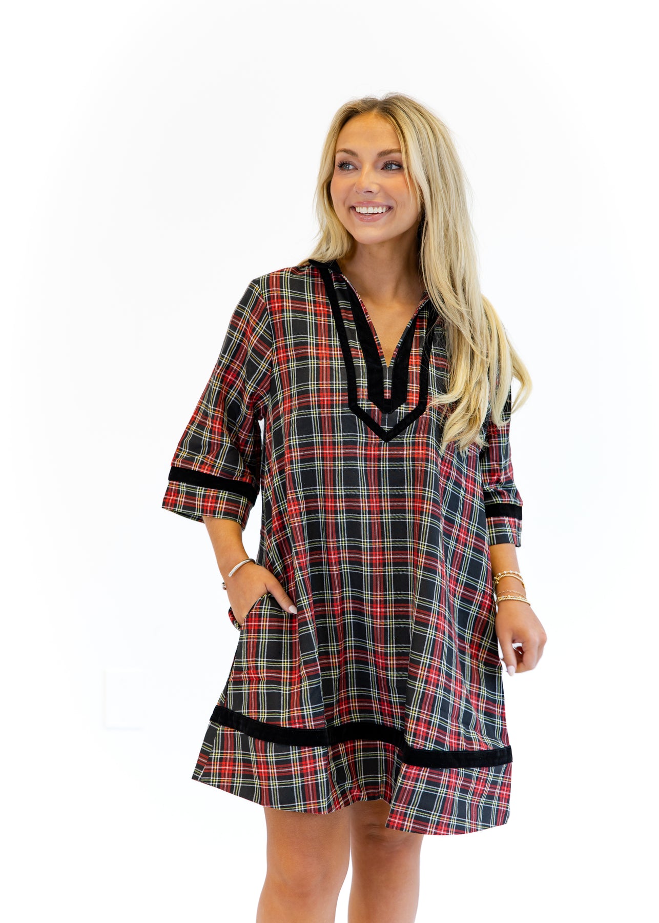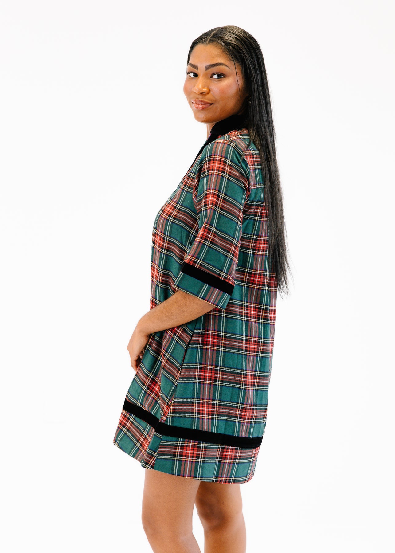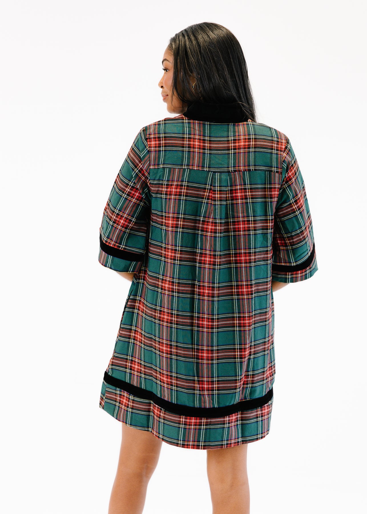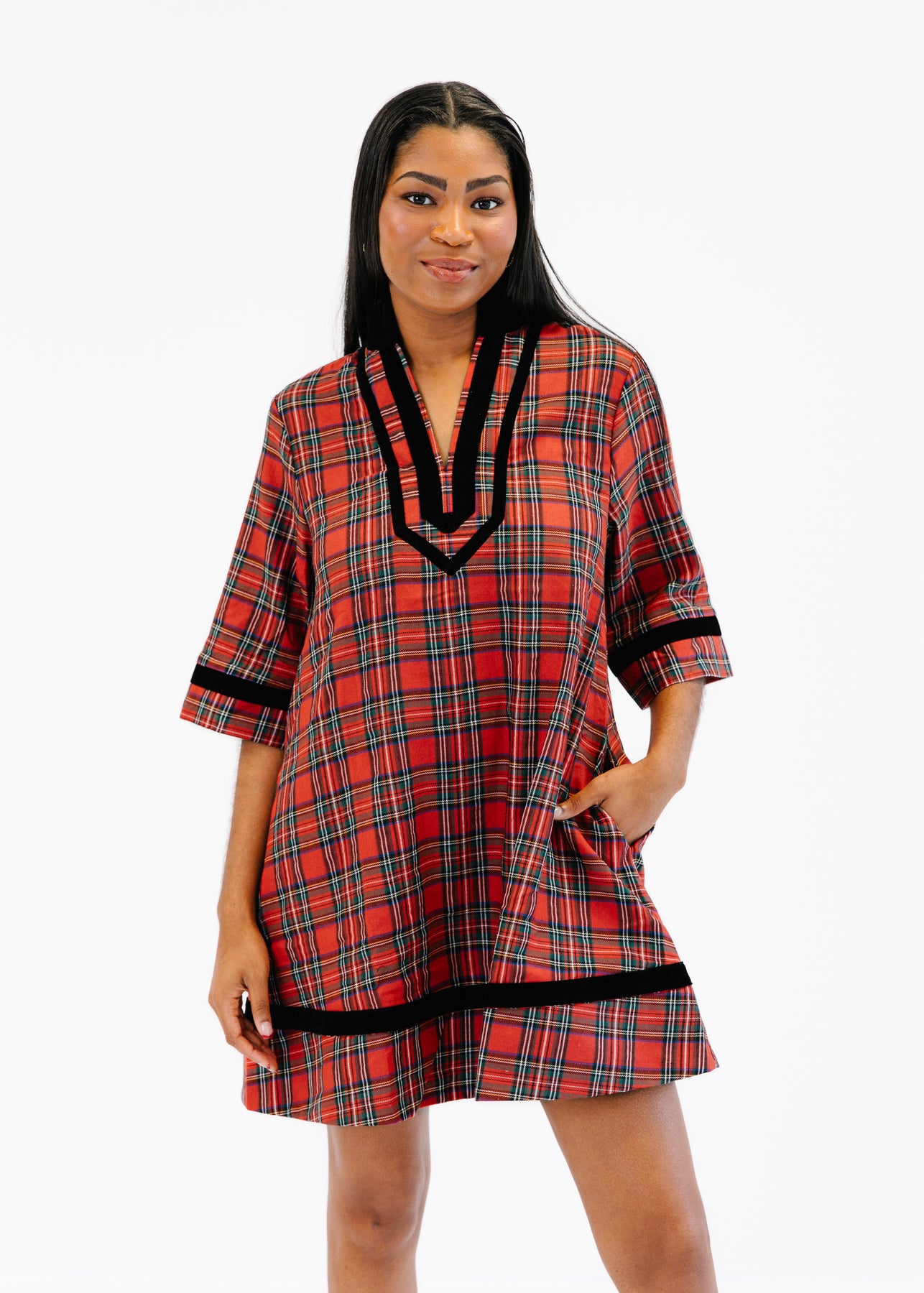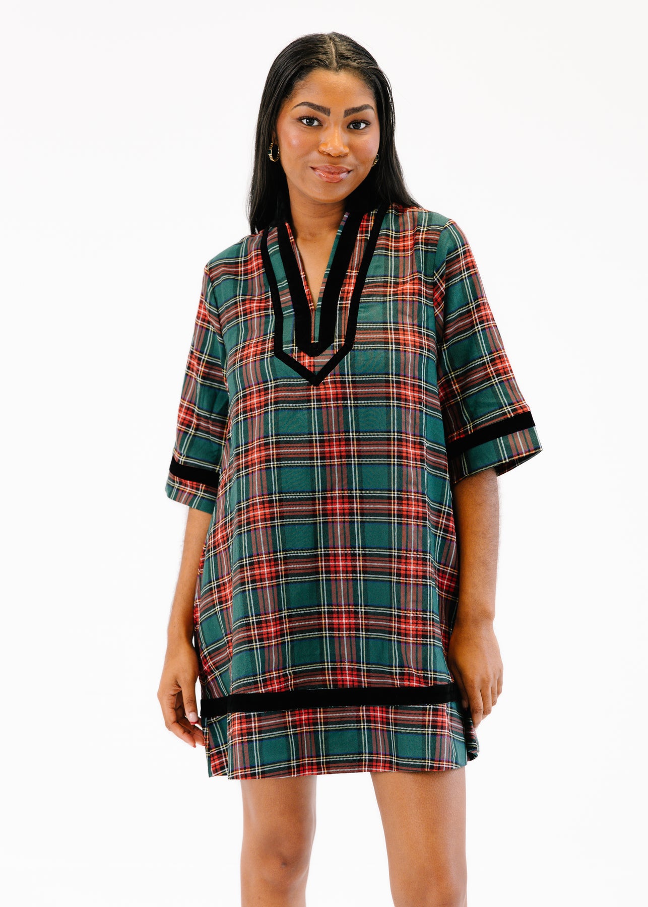 This plaid tunic mini dress blends classic charm with a modern twist. Featuring a bold plaid pattern with contrasting velvet trim along the neckline, sleeves, and hem, it offers a festive and stylish look. The relaxed fit and above-the-knee length make it perfect for seasonal events, game days, or casual gatherings.