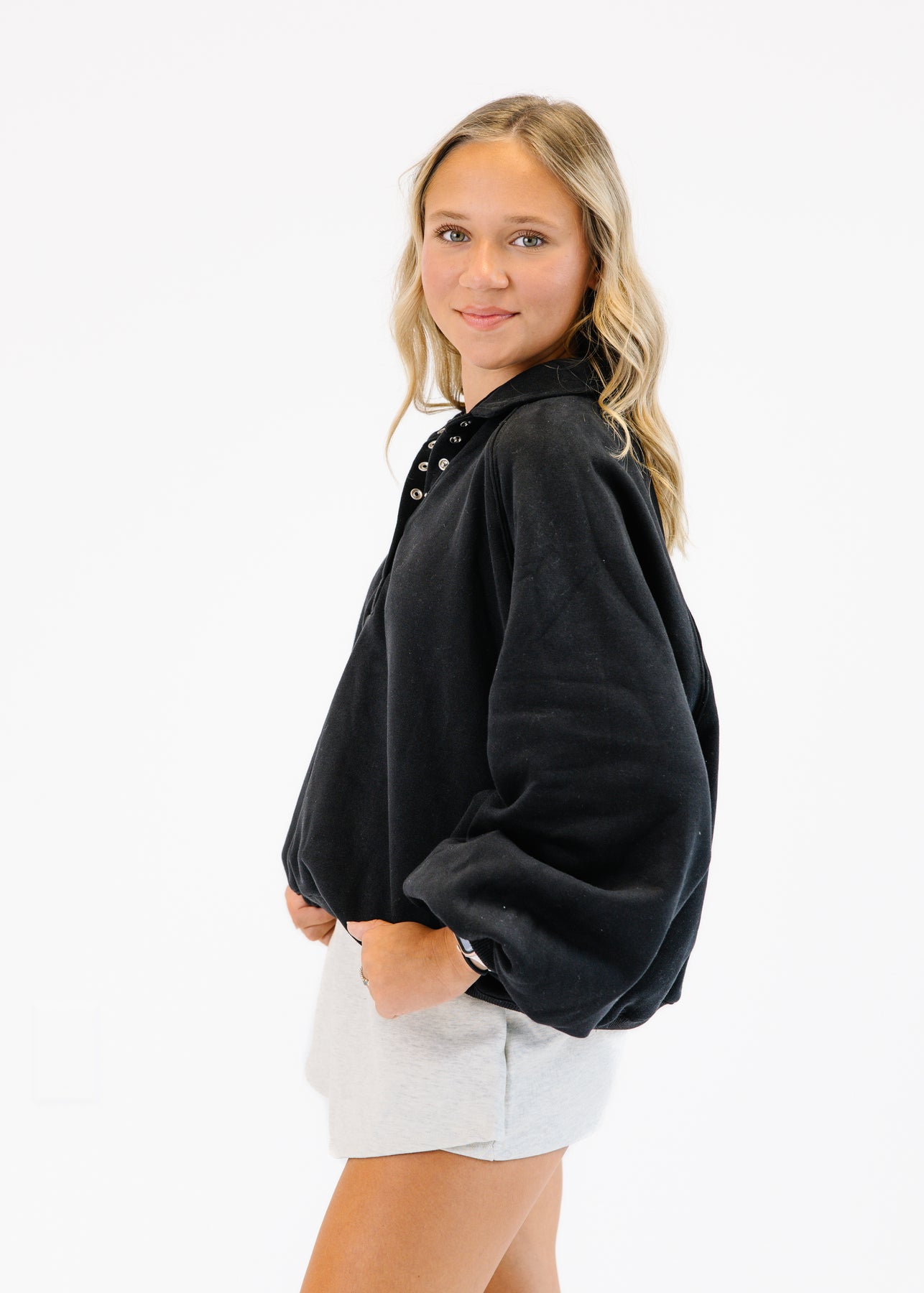 Stay cozy and stylish with this snap collar sweatshirt featuring a relaxed fit and dramatic balloon sleeves. The snap-button neckline adds a sporty touch, making it perfect for layering or wearing on its own. Ideal for casual outings or lounging, this piece combines comfort with effortless streetwear vibes.