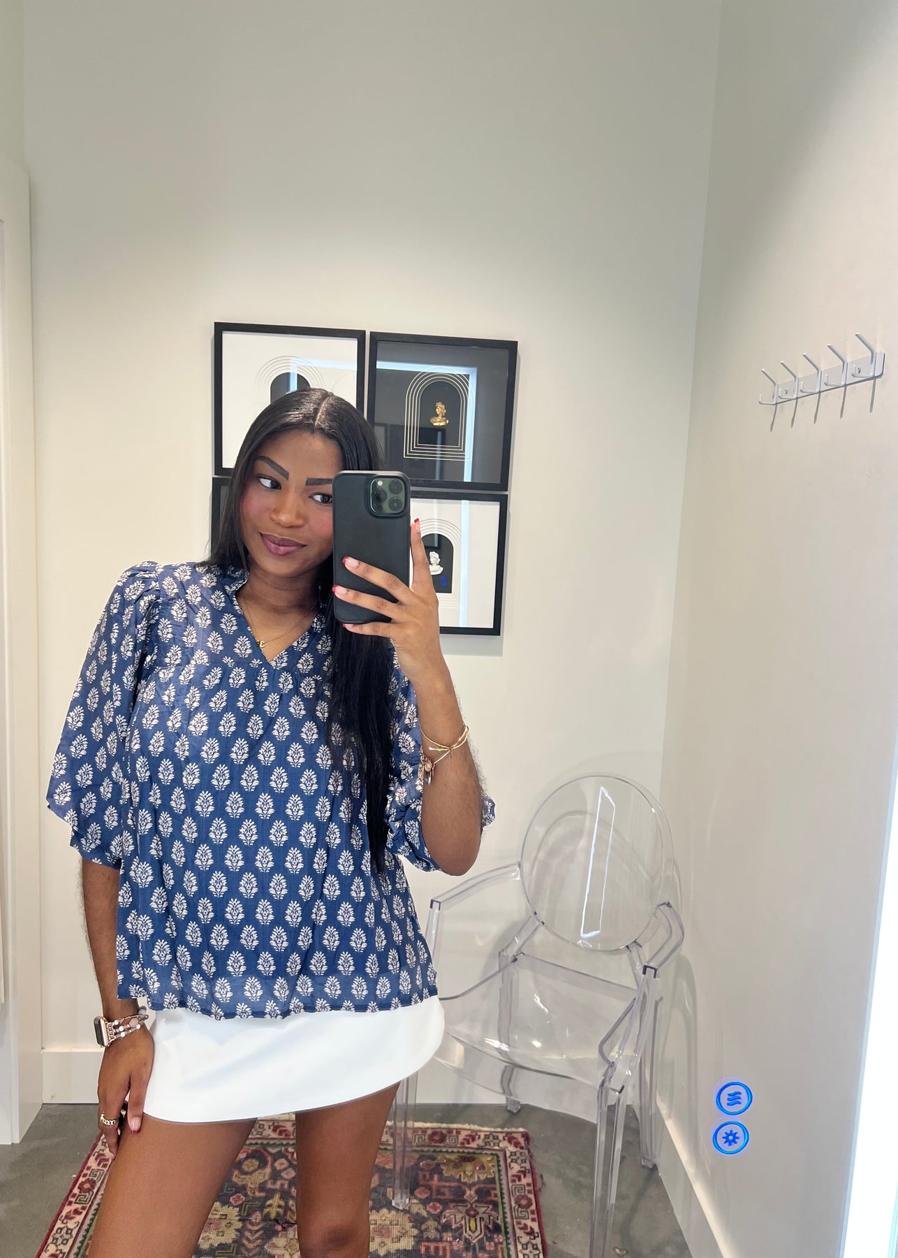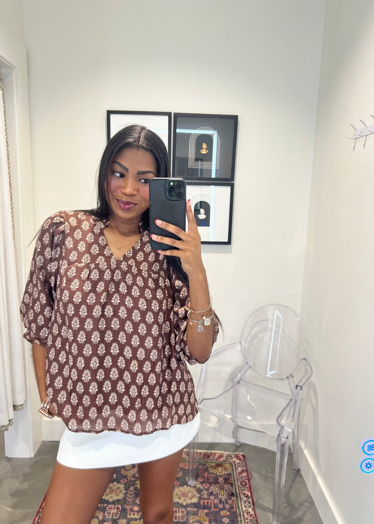 Regular price $ 48.00The Nadine Boho Printed Blouse is made for days when you want comfort without losing your sense of style. Its airy silhouette and eye-catching print make it the perfect piece to dress up or down. Pair it with white denim for a crisp look or tuck it into shorts with boots for that laid-back charm.