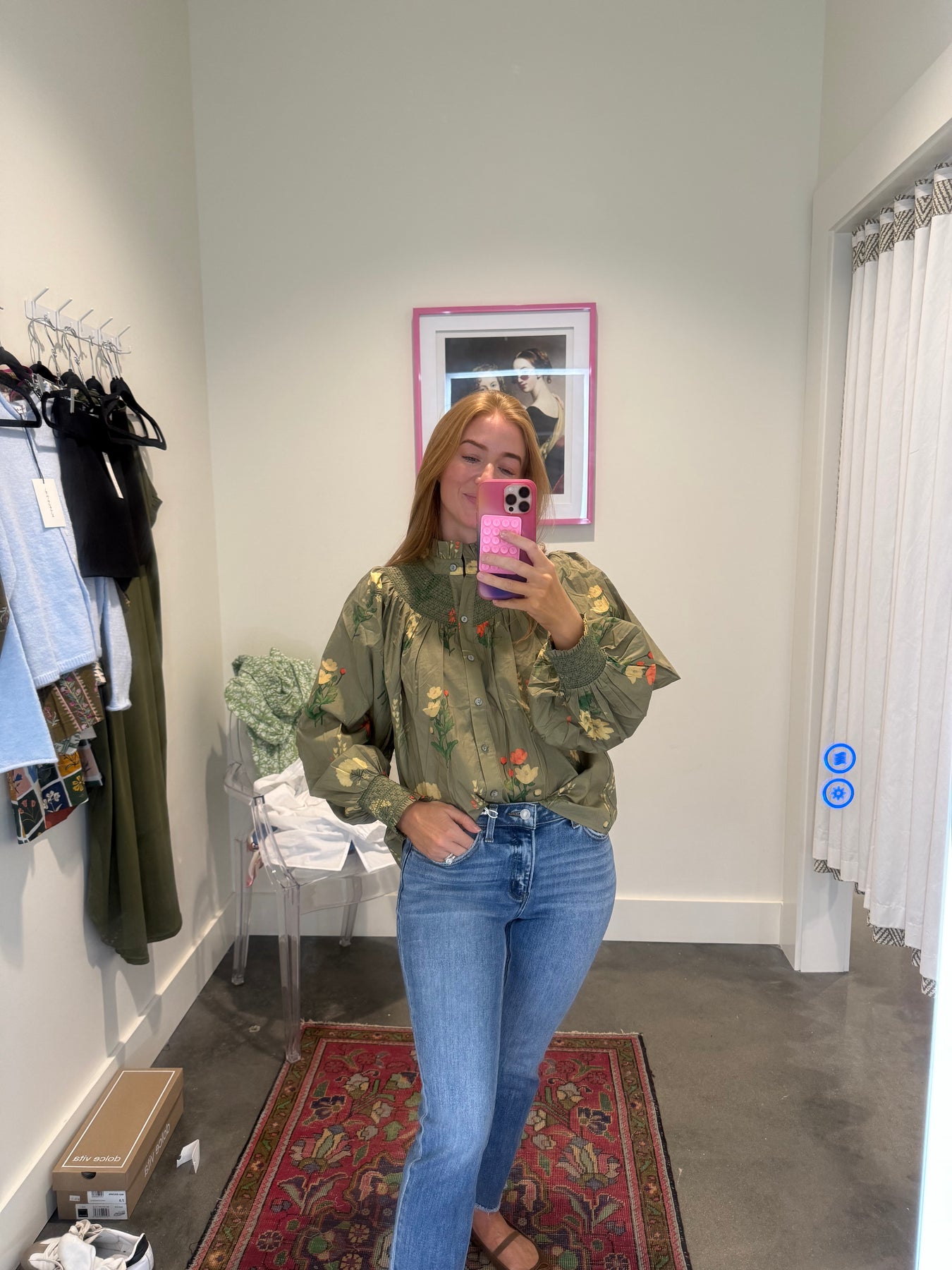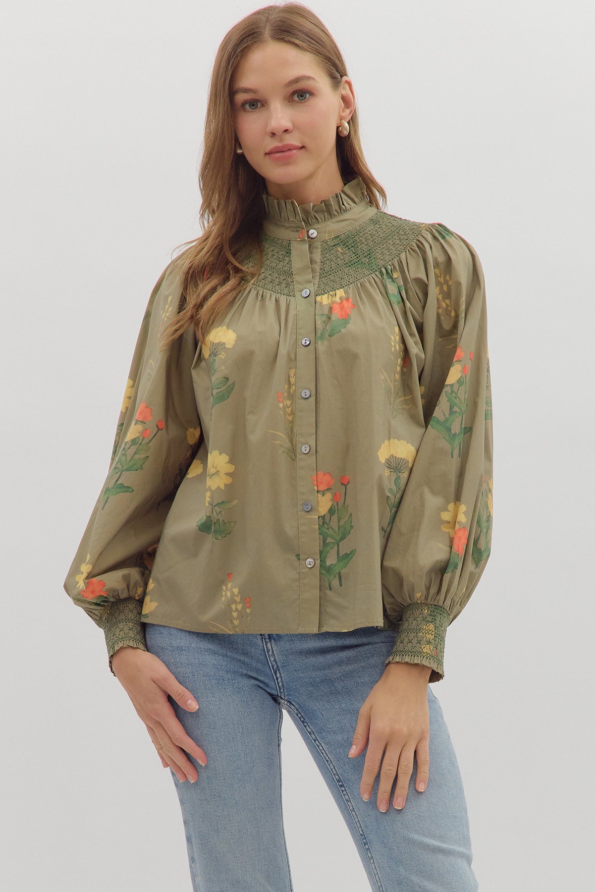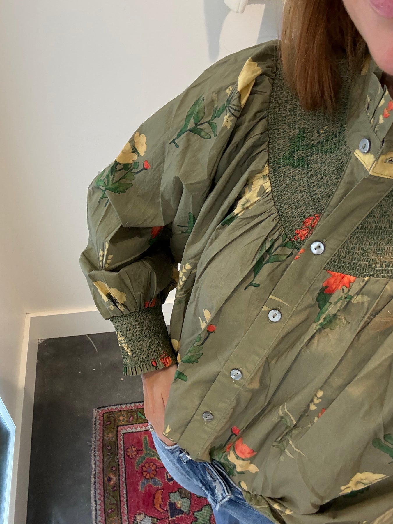 Regular price $ 62.00This blouse combines romantic details with a timeless silhouette, perfect for dressing up or down. The smocked neckline and cuffs add texture and dimension, while the button-front design brings a touch of classic elegance. Featuring voluminous sleeves for a graceful, flowing look, it offers comfort and style in equal measure.