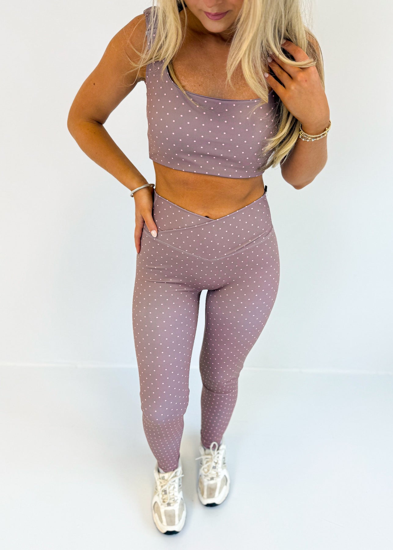 The Alanna Polka Dot Leggings give your activewear rotation a playful update. With an all-over dotted print and a flattering V-cut waistband, these leggings blend style with function. The stretchy fabric keeps you supported through every move, making them perfect for workouts or casual wear.