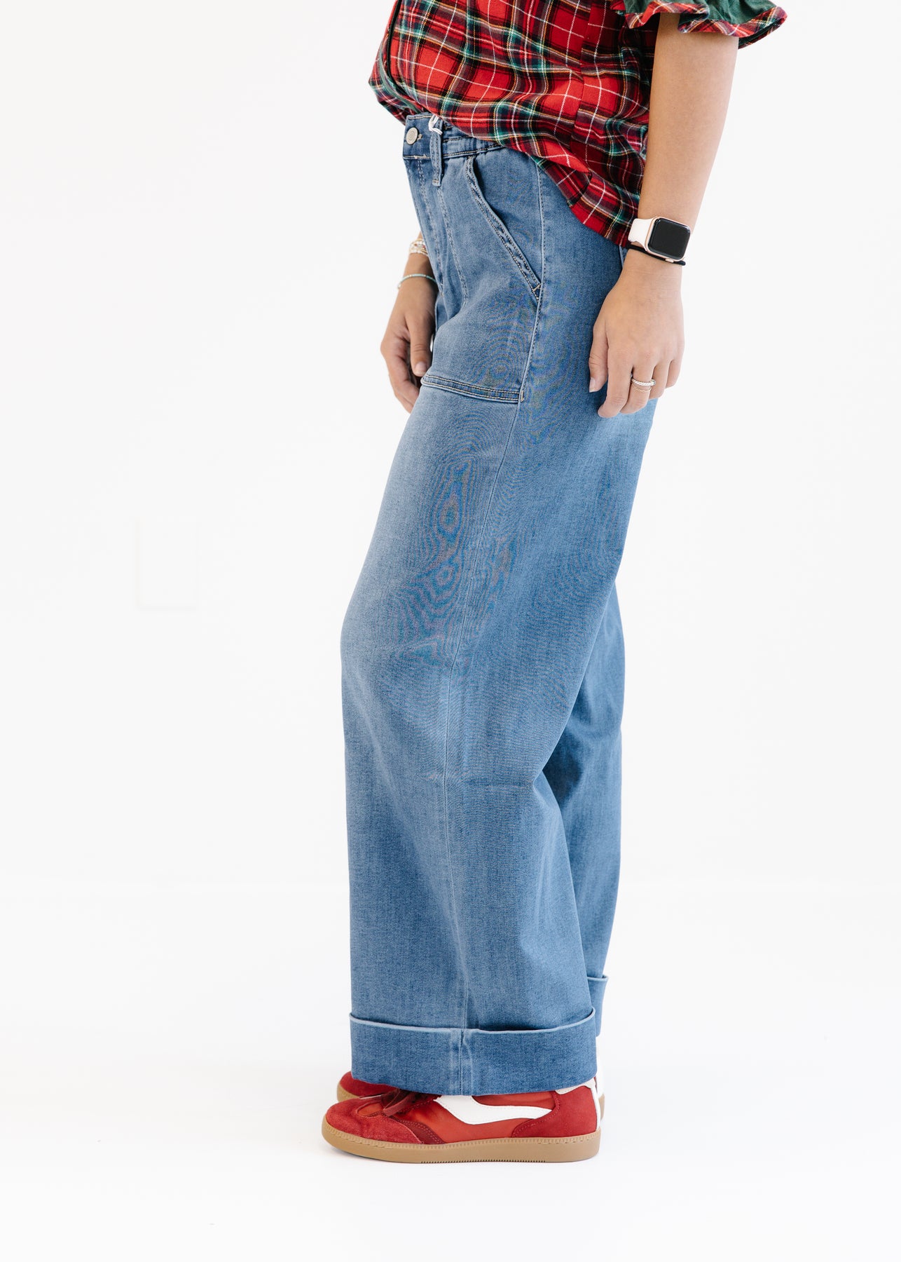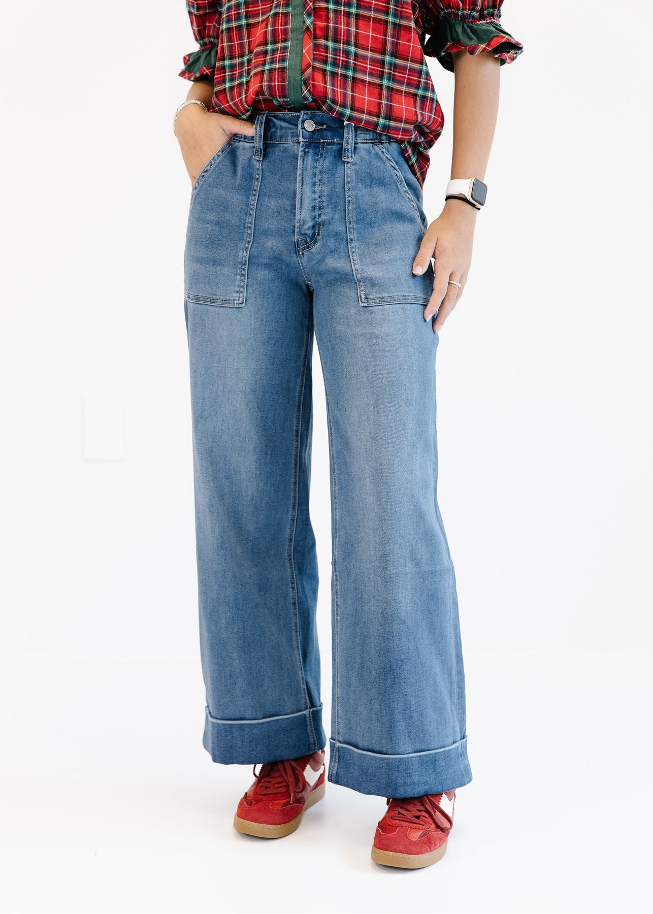 The Clementine Wide Leg Jeans combine a relaxed silhouette with utilitarian-inspired details. Featuring oversized front patch pockets and a comfortable high-rise fit, these jeans bring a touch of vintage charm to modern denim styling. The wide leg cut offers ease of movement, while the cuffed hem adds a polished finish. Designed in a versatile medium wash, they’re perfect for casual days, weekend outings, or laid-back office looks. Pair them with a tucked-in tee or a crisp button-down for an effortlessly put-together vibe.