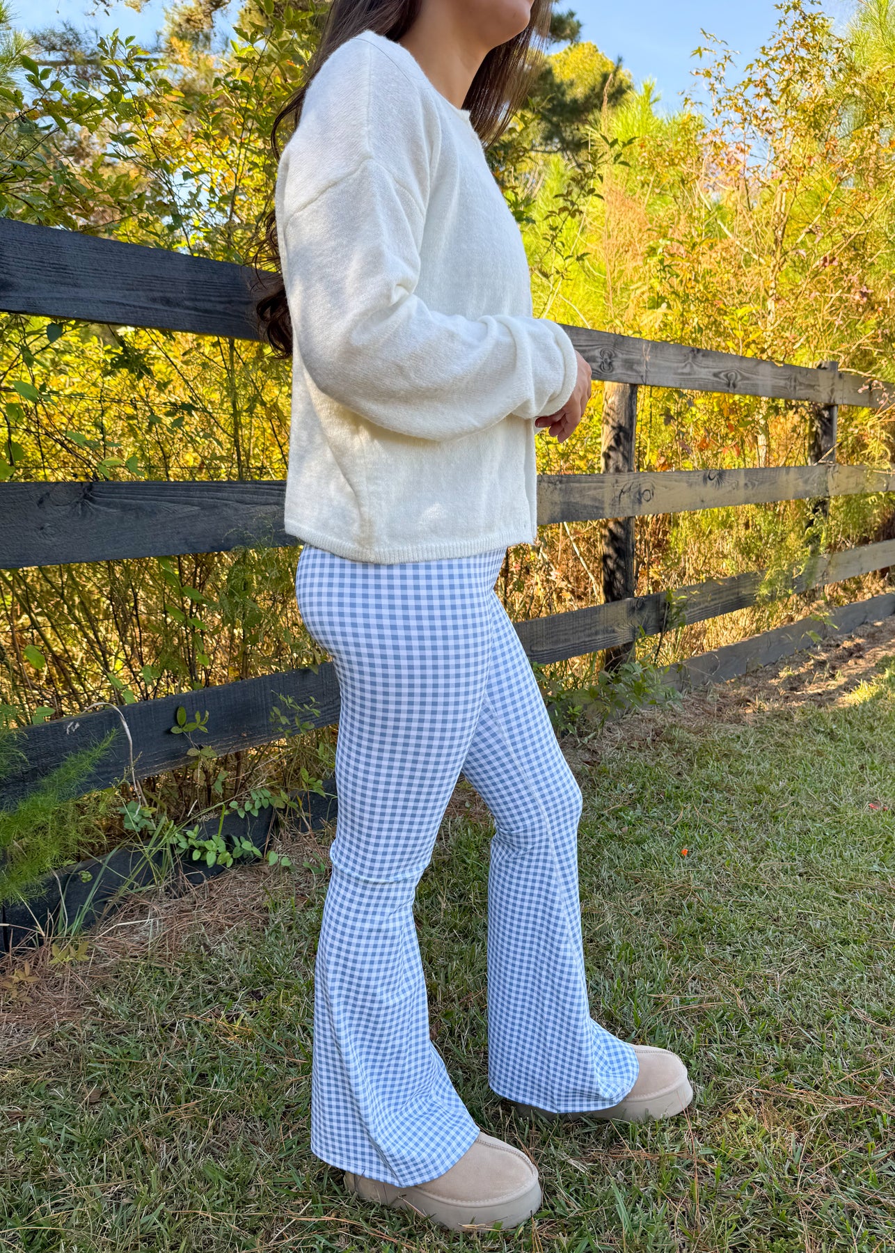 The Giselle Flare Pants put a modern spin on a retro-inspired favorite. Designed with a flattering V-cut waistband and flared legs, they elongate the silhouette while keeping things playful with an all-over gingham print. Made from a stretchy, comfortable fabric, these pants move with you from casual days to standout nights.