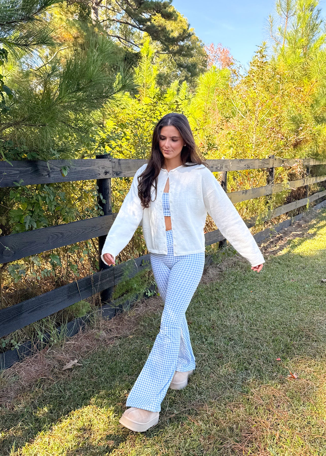 Model is wearing a size small. Paired with our Gingham Print Ruched Bra Top.