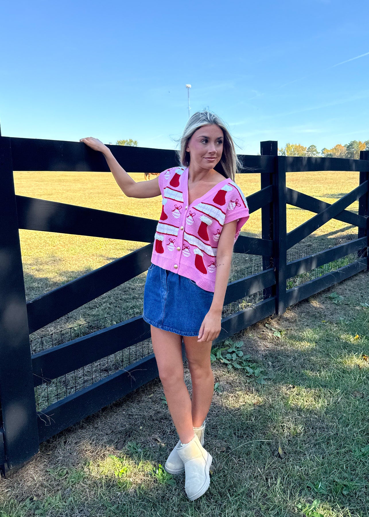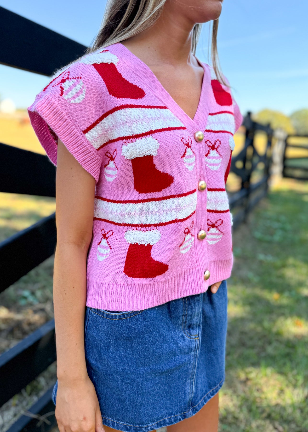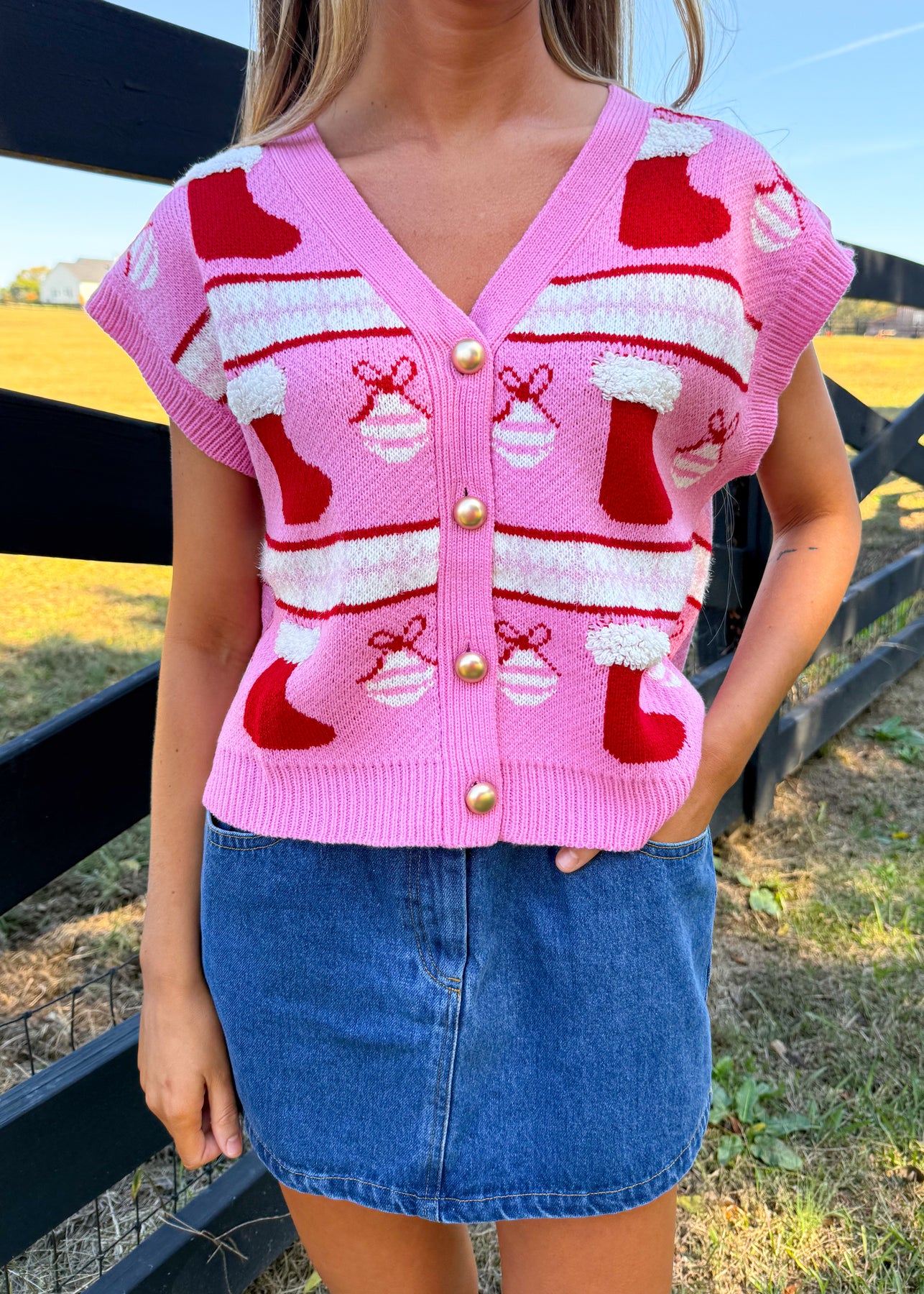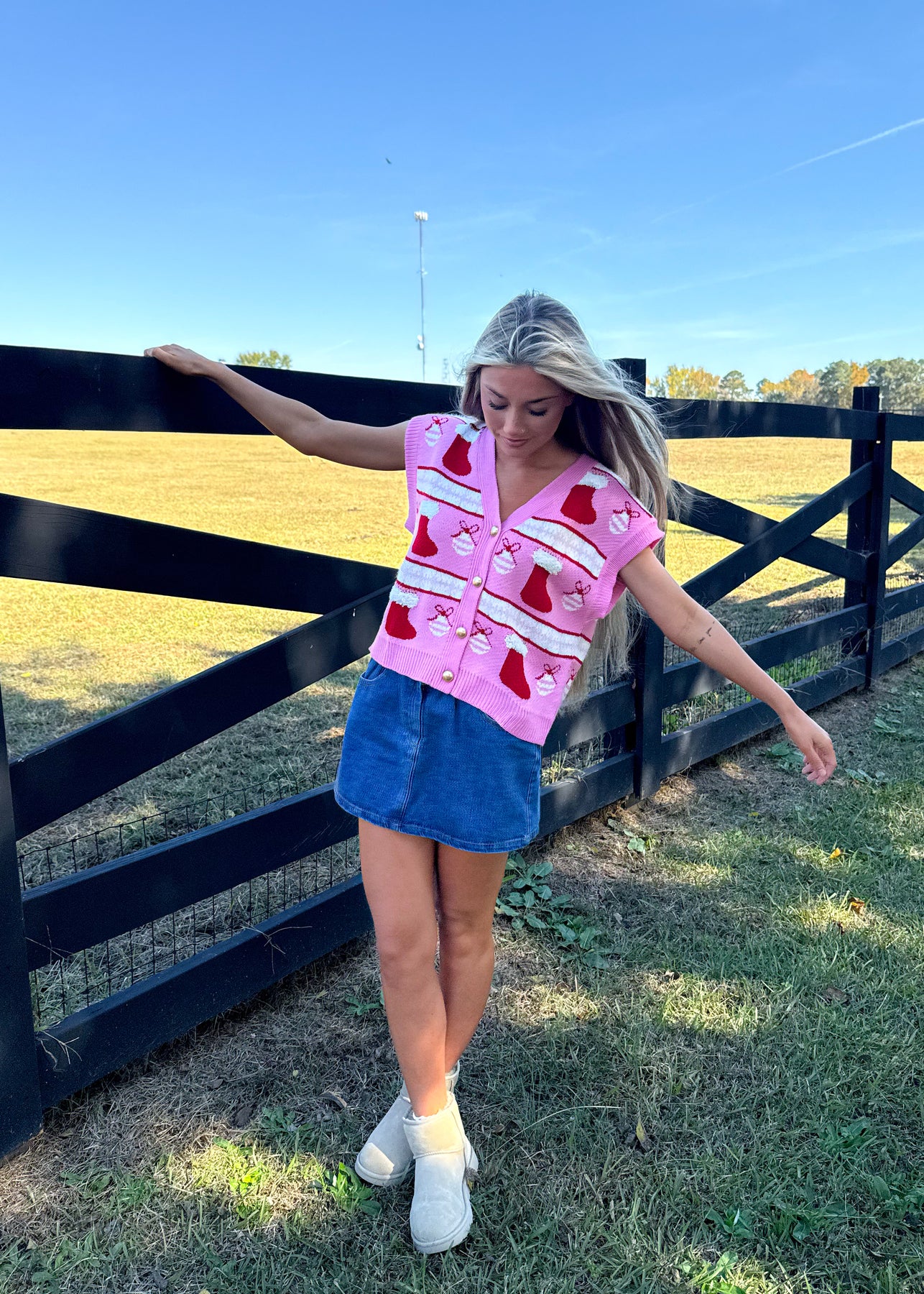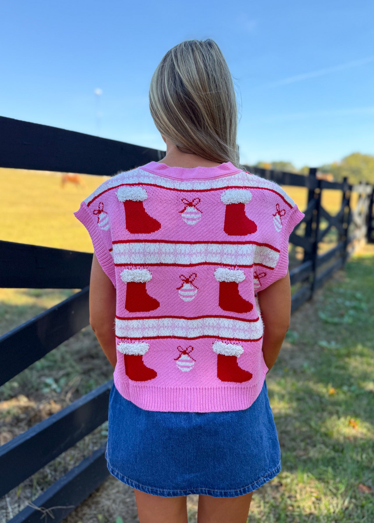 Get into the holiday spirit with the Christmas Knit Sweater Vest — the perfect blend of cozy and playful charm. Designed with a cheerful Christmas-inspired pattern of stockings and ornaments, this sleeveless knit brings instant joy to your winter wardrobe. The button-down front adds a classic touch, while the soft, comfortable fit keeps it easy to layer over your favorite tees or blouses.