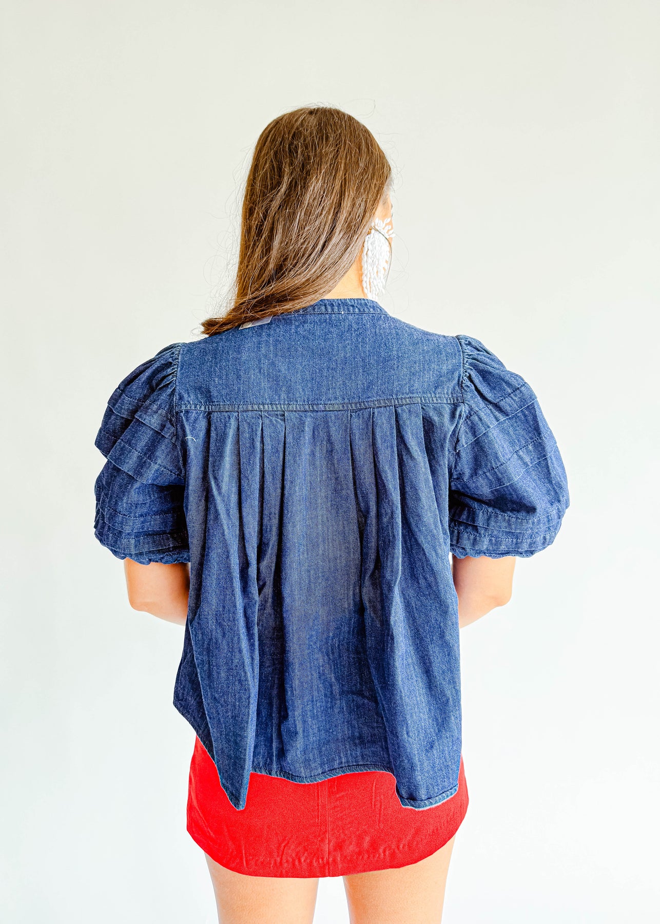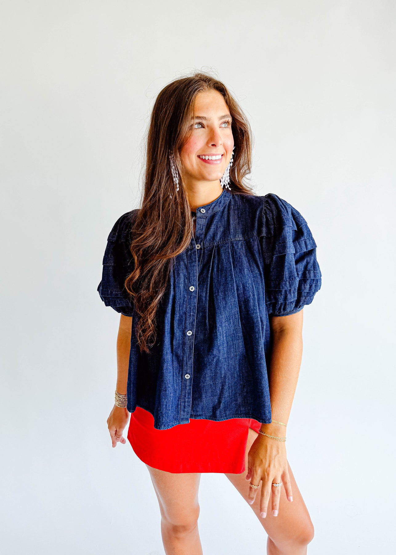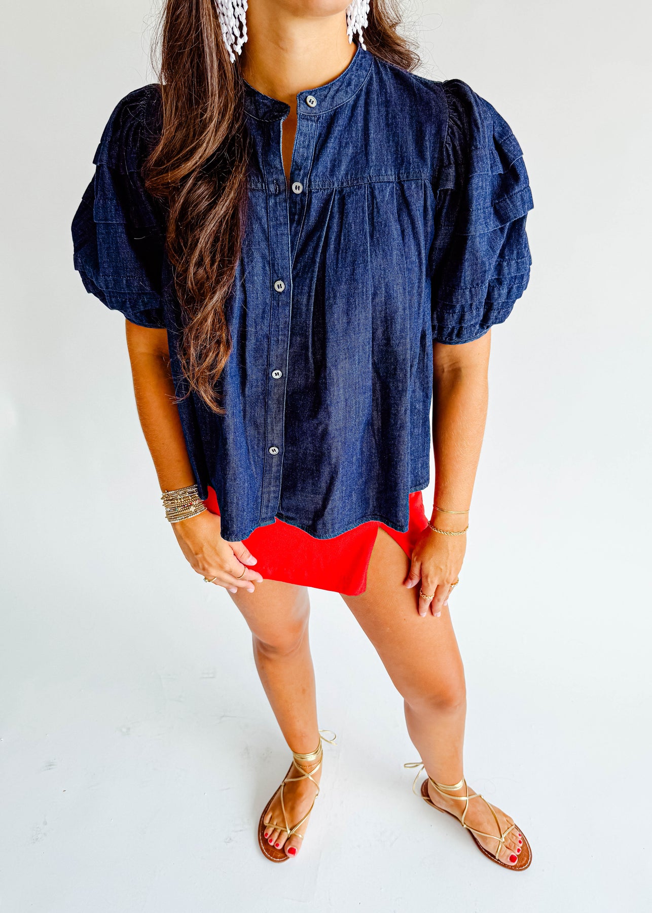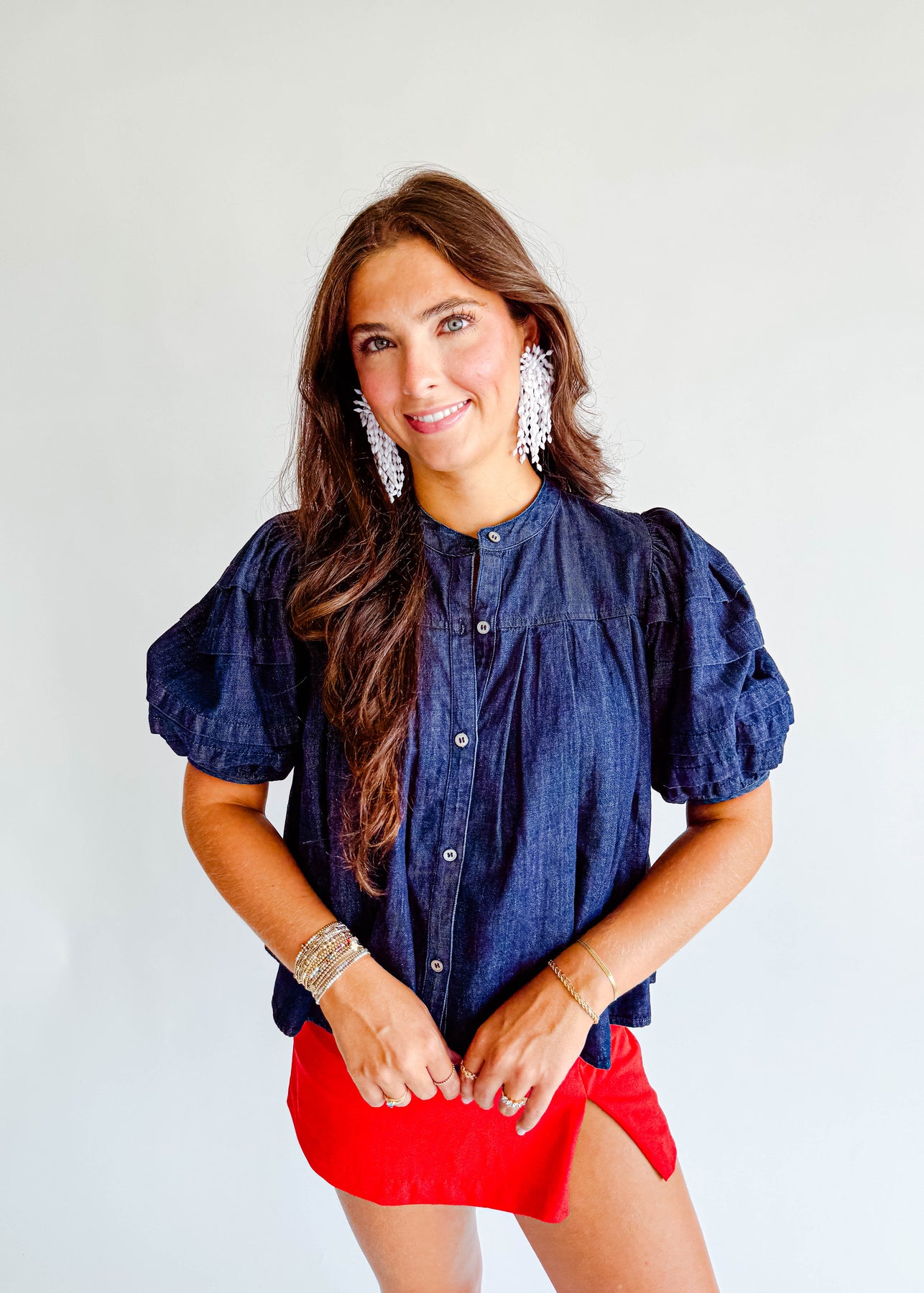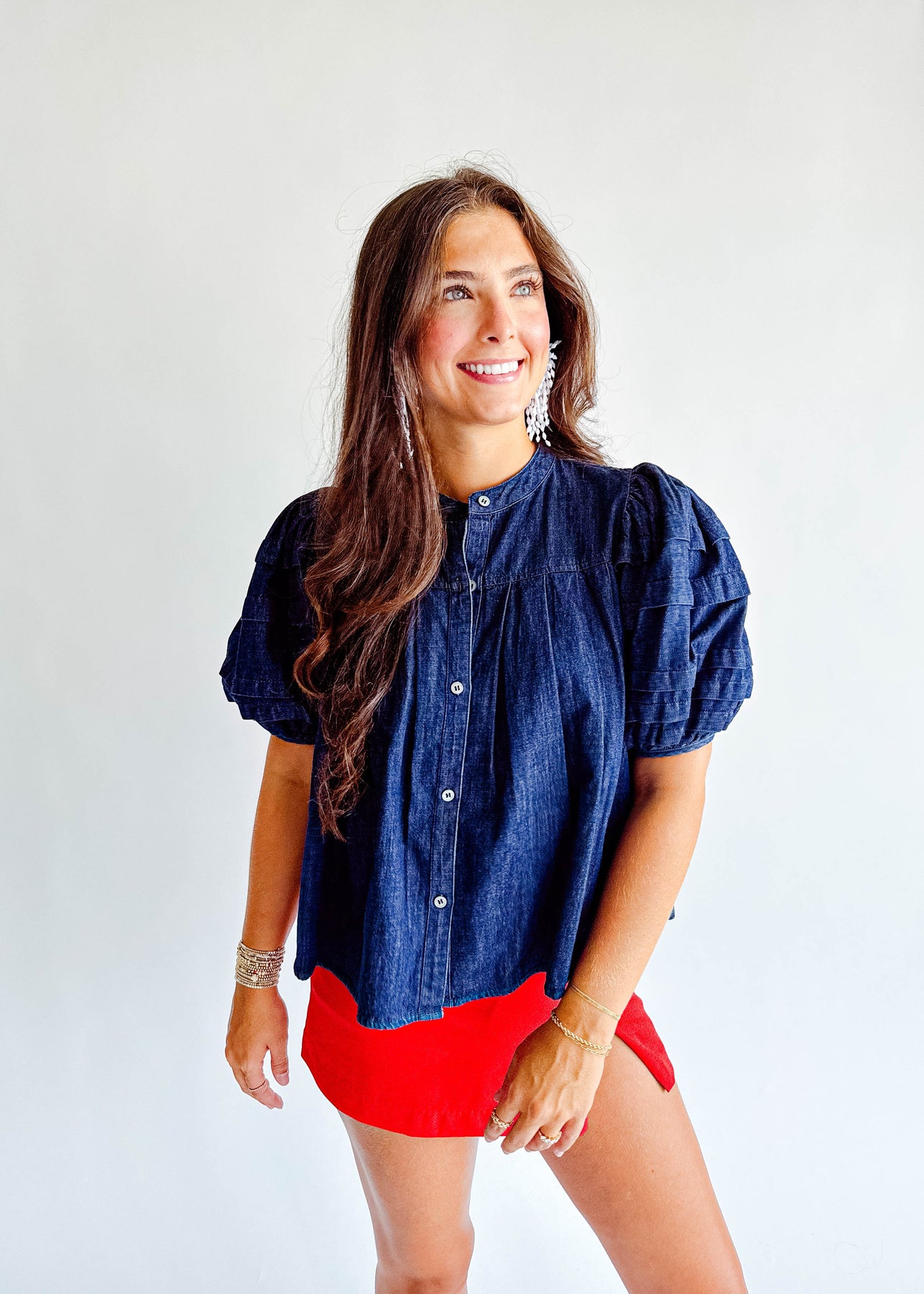 Grace Denim Top gives a fresh update to a timeless fabric. With structured tiered sleeves and a relaxed button-front design, it blends a polished look with everyday ease. Perfect for pairing with shorts, skirts, or trousers, this versatile piece transitions effortlessly from casual weekends to chic weekday outings.