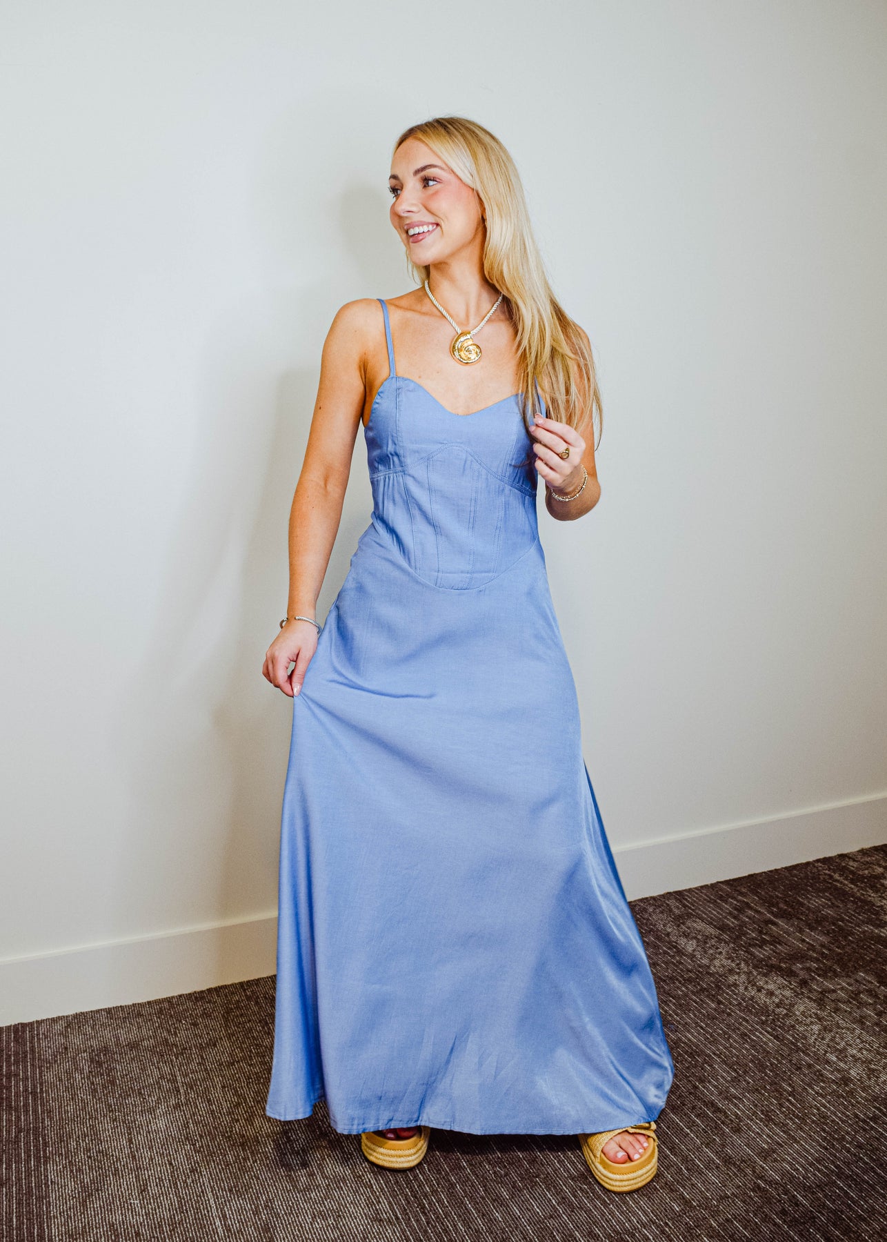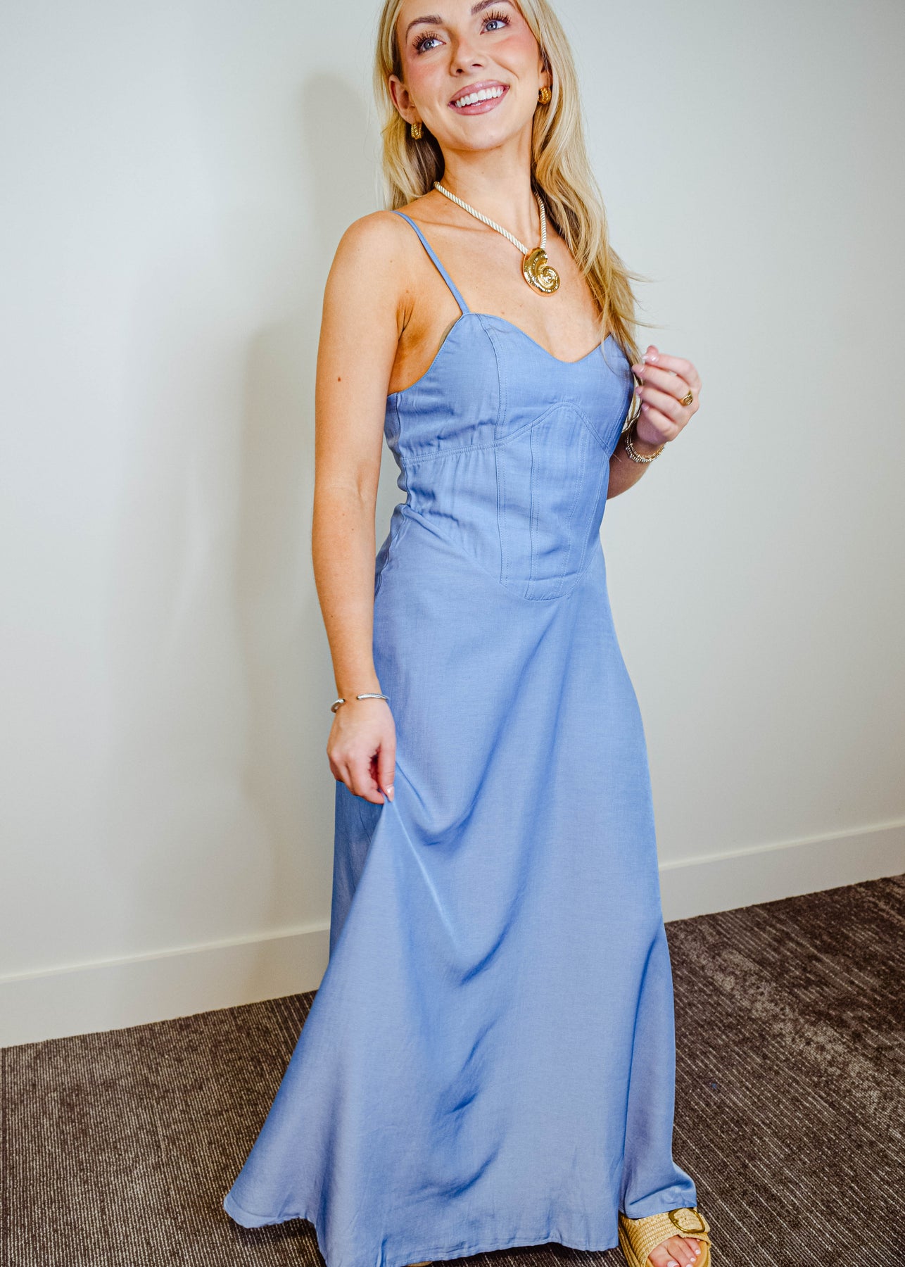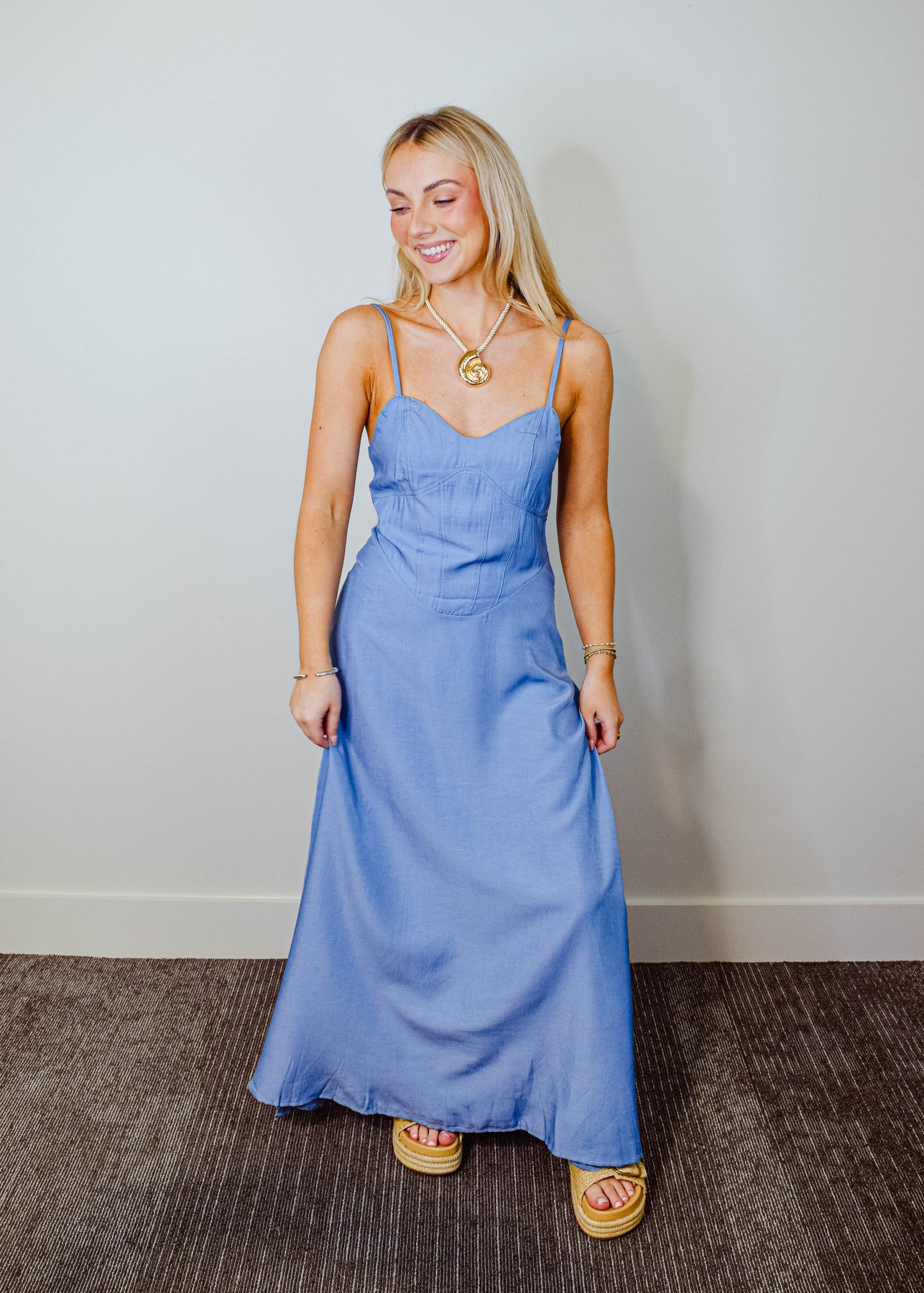 Effortlessly chic and made for sunlit days, this denim maxi dress features slim spaghetti straps and a flattering sweetheart neckline. The structured bodice highlights your silhouette, while the full-length skirt flows with ease. Crafted from soft, medium-wash denim, it strikes the perfect balance between casual and elevated. Pair it with sandals or boots for a versatile look that moves from day to night with ease.