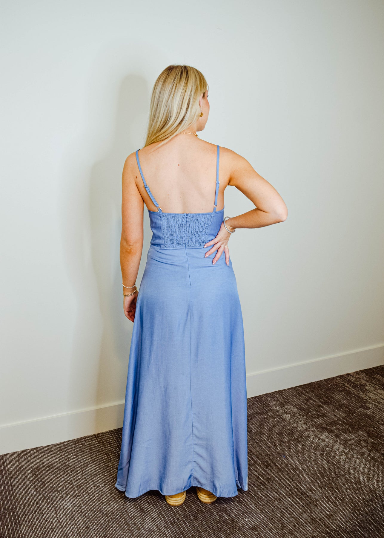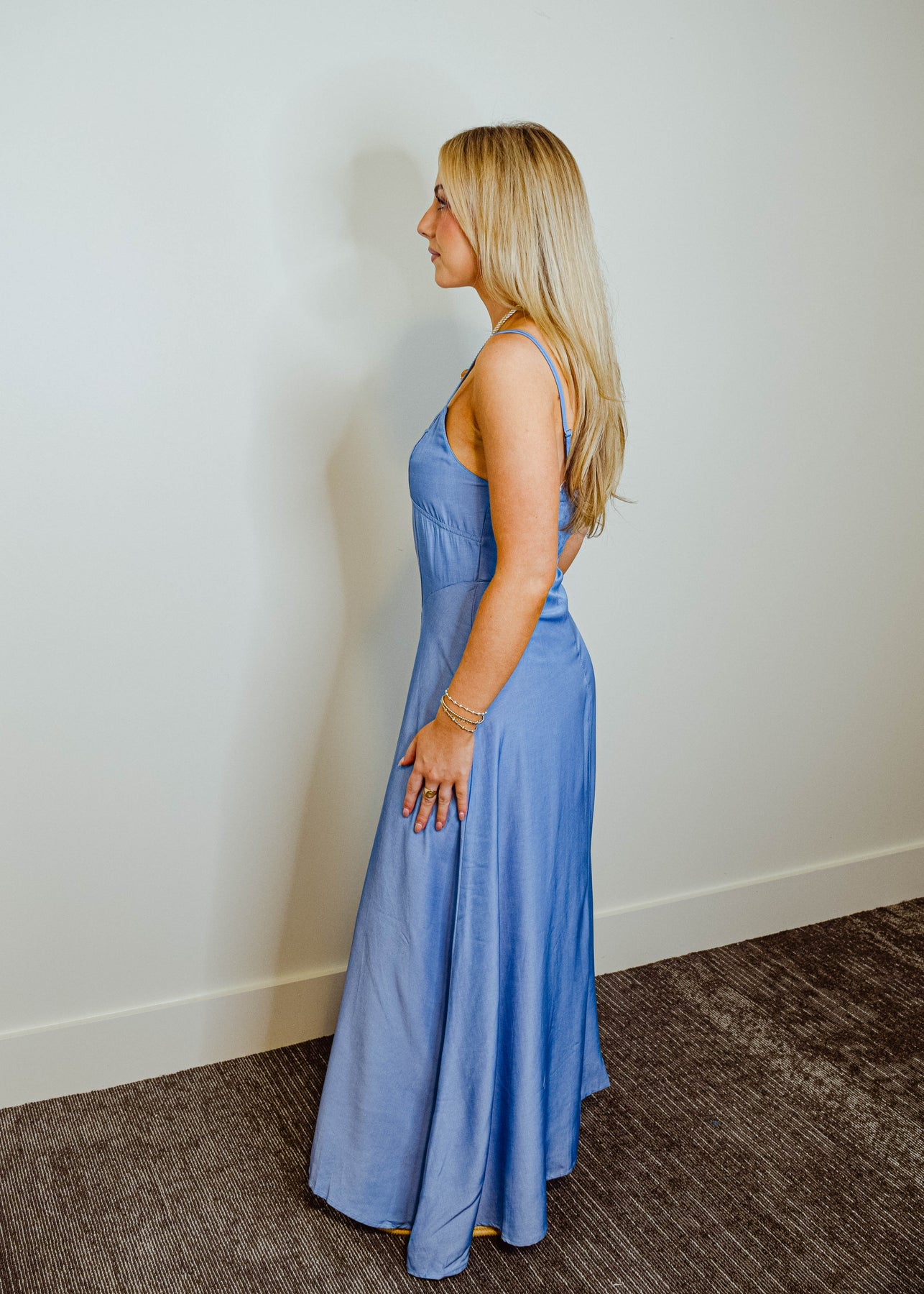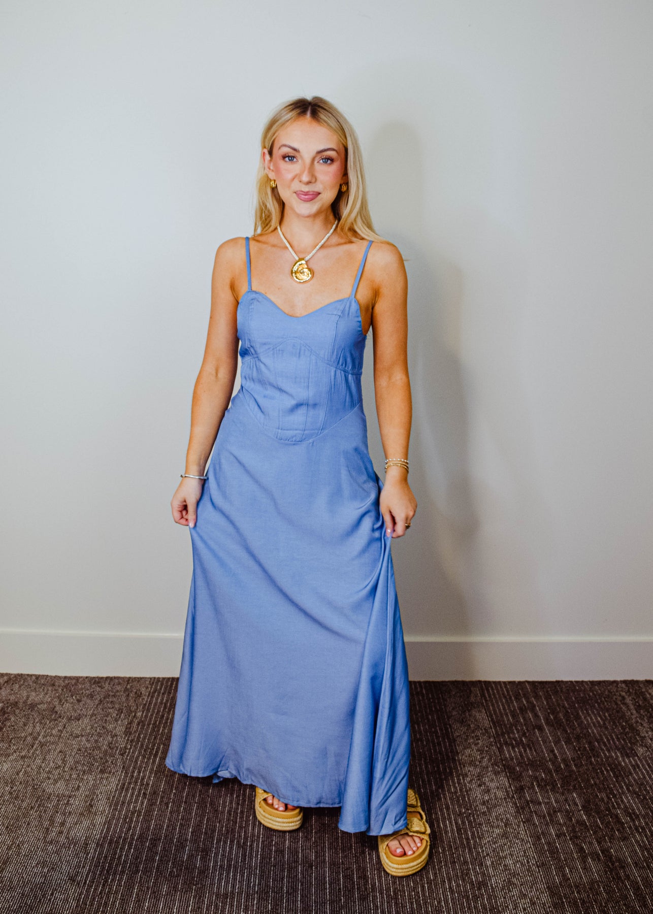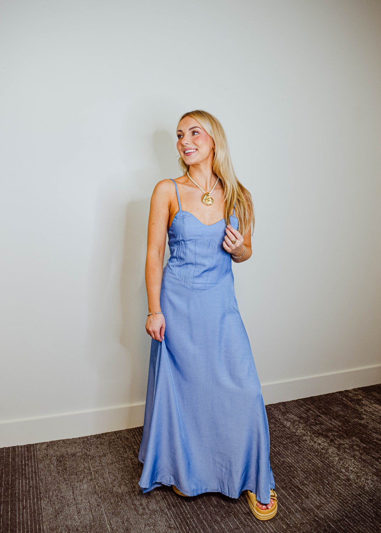 Effortlessly chic and made for sunlit days, this denim maxi dress features slim spaghetti straps and a flattering sweetheart neckline. The structured bodice highlights your silhouette, while the full-length skirt flows with ease. Crafted from soft, medium-wash denim, it strikes the perfect balance between casual and elevated. Pair it with sandals or boots for a versatile look that moves from day to night with ease.