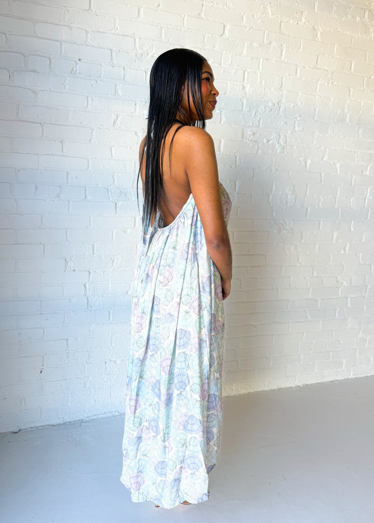 Regular price $ 76.00This flowy halter dress features an allover print with a relaxed, airy silhouette that moves beautifully with every step. Designed with a halter neckline and an open back detail, it brings a light, warm weather feel while keeping the fit easy and comfortable. The loose shape creates a flattering drape without feeling restrictive, making it perfect for vacations, casual gatherings, or sunny day outings. Style it with sandals or wedges for an effortless look that feels fresh, playful, and ready for warm weather plans.