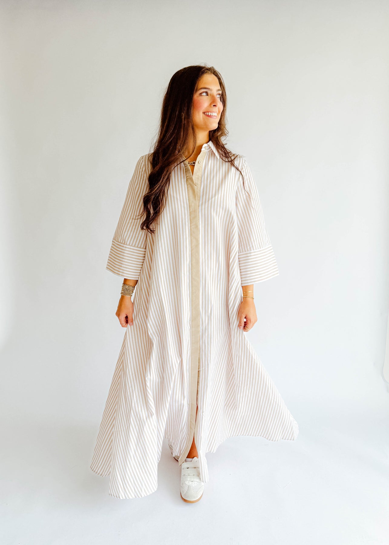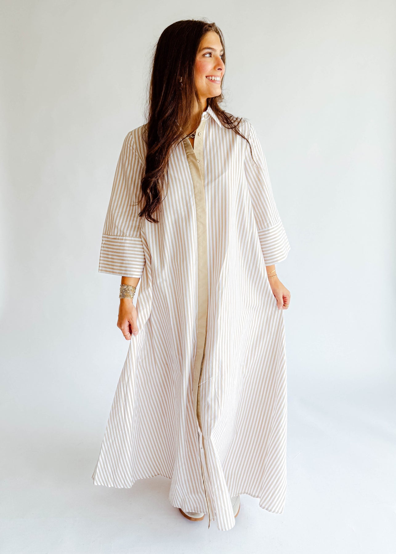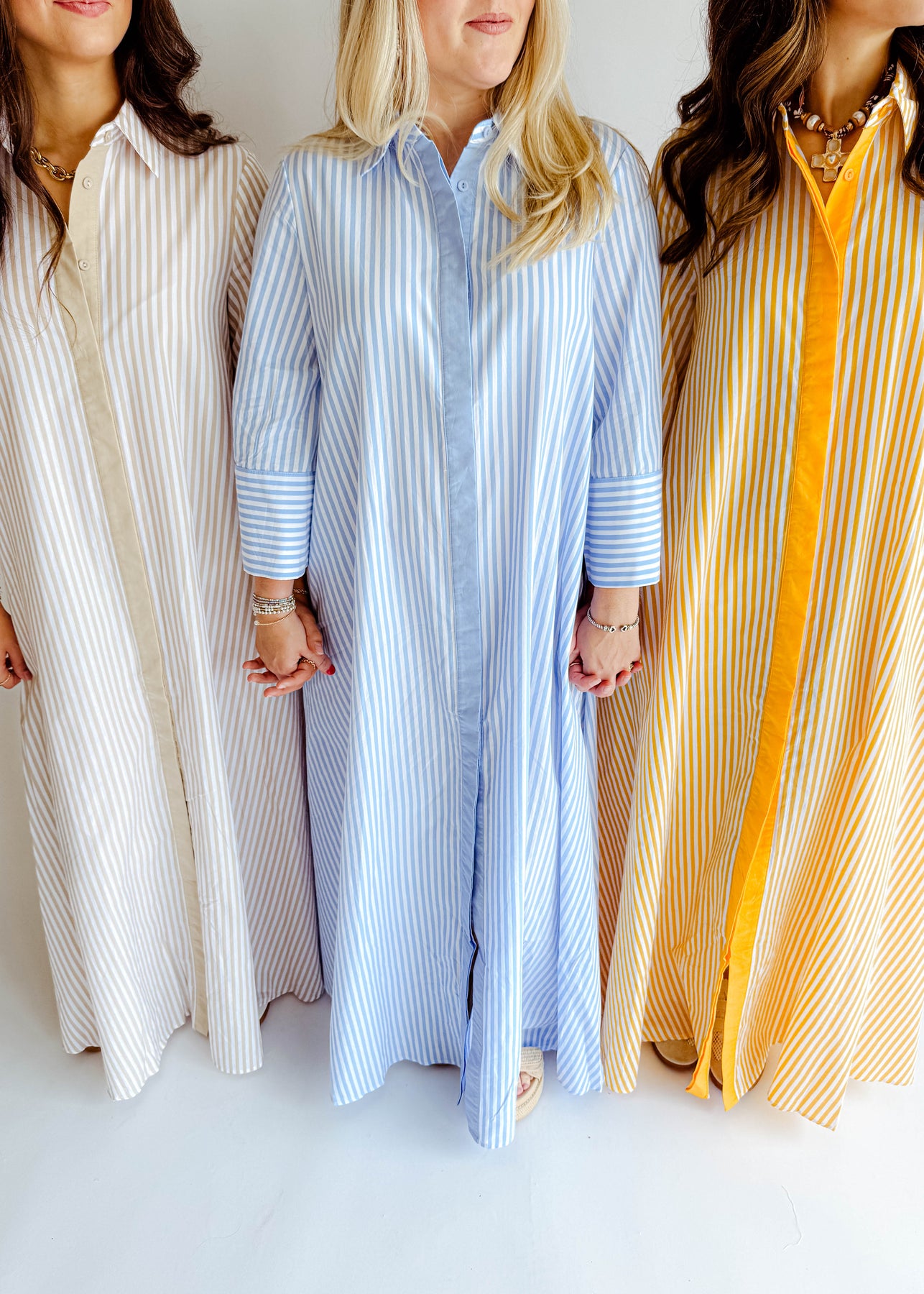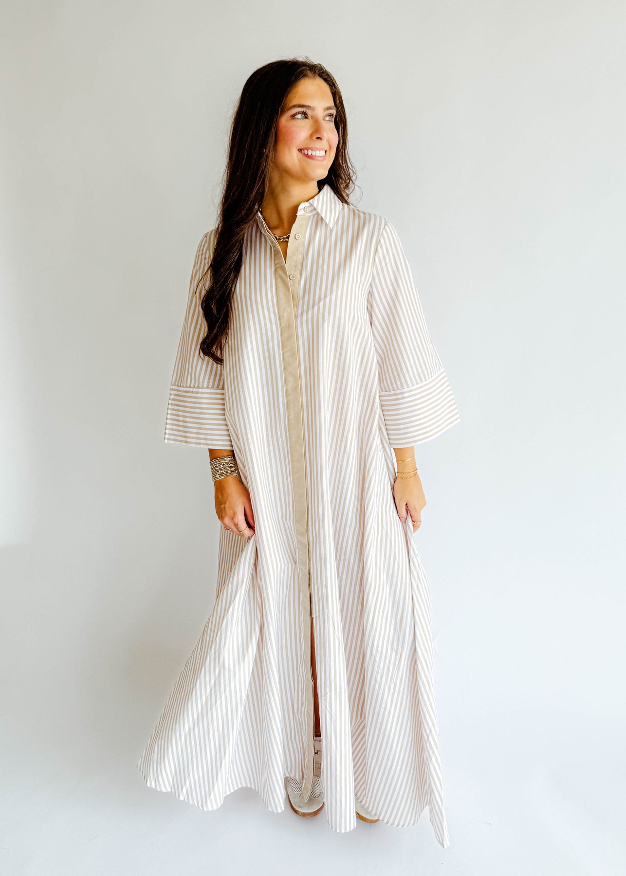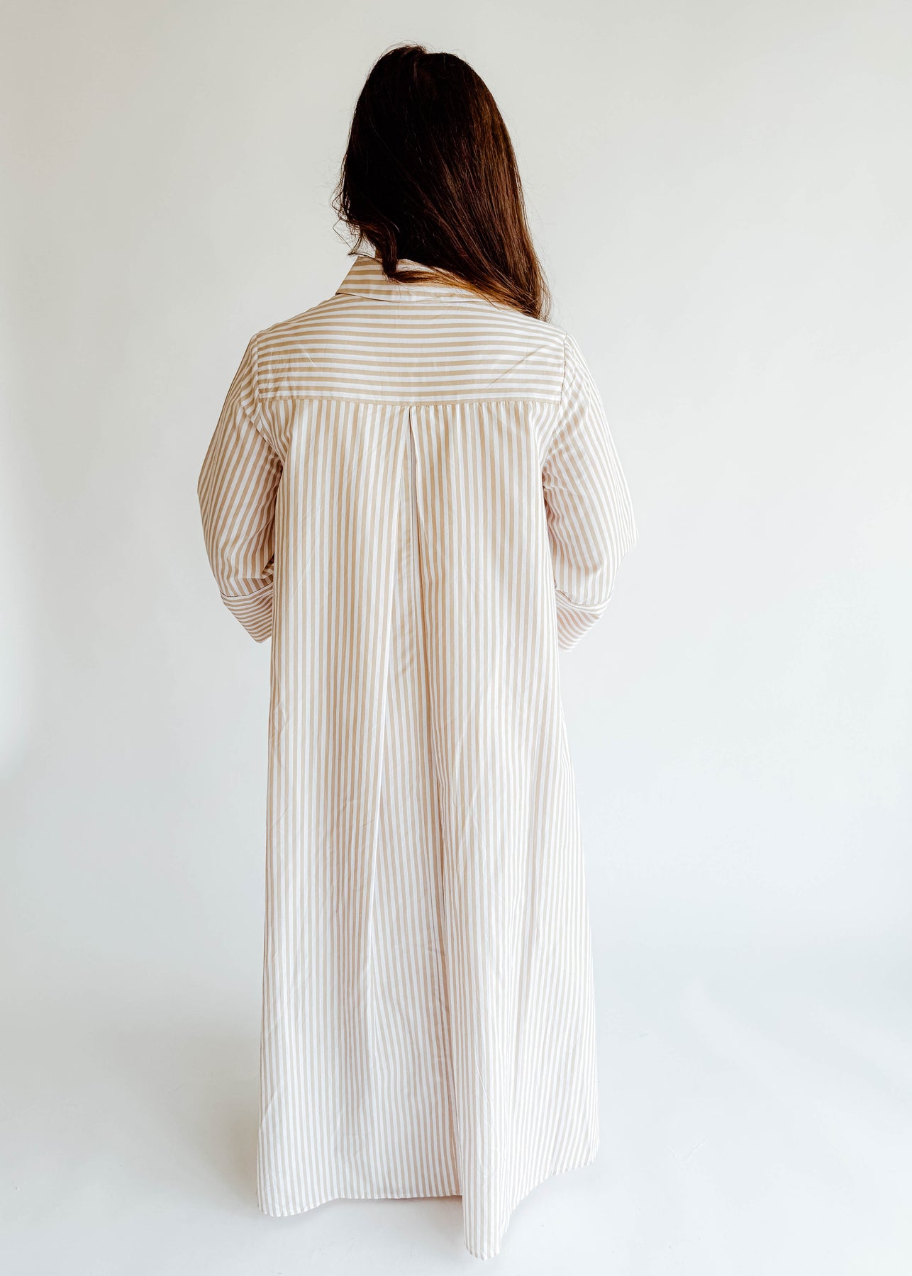 This maxi shirt dress brings a refined twist to a classic wardrobe staple. Designed with a button-down front, collared neckline, and cuffed sleeves, it combines structure with fluid movement. The elongated silhouette and subtle stripe pattern create a polished look that’s perfect for versatile styling—wear it alone for a standout moment or layered for a chic, relaxed vibe.