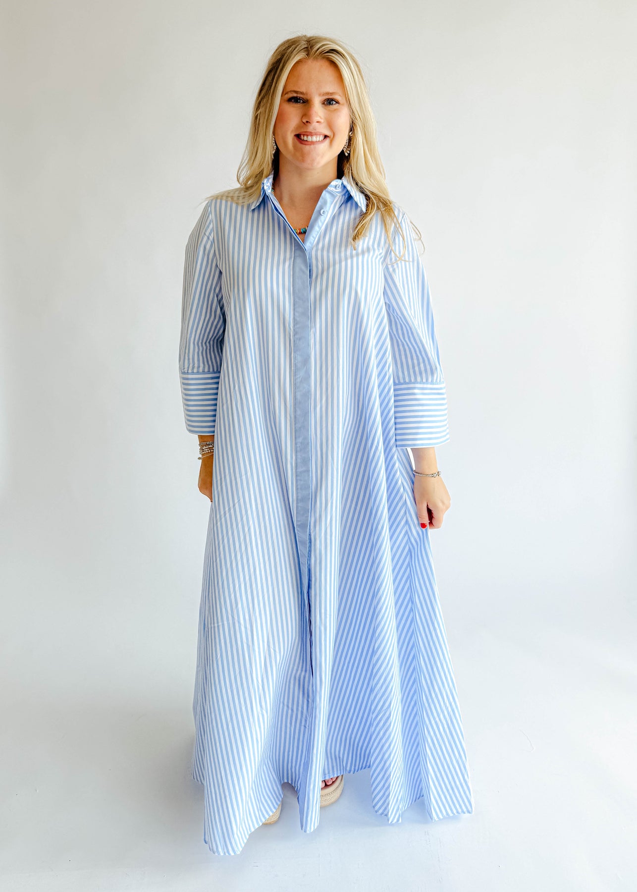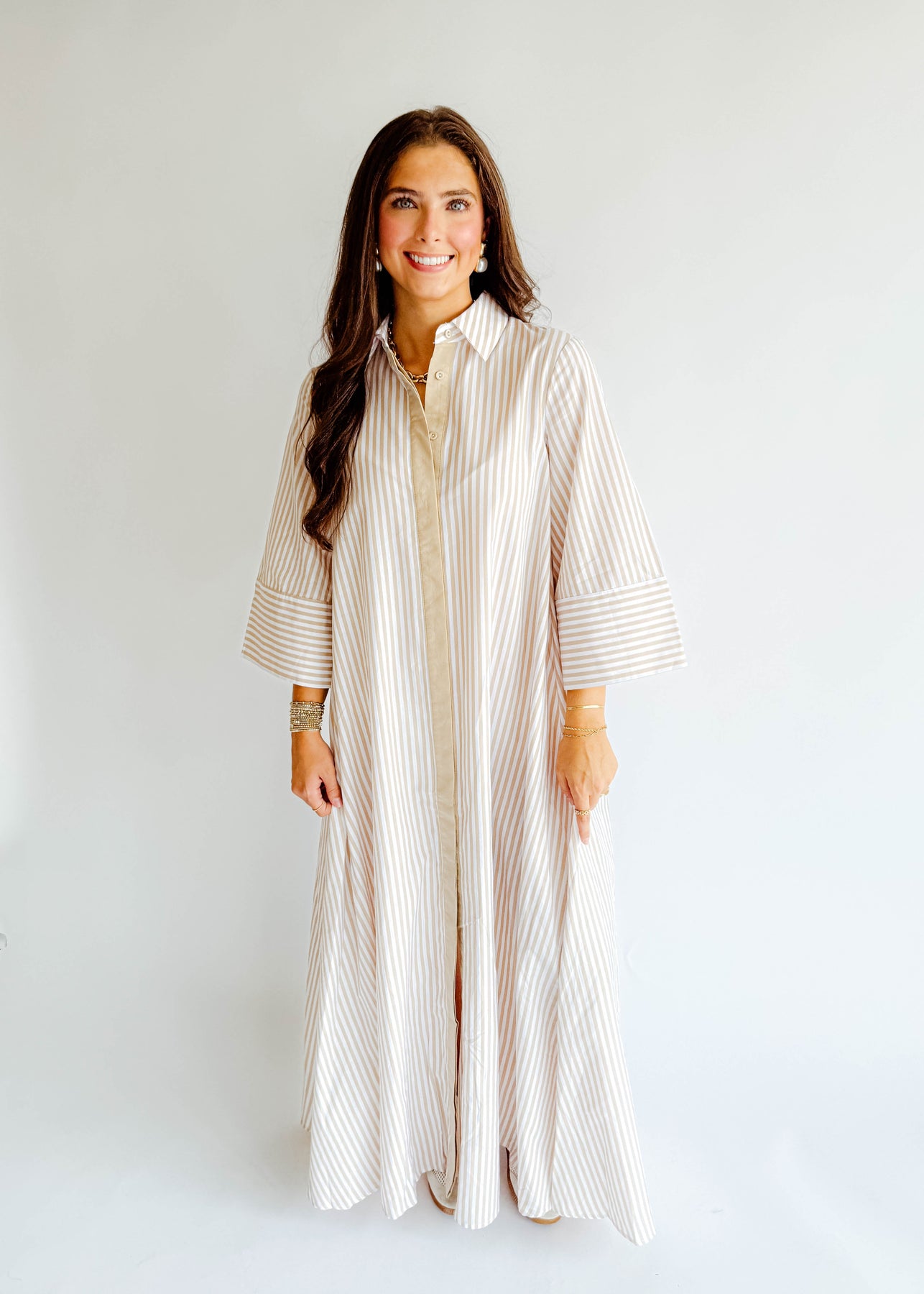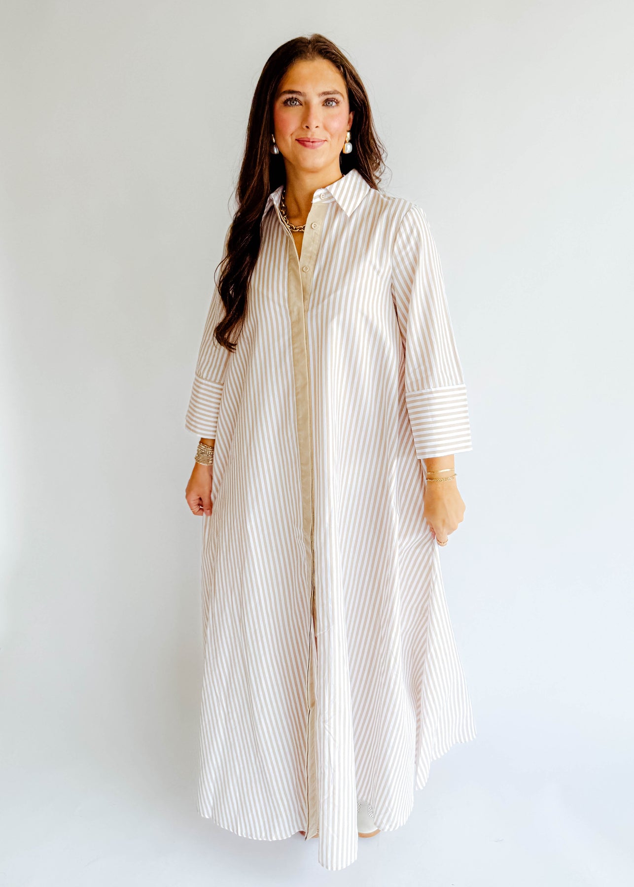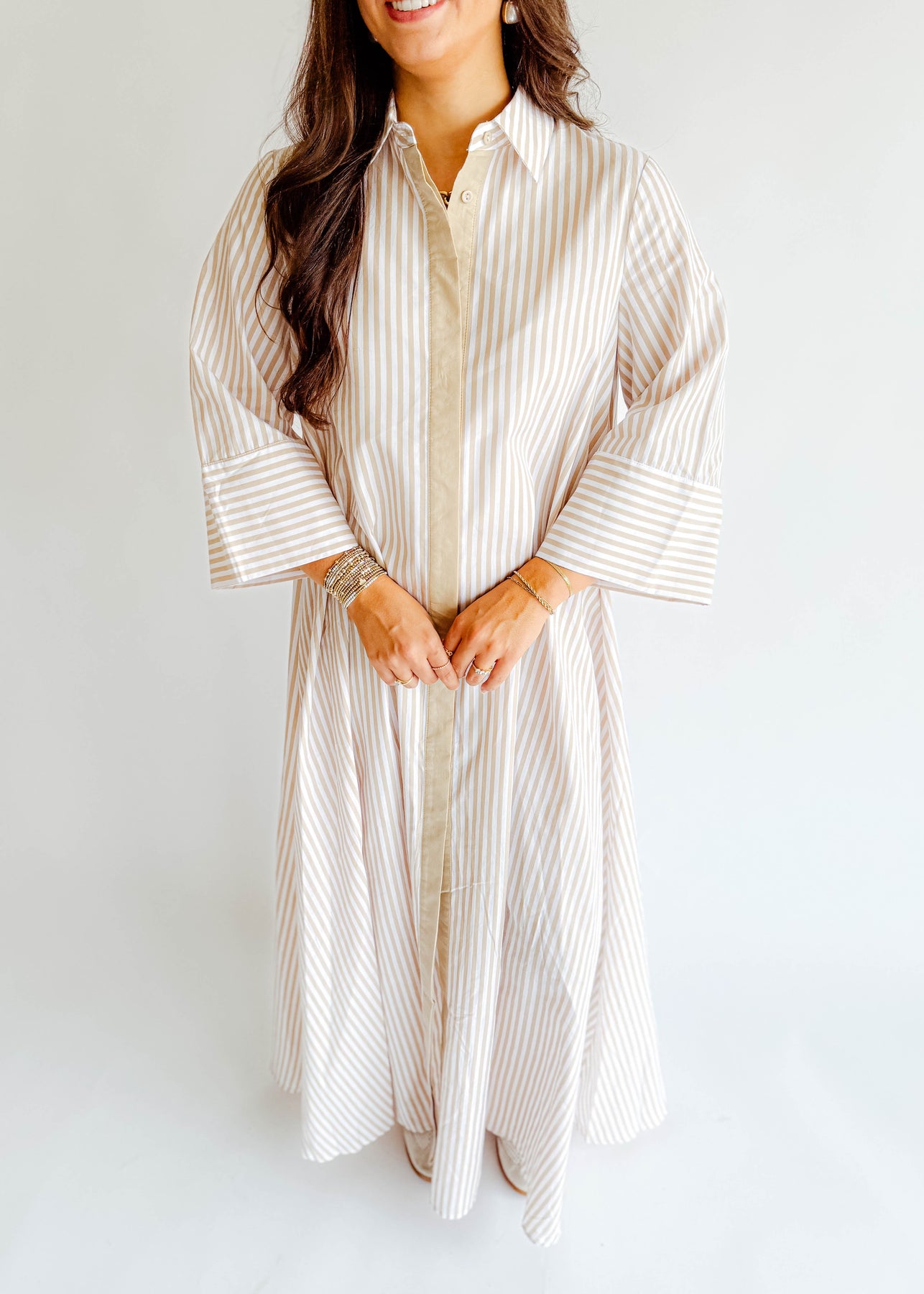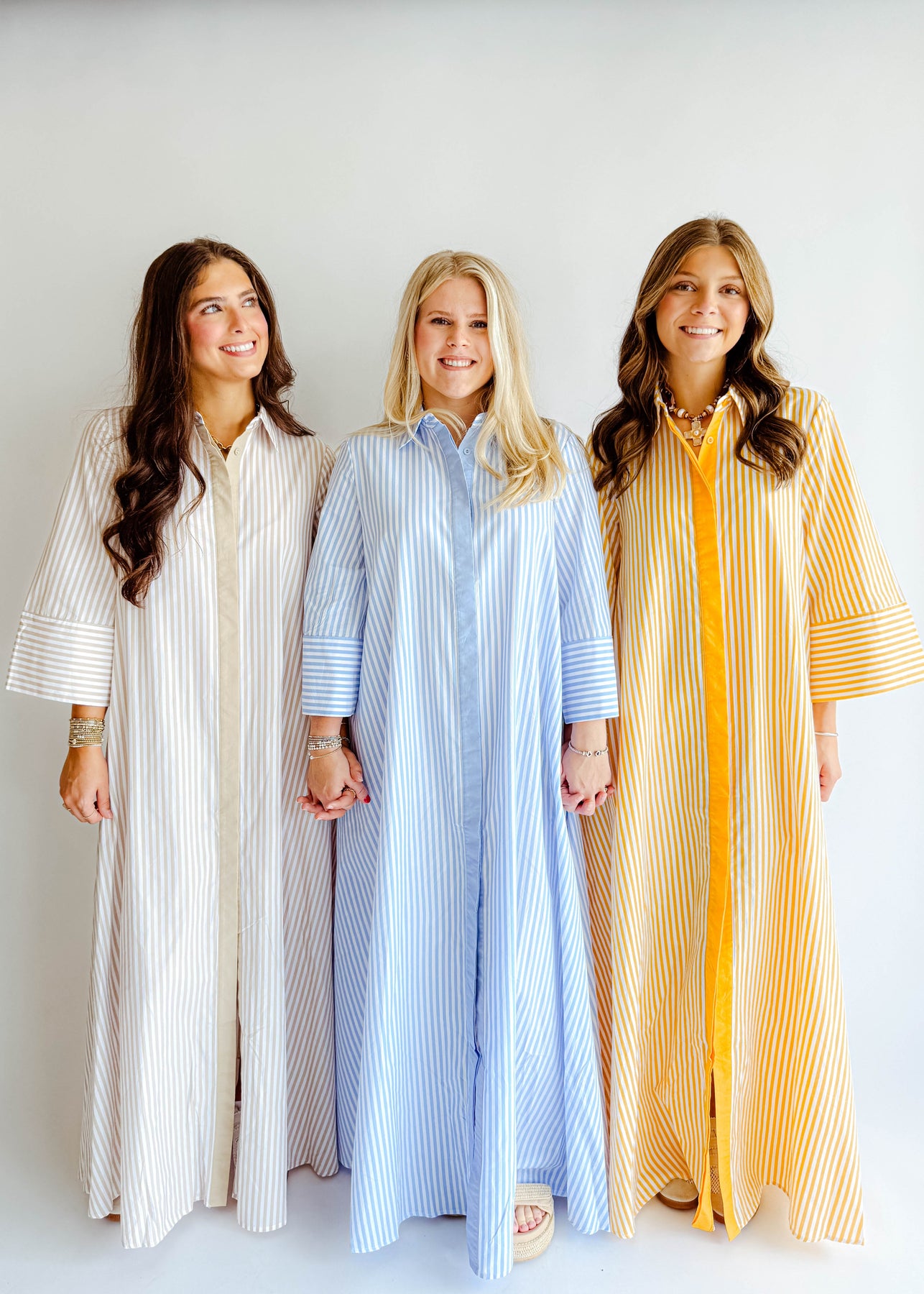 This maxi shirt dress brings a refined twist to a classic wardrobe staple. Designed with a button-down front, collared neckline, and cuffed sleeves, it combines structure with fluid movement. The elongated silhouette and subtle stripe pattern create a polished look that’s perfect for versatile styling—wear it alone for a standout moment or layered for a chic, relaxed vibe.