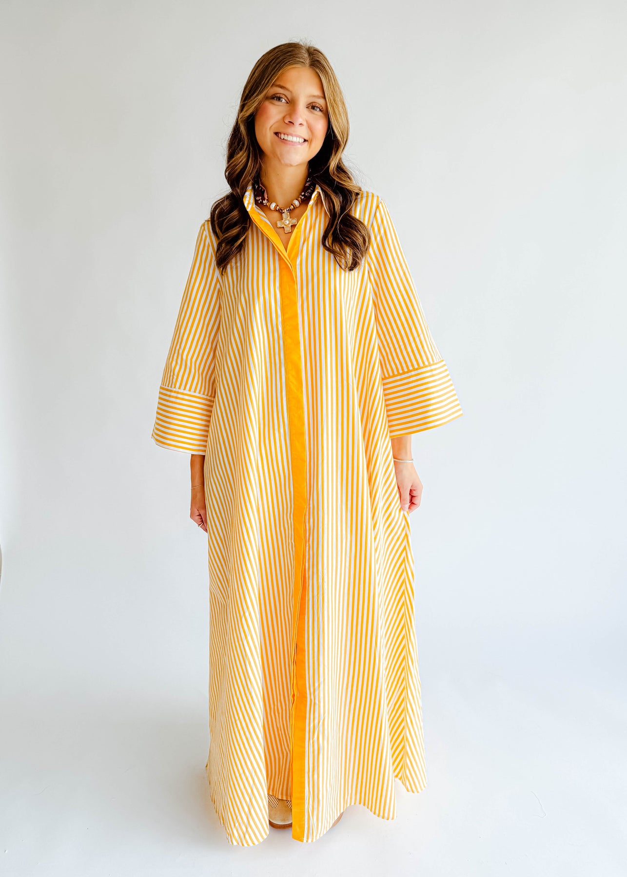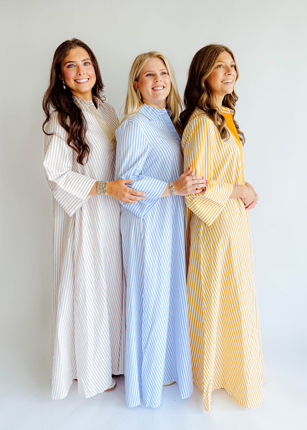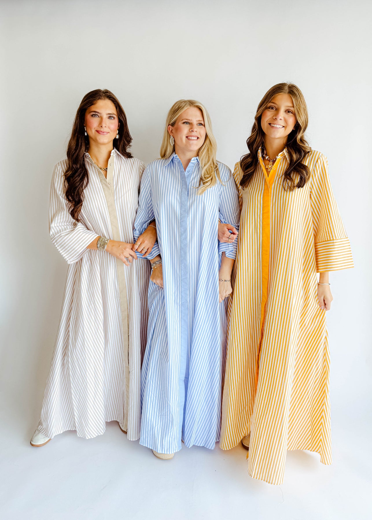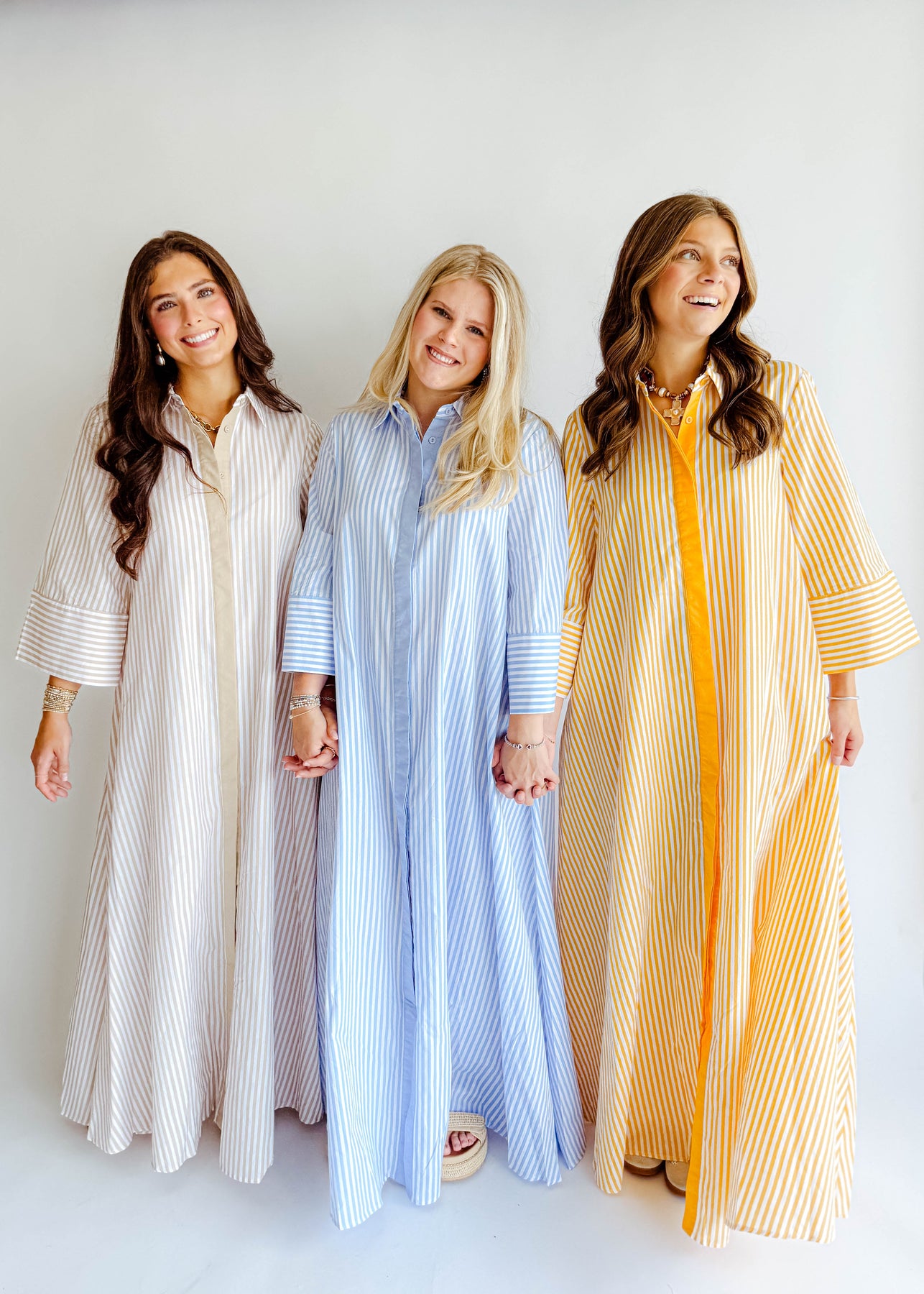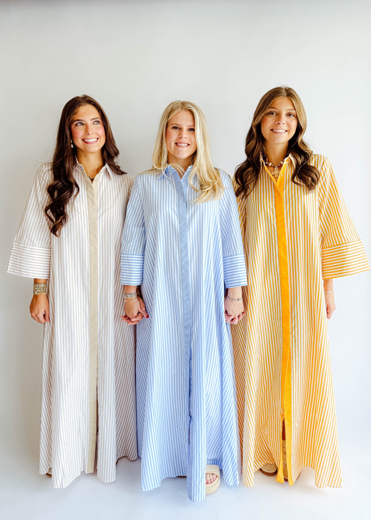 This maxi shirt dress brings a refined twist to a classic wardrobe staple. Designed with a button-down front, collared neckline, and cuffed sleeves, it combines structure with fluid movement. The elongated silhouette and subtle stripe pattern create a polished look that’s perfect for versatile styling—wear it alone for a standout moment or layered for a chic, relaxed vibe.