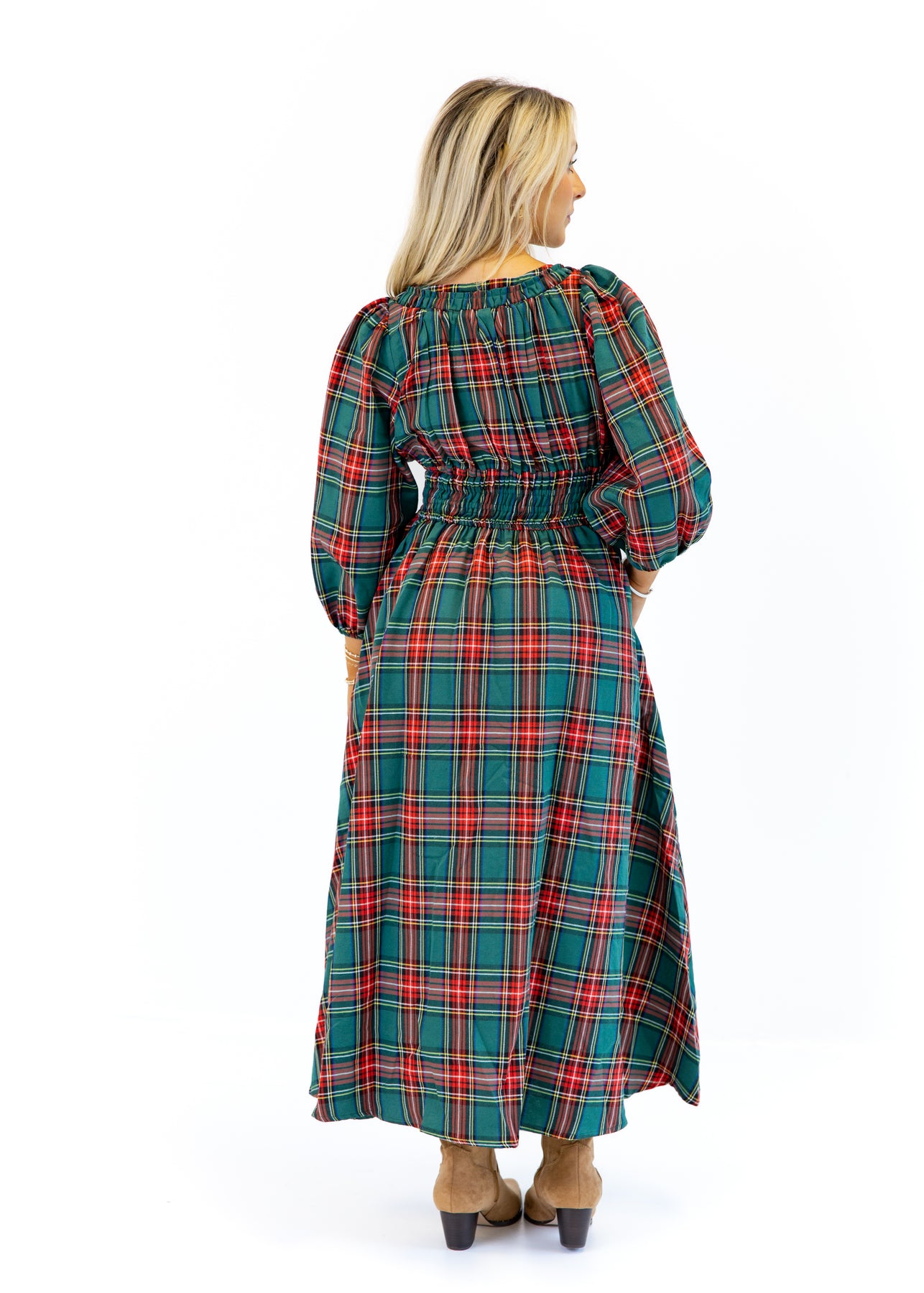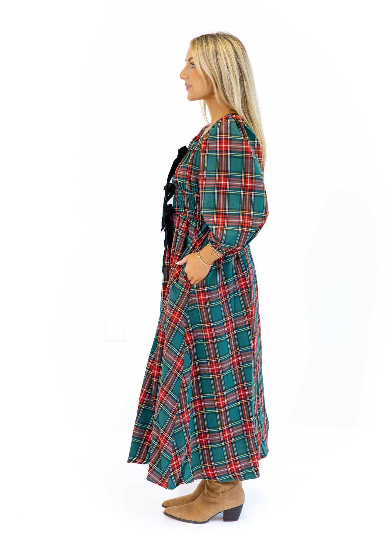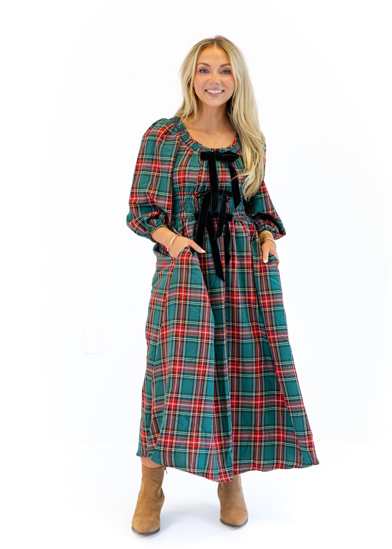 The Charlotte Plaid Midi Dress brings a classic pattern to life with charming details. Designed with a timeless plaid print, this dress features a smocked bodice adorned with dramatic velvet bow ties, adding a touch of elegance and vintage-inspired flair. The puff sleeves enhance its romantic silhouette, while practical side pockets offer modern functionality. Perfect for festive occasions or cozy gatherings, this dress combines style and comfort effortlessly.