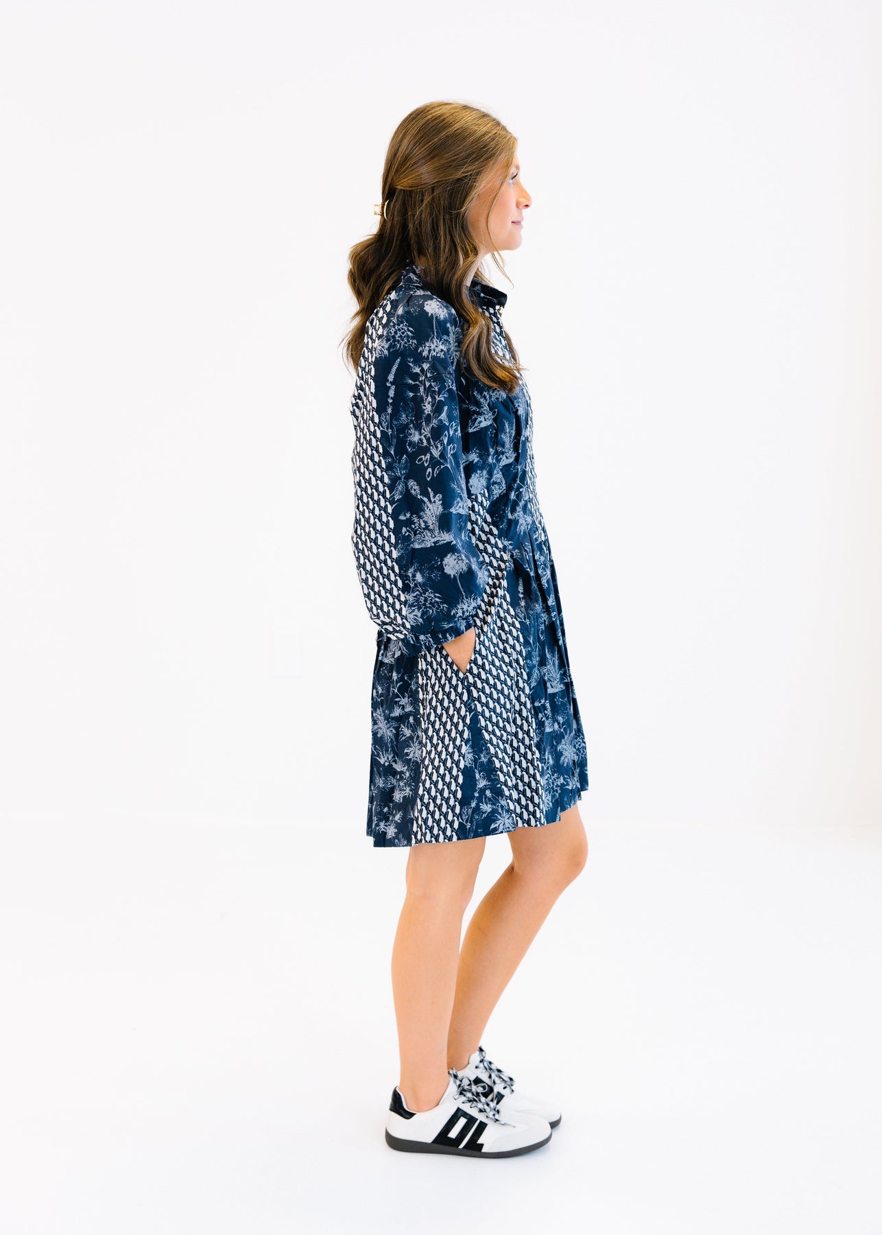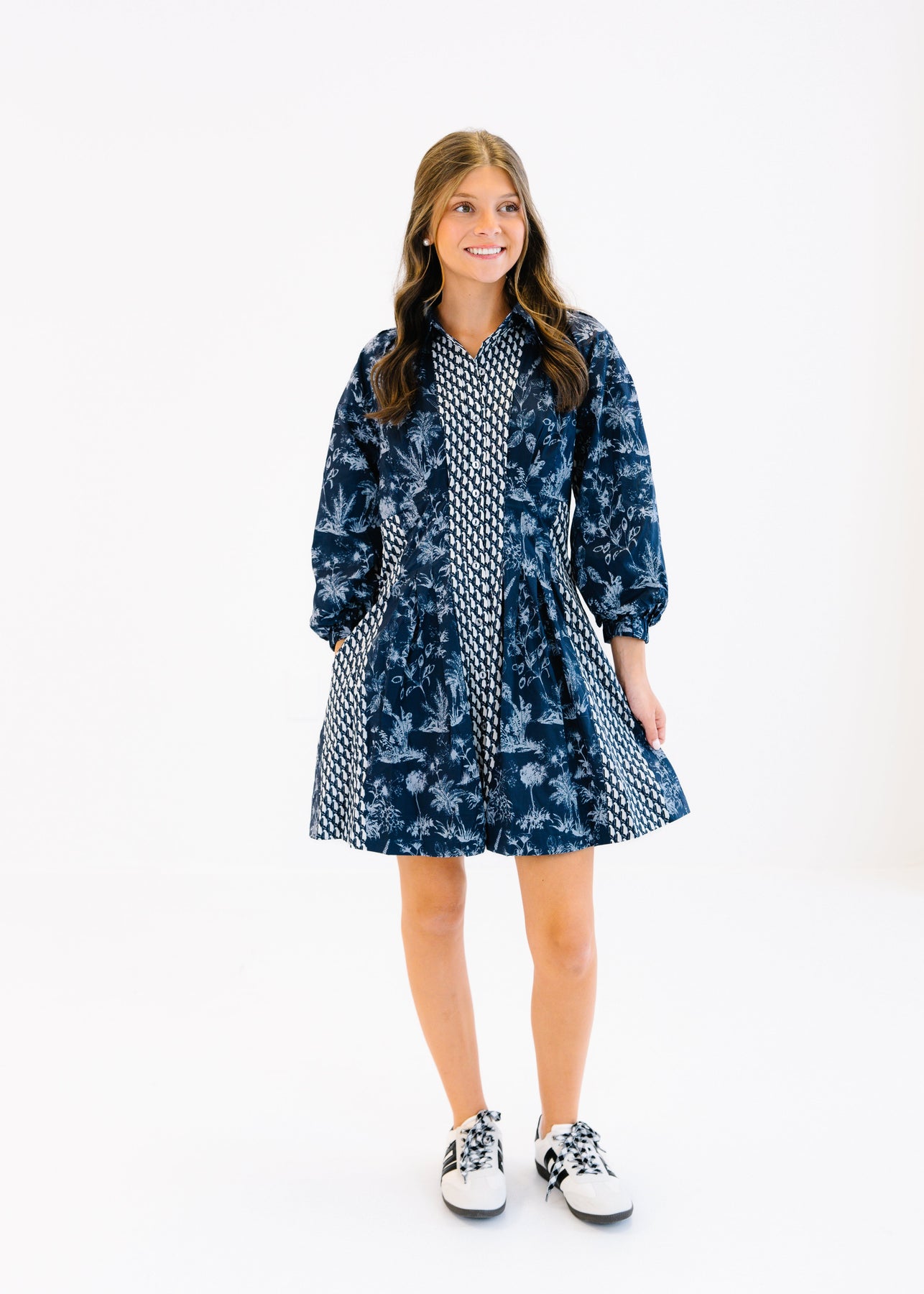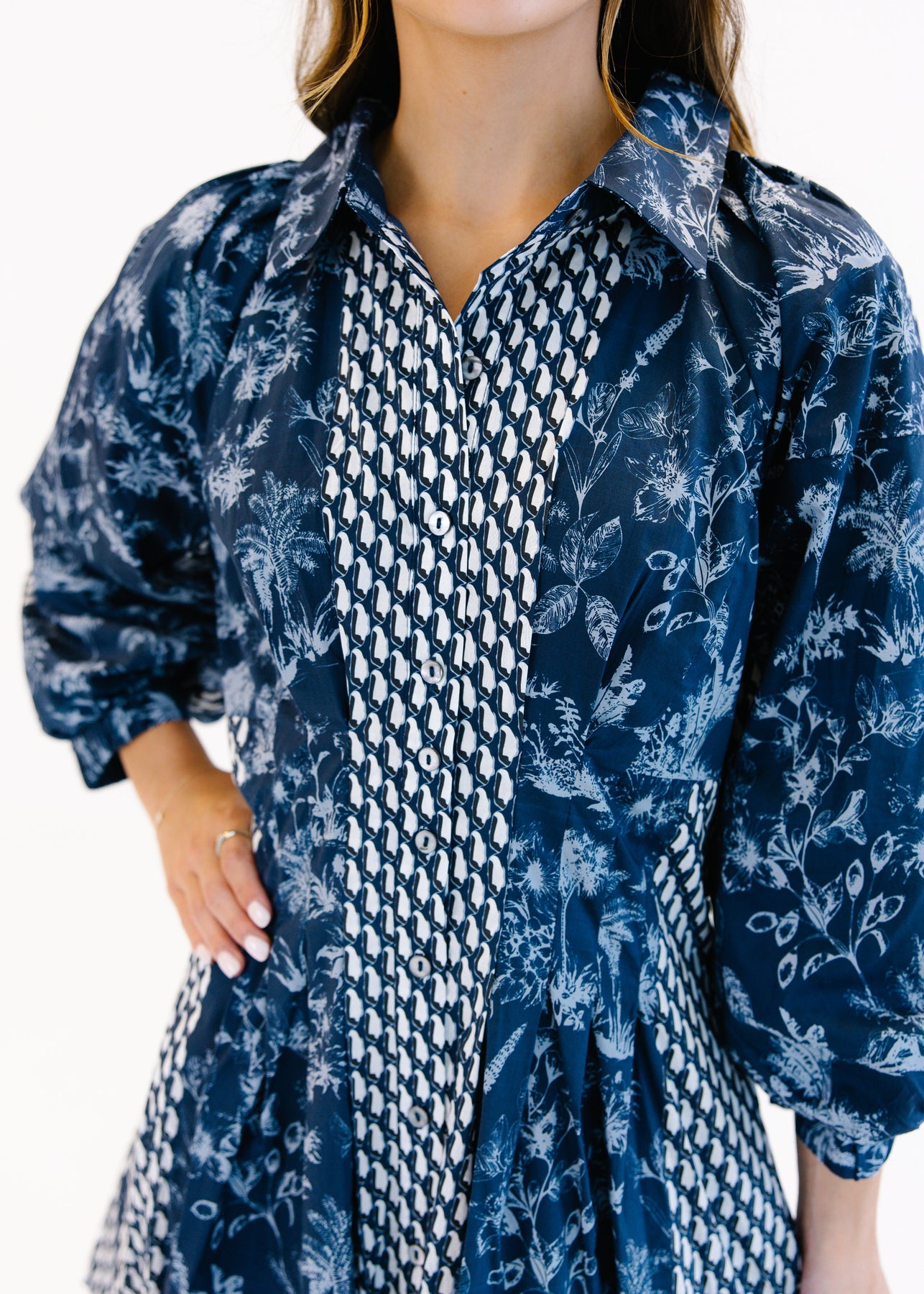 The Claire Mixed Print Shirt Dress combines timeless elegance with a modern twist. Featuring a striking mix of floral and geometric prints in deep navy tones, this dress stands out with its unique panel design. The collared neckline and button-down front give it a classic shirt dress vibe, while the voluminous sleeves and flared skirt add a touch of drama. With convenient side pockets, this dress blends style and functionality, perfect for day-to-night wear.