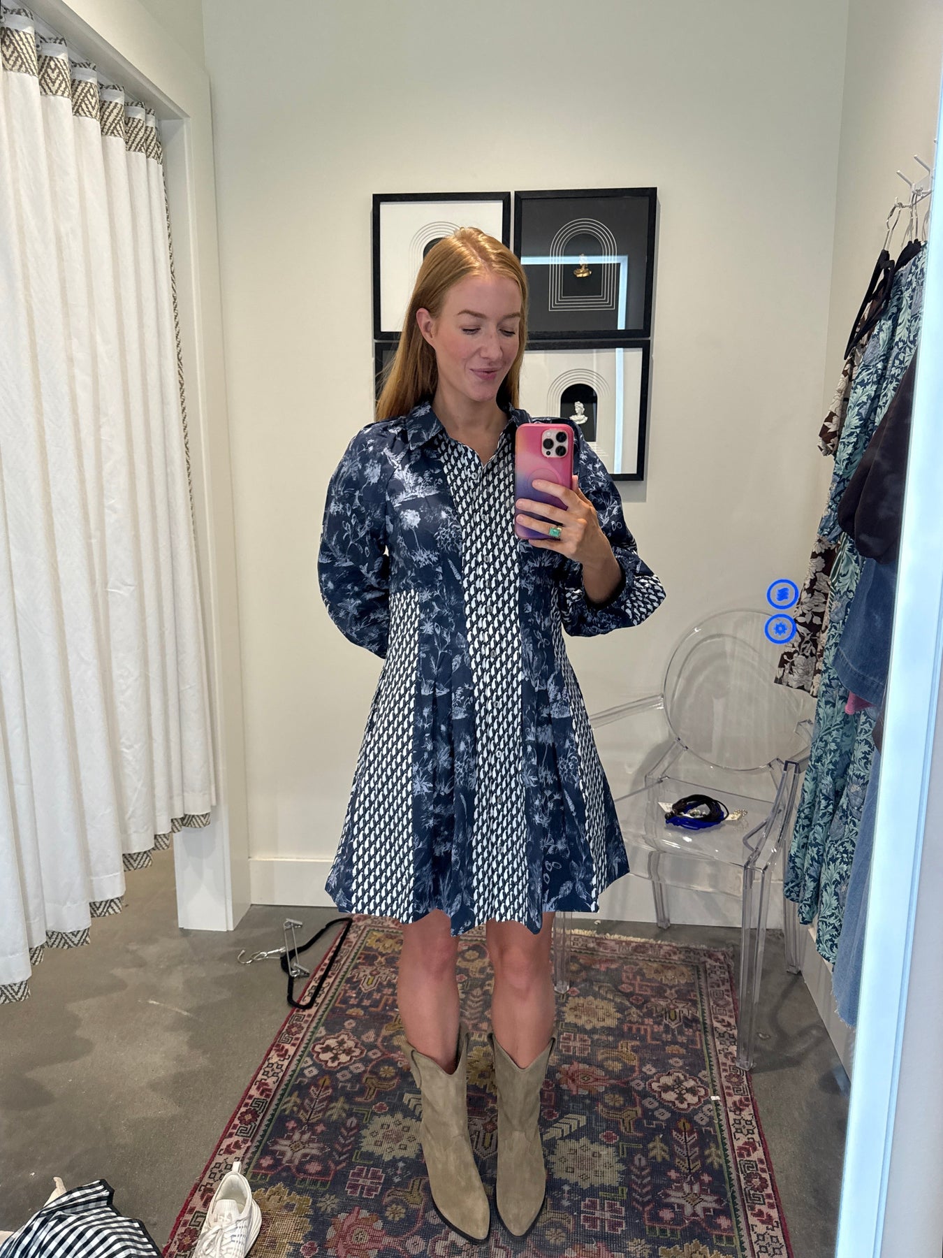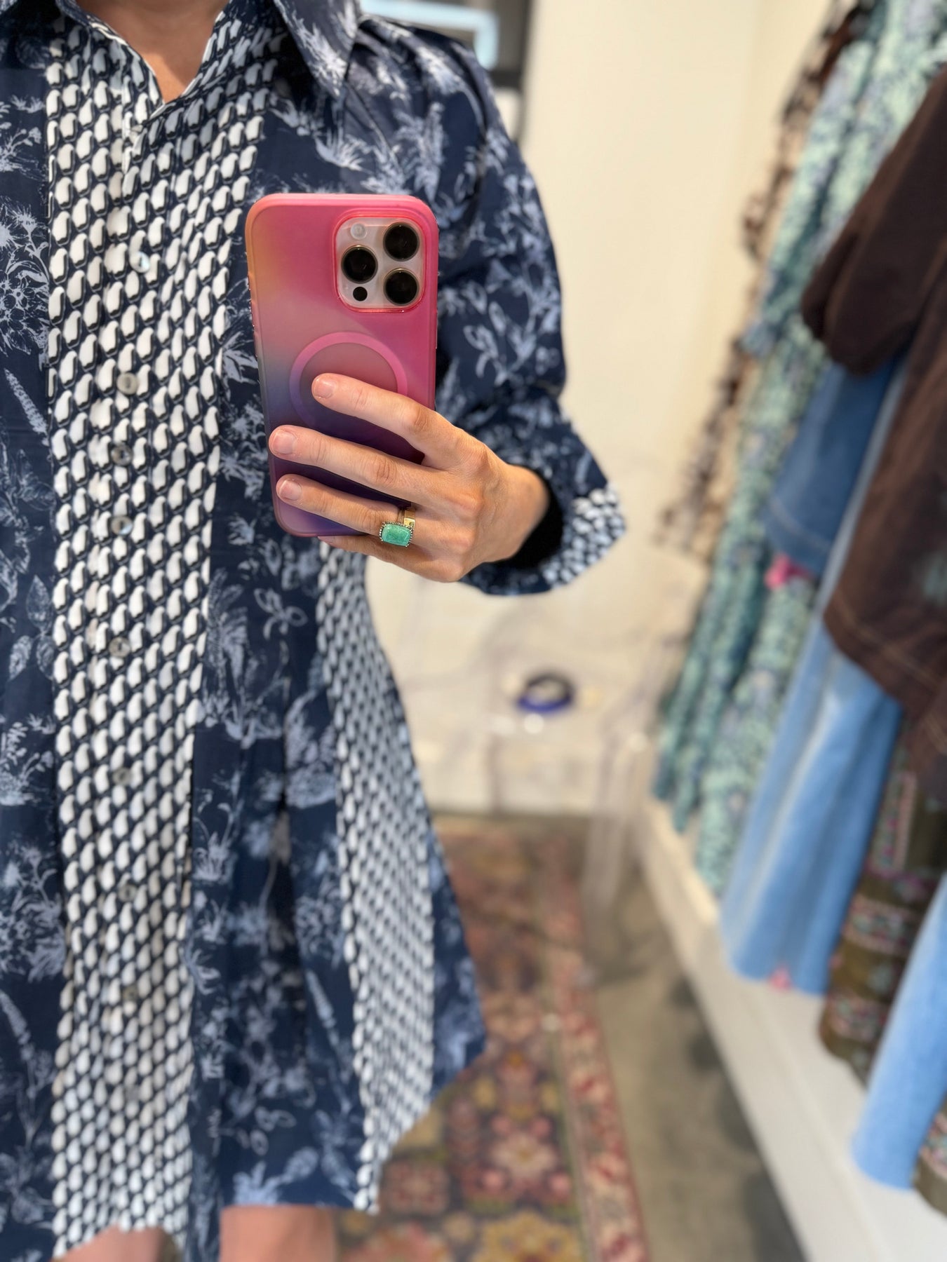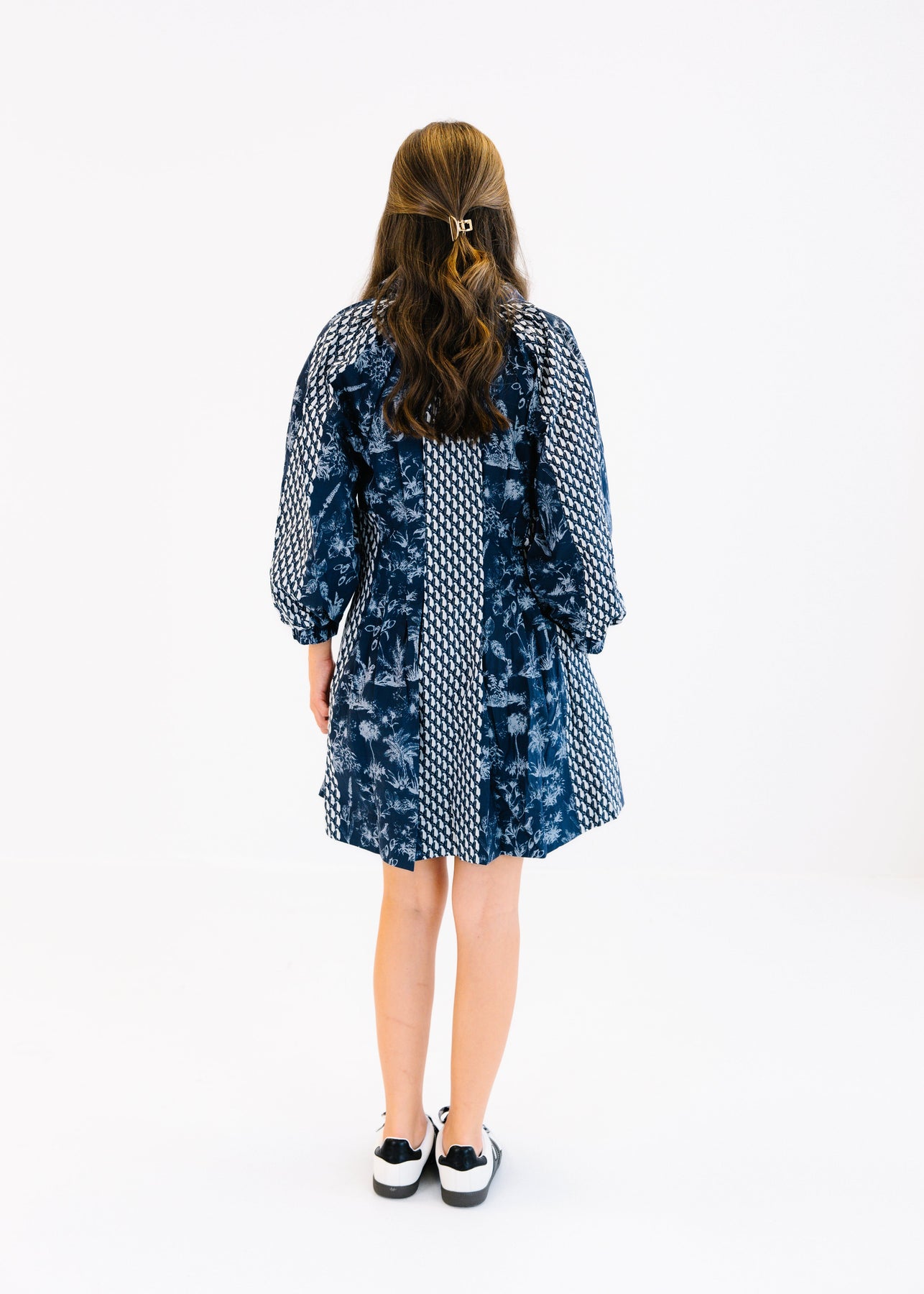 The Claire Mixed Print Shirt Dress combines timeless elegance with a modern twist. Featuring a striking mix of floral and geometric prints in deep navy tones, this dress stands out with its unique panel design. The collared neckline and button-down front give it a classic shirt dress vibe, while the voluminous sleeves and flared skirt add a touch of drama. With convenient side pockets, this dress blends style and functionality, perfect for day-to-night wear.