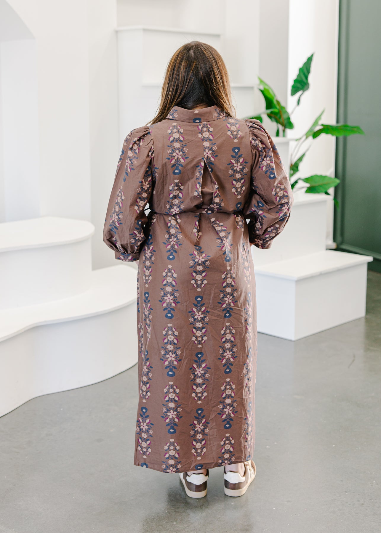 Finished with a subtle floral print that adds texture and depth, this dress is perfect for both casual elegance and dressed-up days. Pair it with heels for a refined touch or ankle boots for a more grounded, easygoing look.