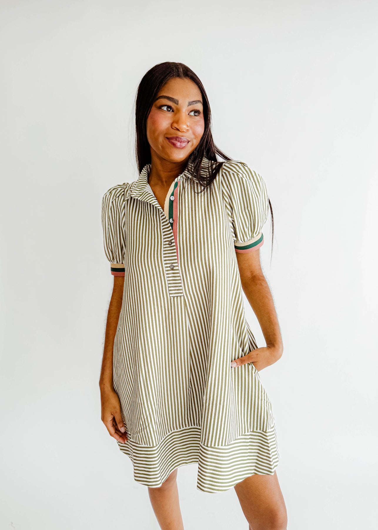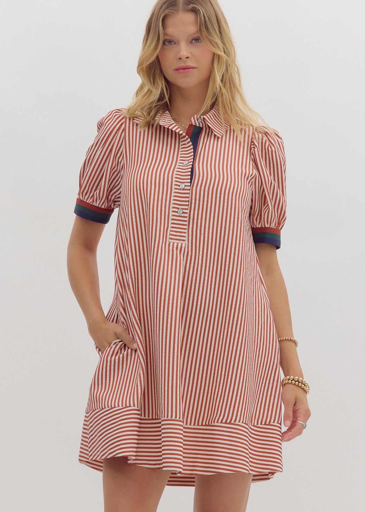 Regular price $ 52.00This breezy mini dress blends playful charm with easy sophistication. Featuring a collared neckline and partial button placket, it’s framed by puff sleeves for a feminine touch. The vertical stripe pattern elongates the silhouette, while the flared hem adds movement and flow. Perfect with sandals for sunny days or dressed up with wedges for weekend outings, it’s an effortlessly flattering piece you’ll want on repeat.