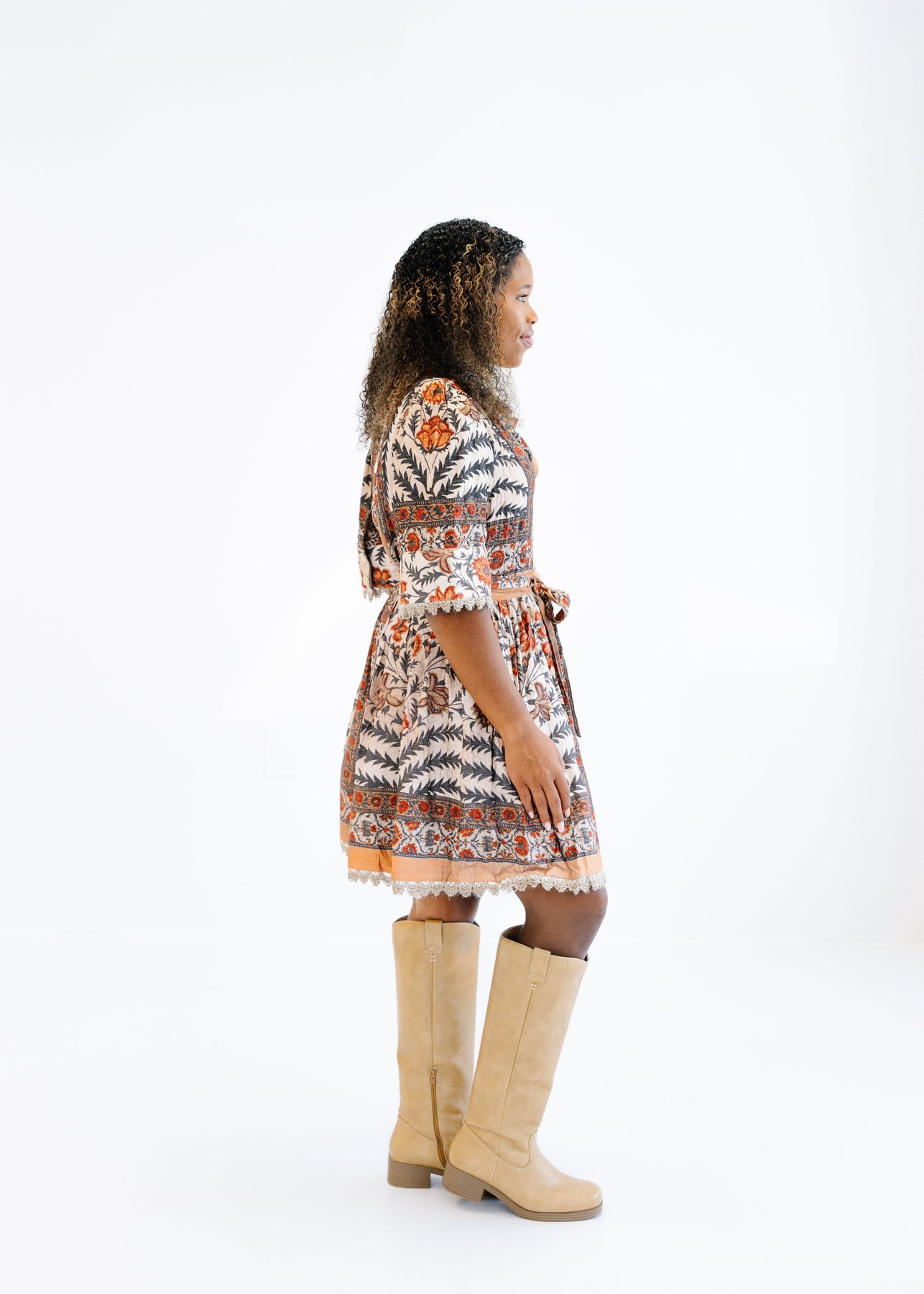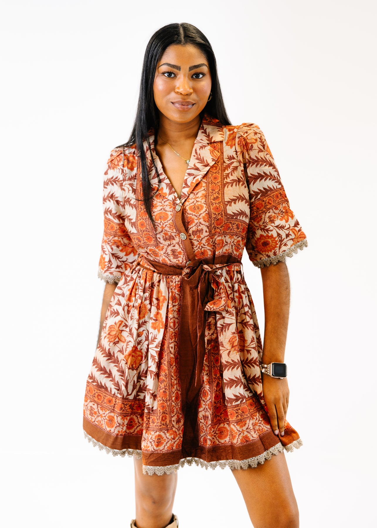 The Marisol Printed Shirt Dress is a vintage-inspired beauty with a modern twist. Its intricate allover print and button-front detail create a statement look, while the belted waist flatters your figure with definition and shape. The collared neckline and half sleeves add polish, and delicate lace trim along the hem and cuffs gives it a feminine finish. Perfect for brunches, getaways, and any occasion where you want to look effortlessly put together.