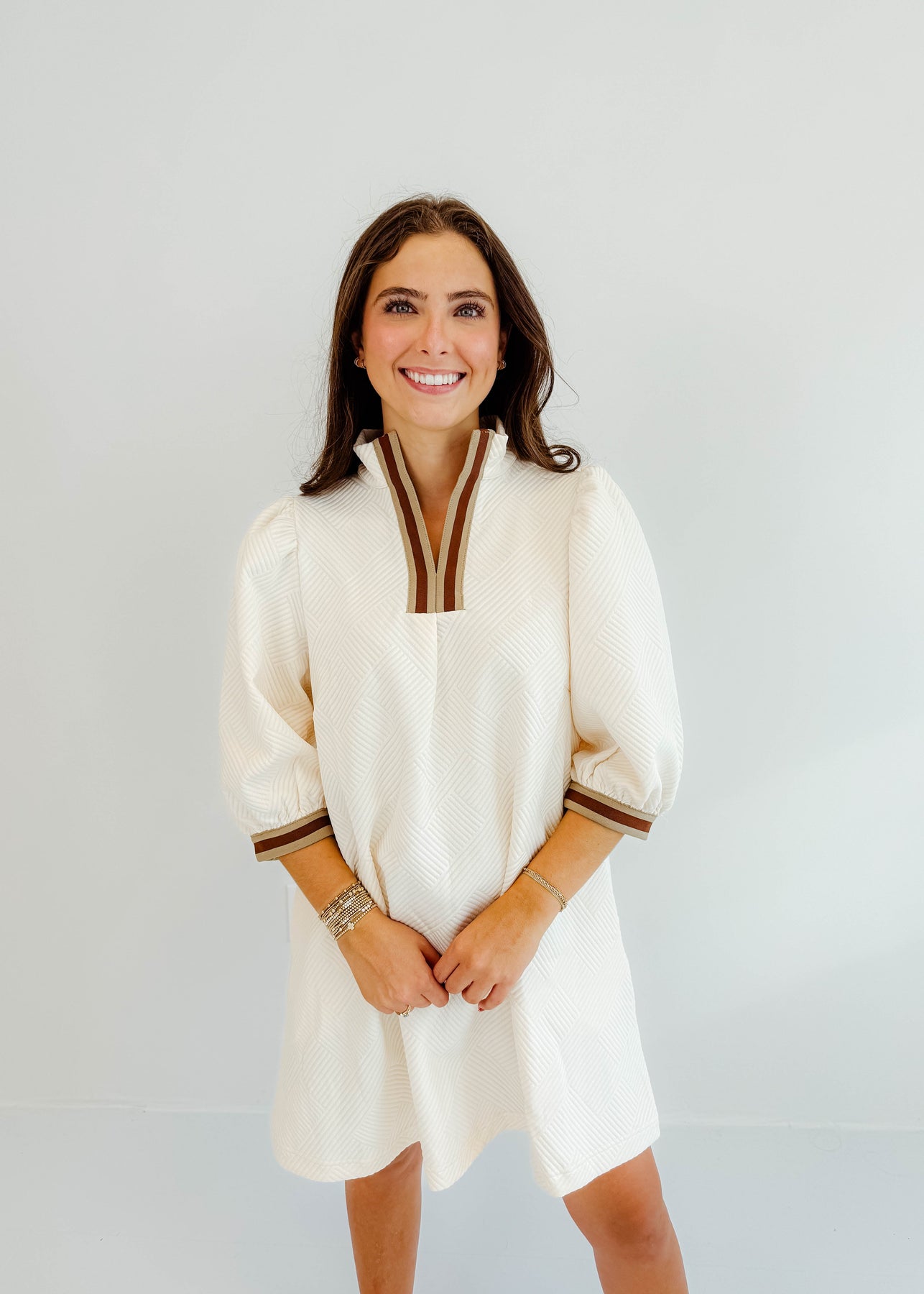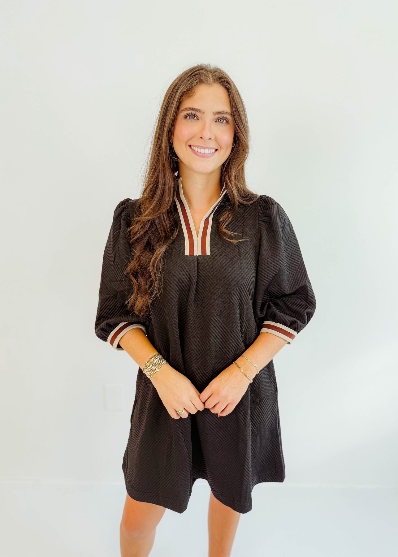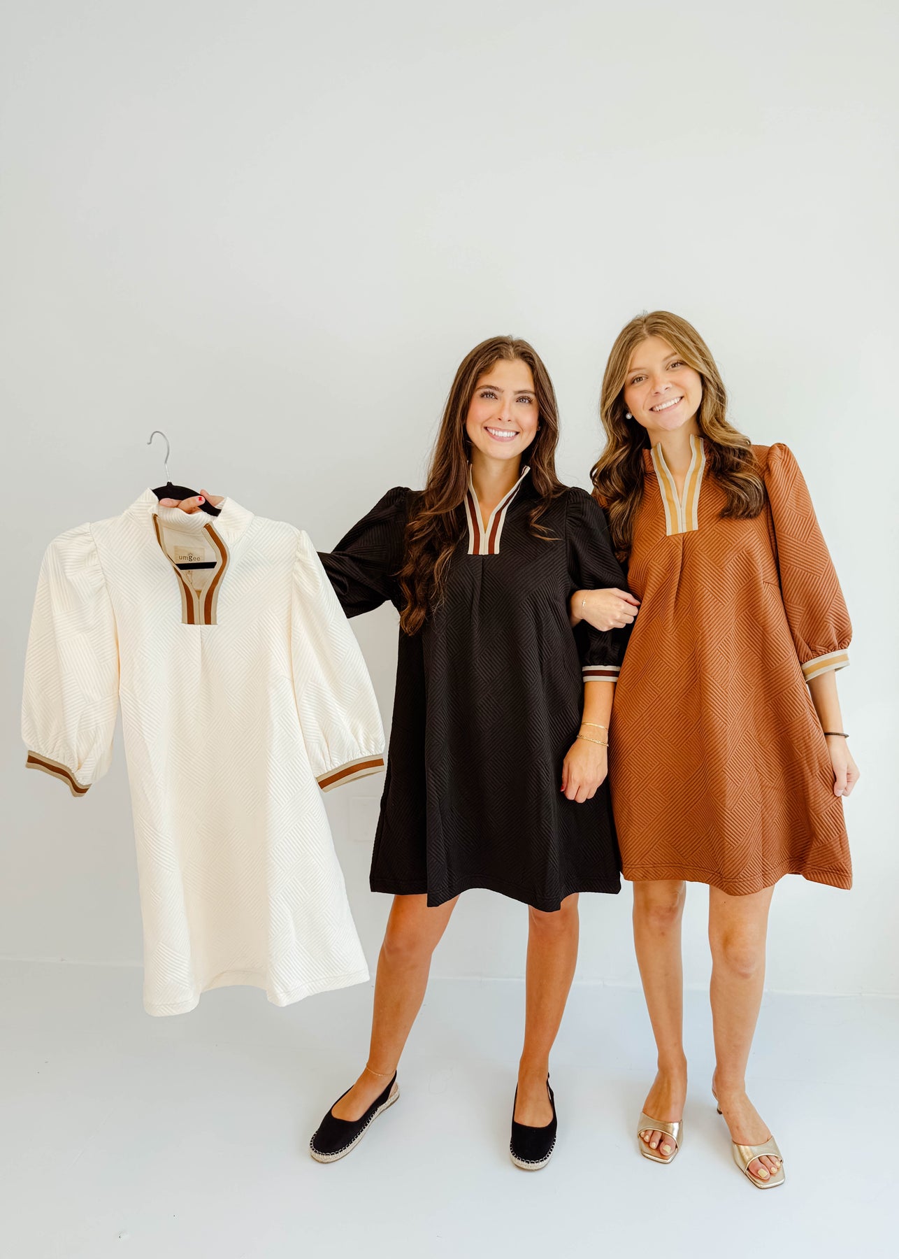 Mira Textured Shift Dress blends a clean, modern silhouette with subtle textured details for an elevated everyday look. The contrast trim neckline and sleeves add definition, while the relaxed fit keeps it comfortable and versatile. Pair it with sneakers for casual days or boots for a chic, polished outfit.