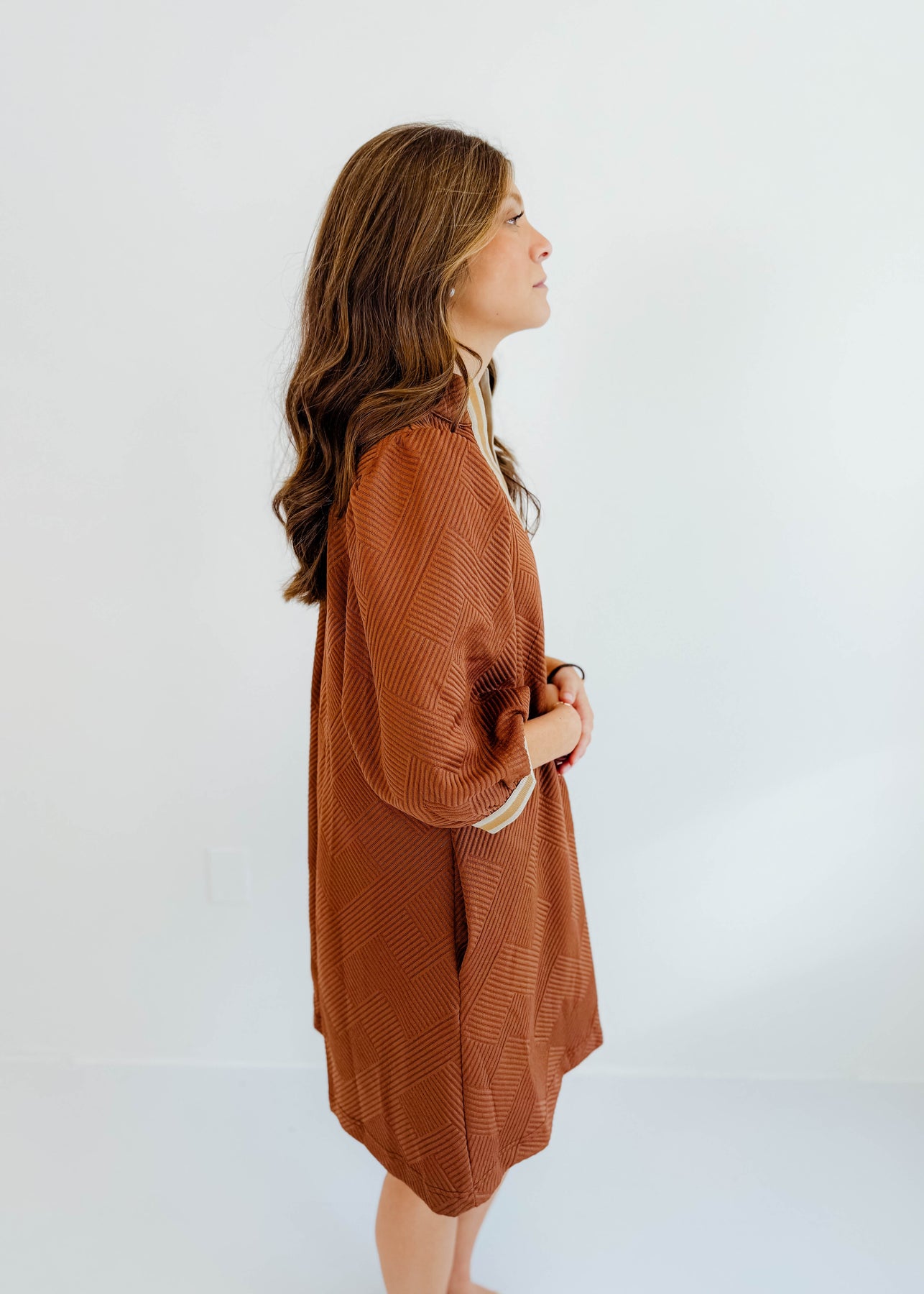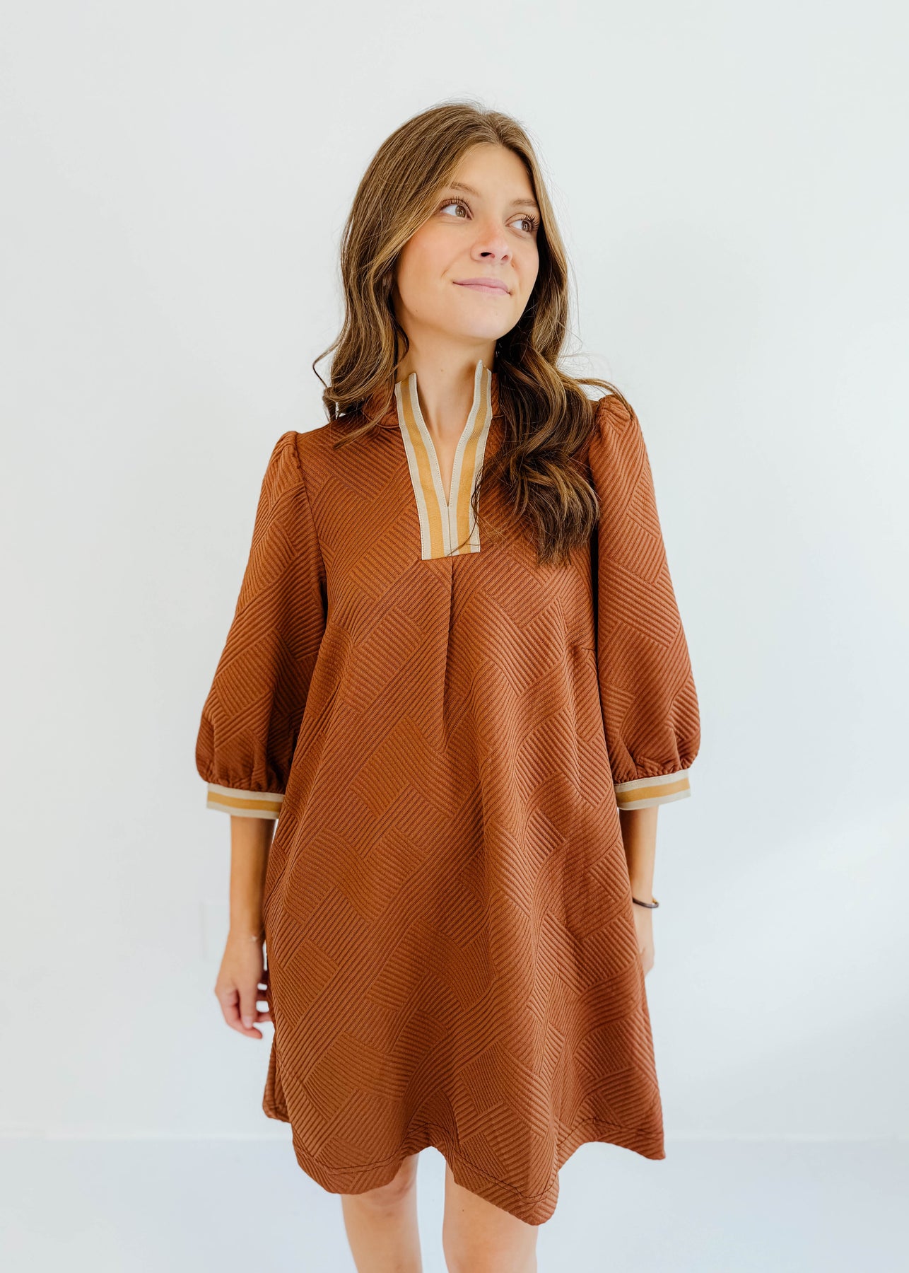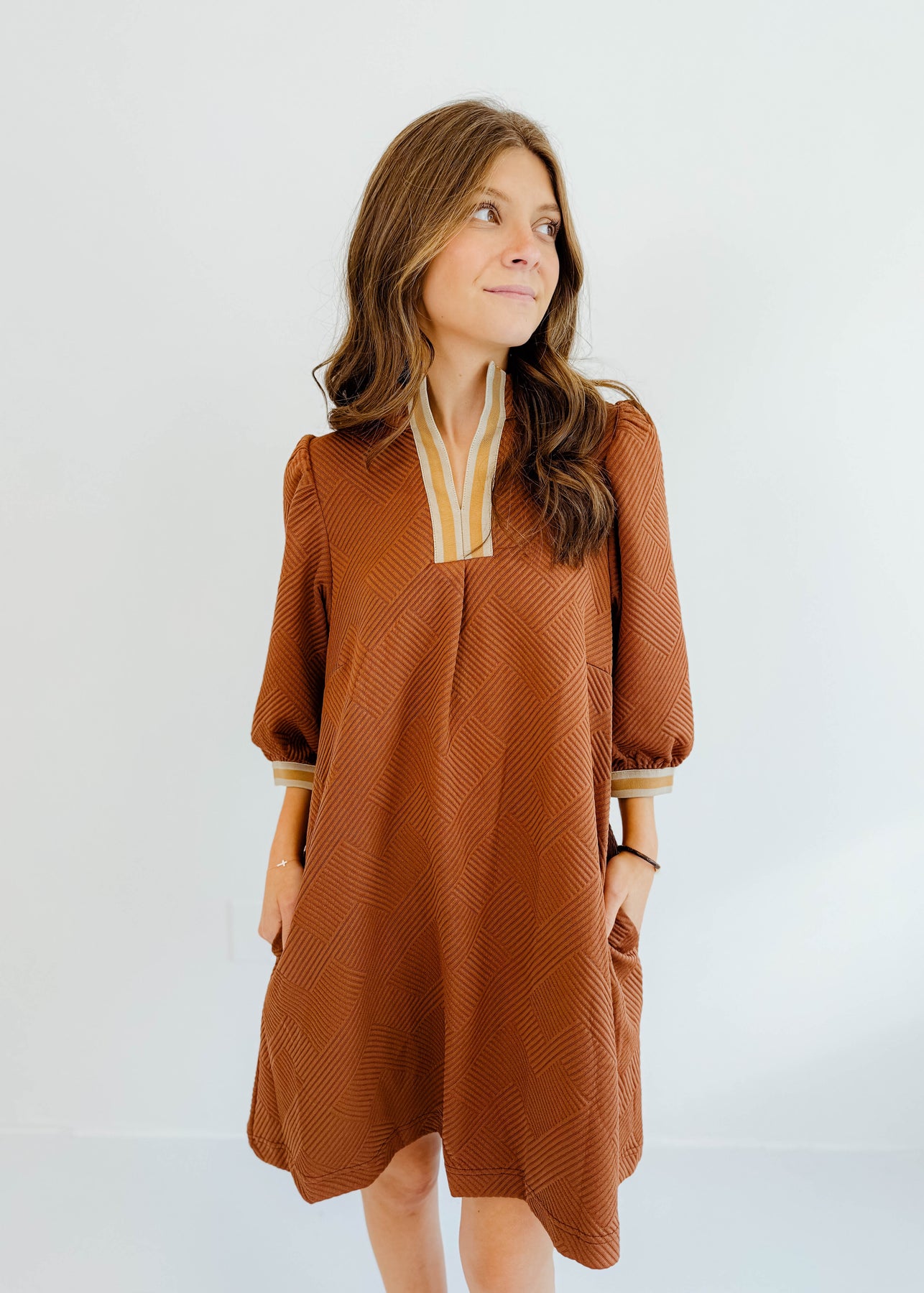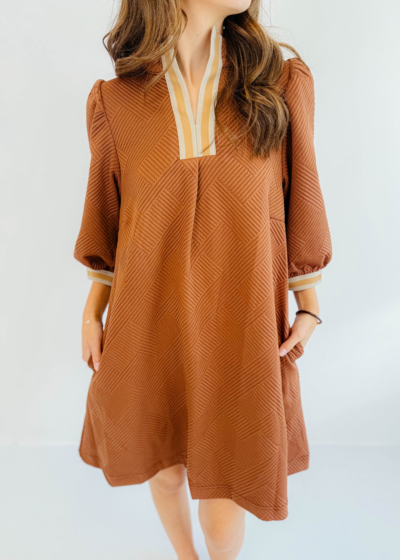 Mira Textured Shift Dress blends a clean, modern silhouette with subtle textured details for an elevated everyday look. The contrast trim neckline and sleeves add definition, while the relaxed fit keeps it comfortable and versatile. Pair it with sneakers for casual days or boots for a chic, polished outfit.