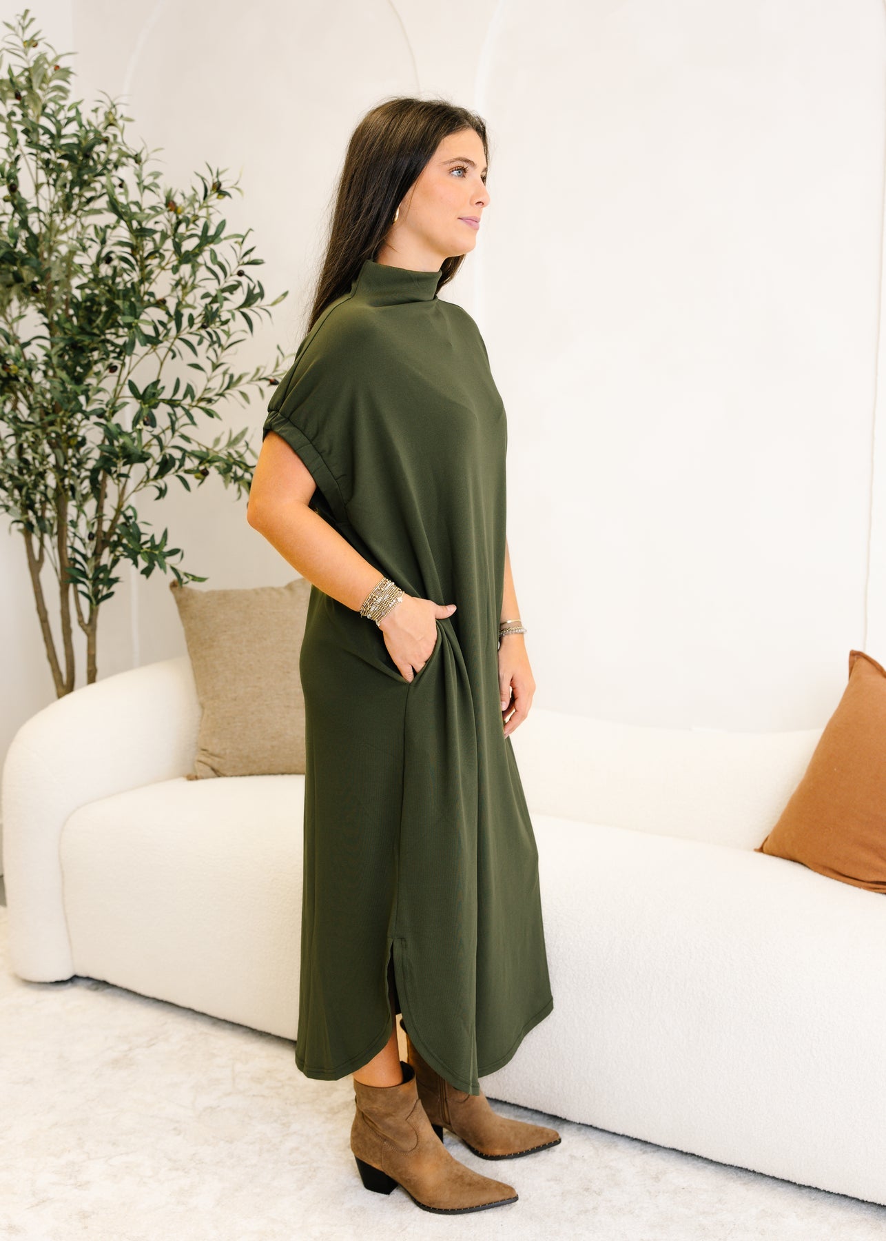 The Noelle Mock Neck Midi Dress is effortlessly chic with its minimalistic design and relaxed silhouette. Featuring a sleek mock neckline, subtle cap sleeves with gentle ruching, and hidden side pockets, this dress blends style with functionality. Its flowy fabric drapes beautifully, making it a versatile piece for both day and night looks.
