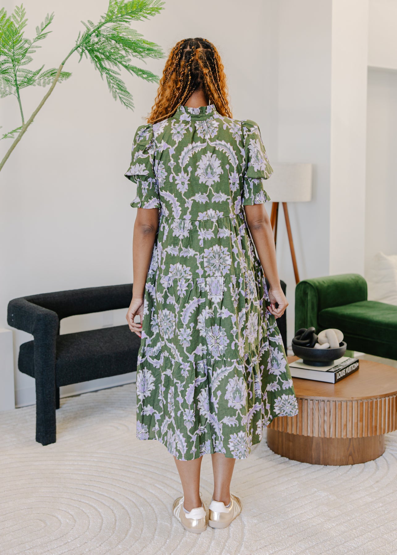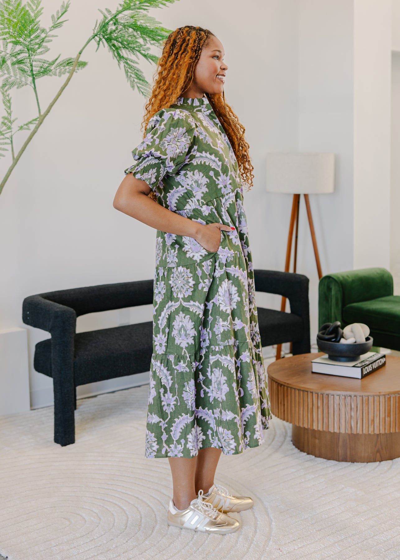 Regular price $ 64.00The Petal Trace Midi Dress brings an easy blend of structure and softness. Designed with puff sleeves, a subtle stand collar, and a flowy tiered skirt, it creates a feminine shape without feeling overdone. The floral pattern adds personality, while side pockets make it a wear-anywhere piece.