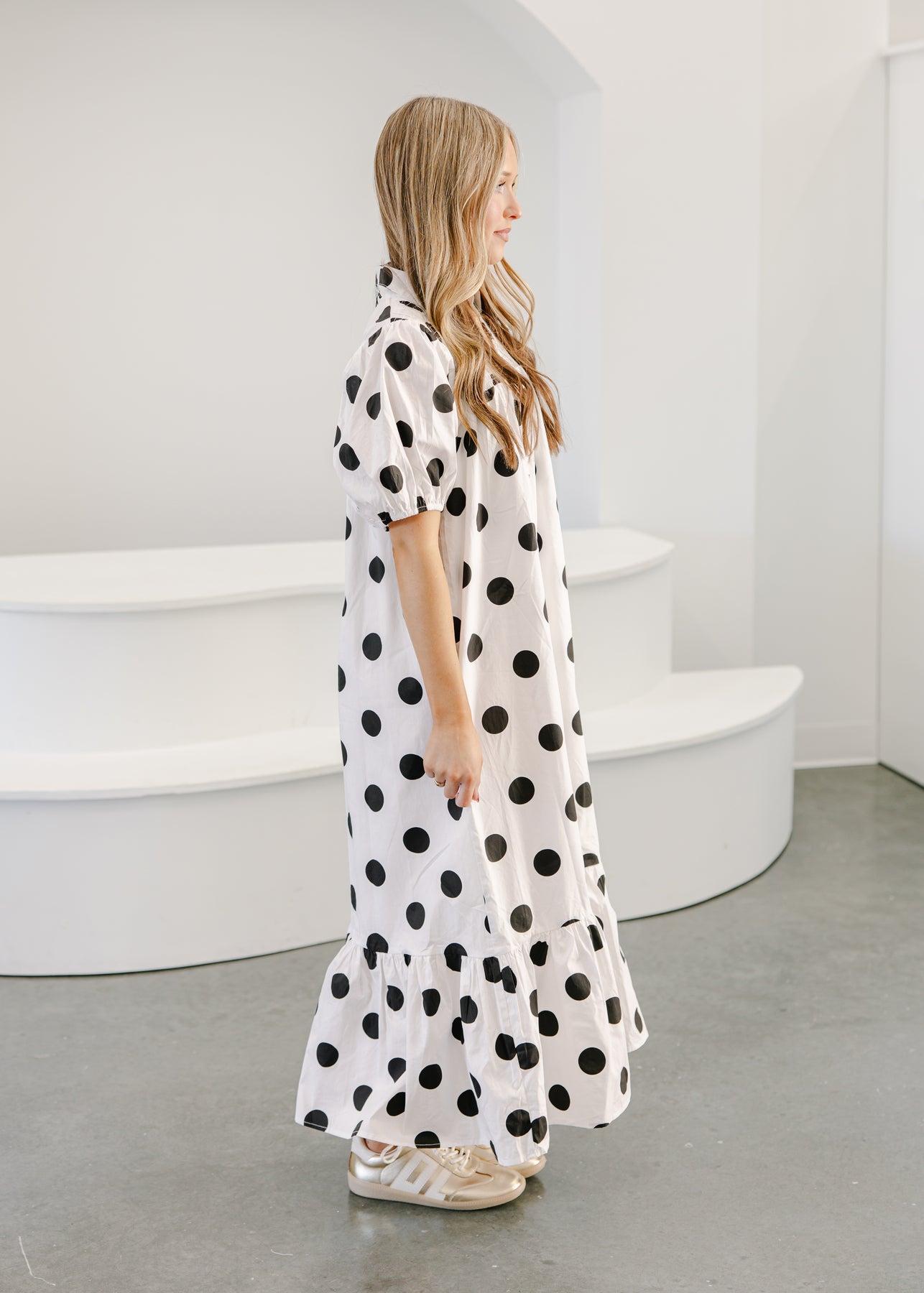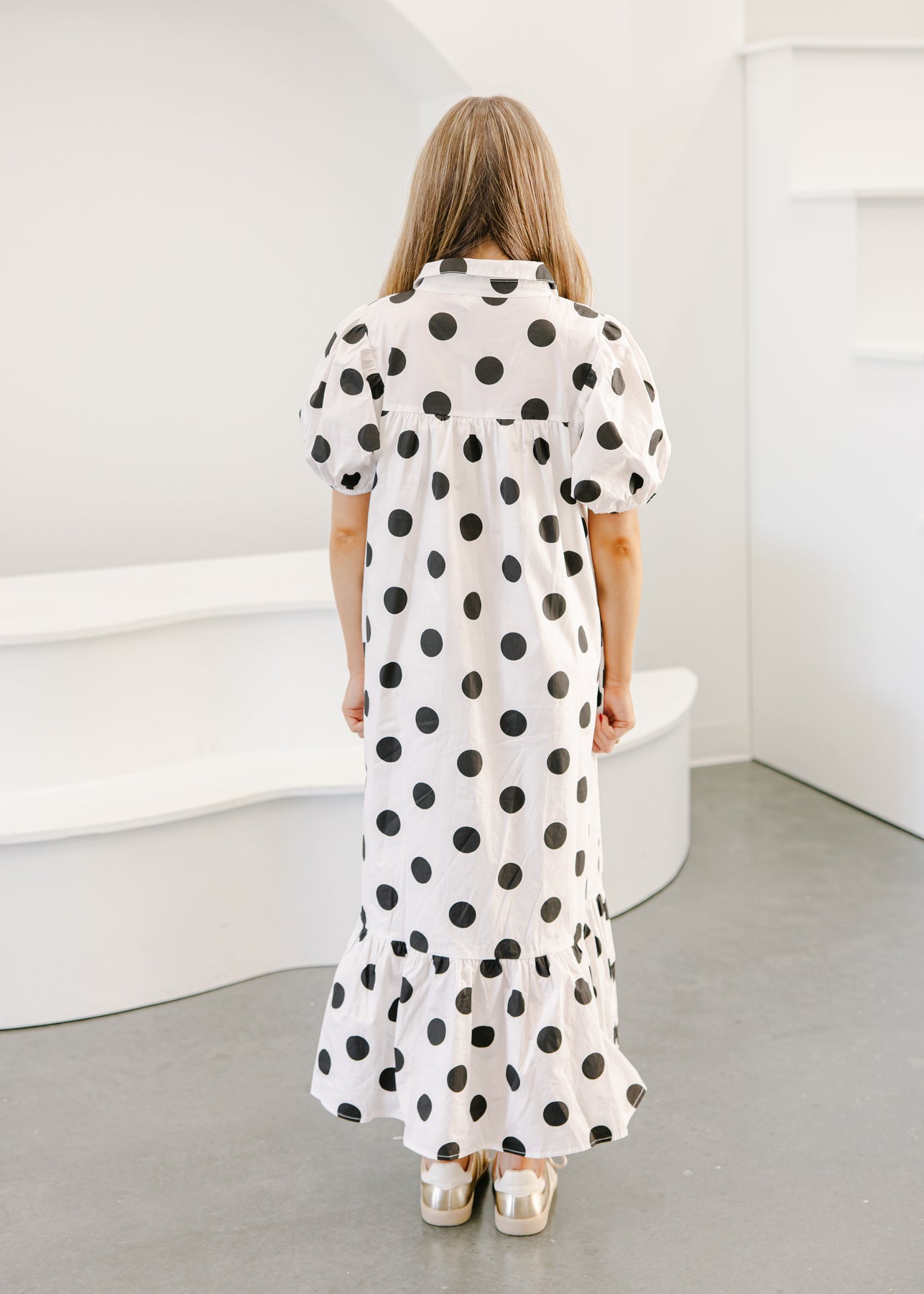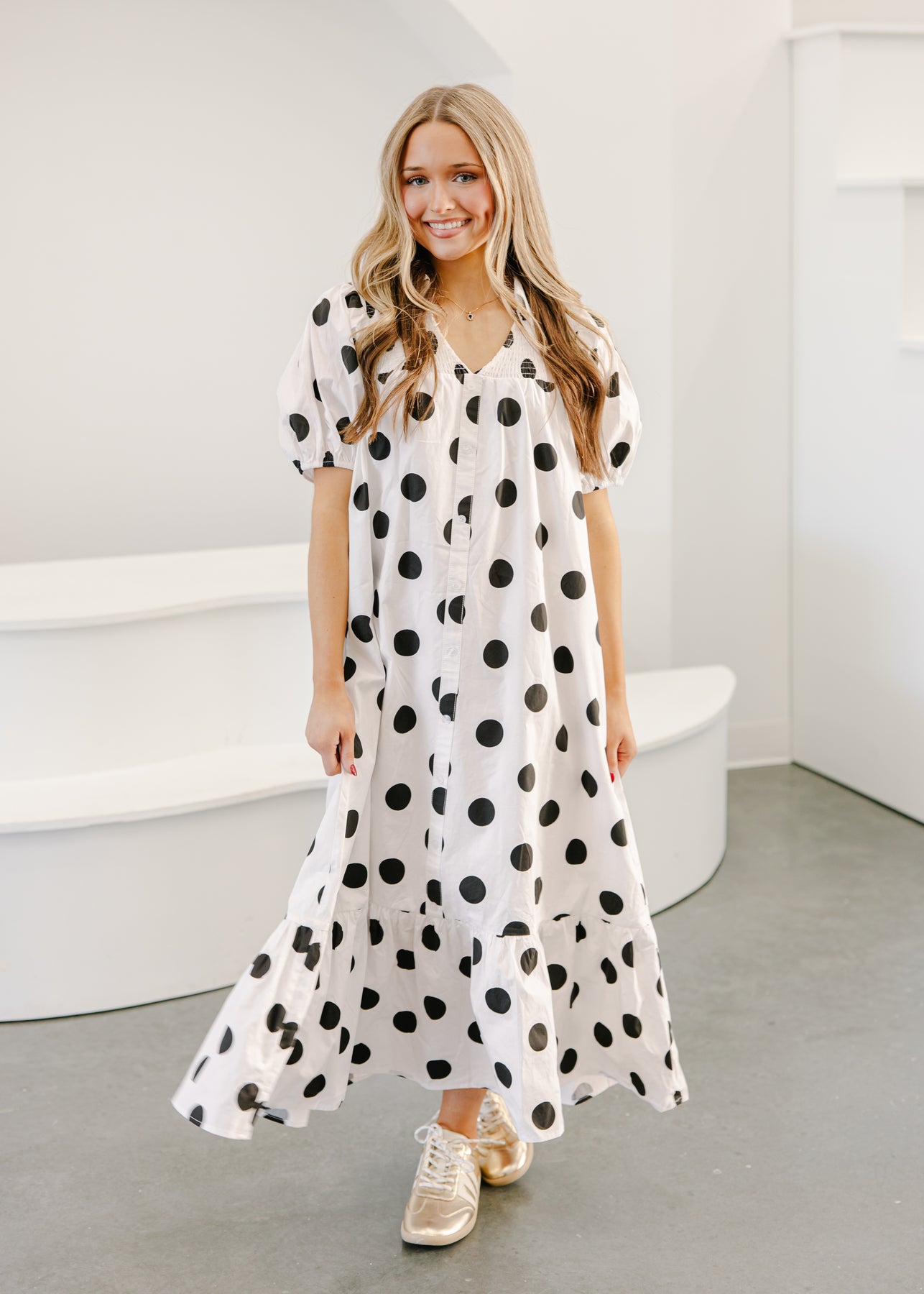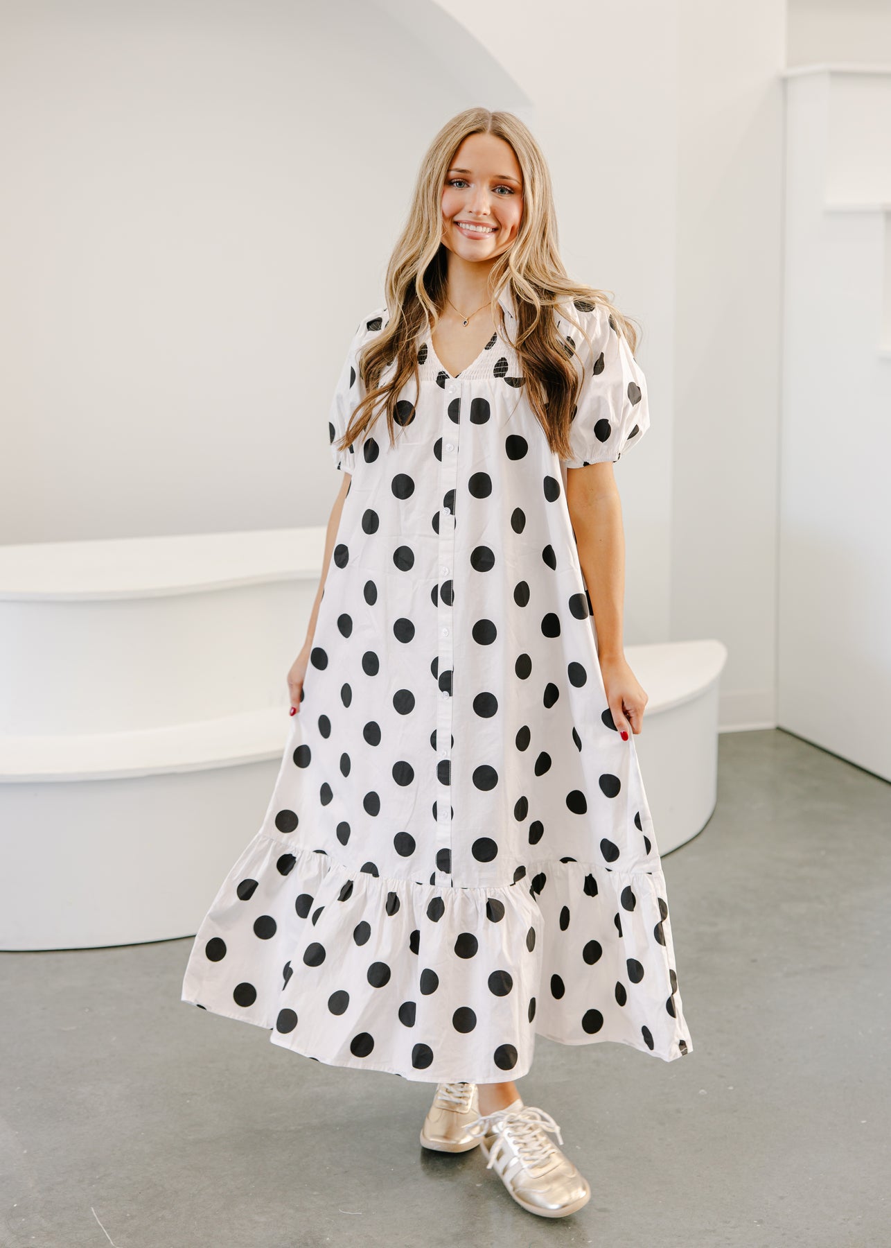 Make a statement with timeless charm in the Relaxed Polka Dot Midi Dress. Featuring a bold dot print and a breezy, relaxed silhouette, this dress is equal parts fun and sophisticated. The puff sleeves and tiered hem add a touch of femininity, while the smocked detailing at the neckline brings a soft, flattering finish.