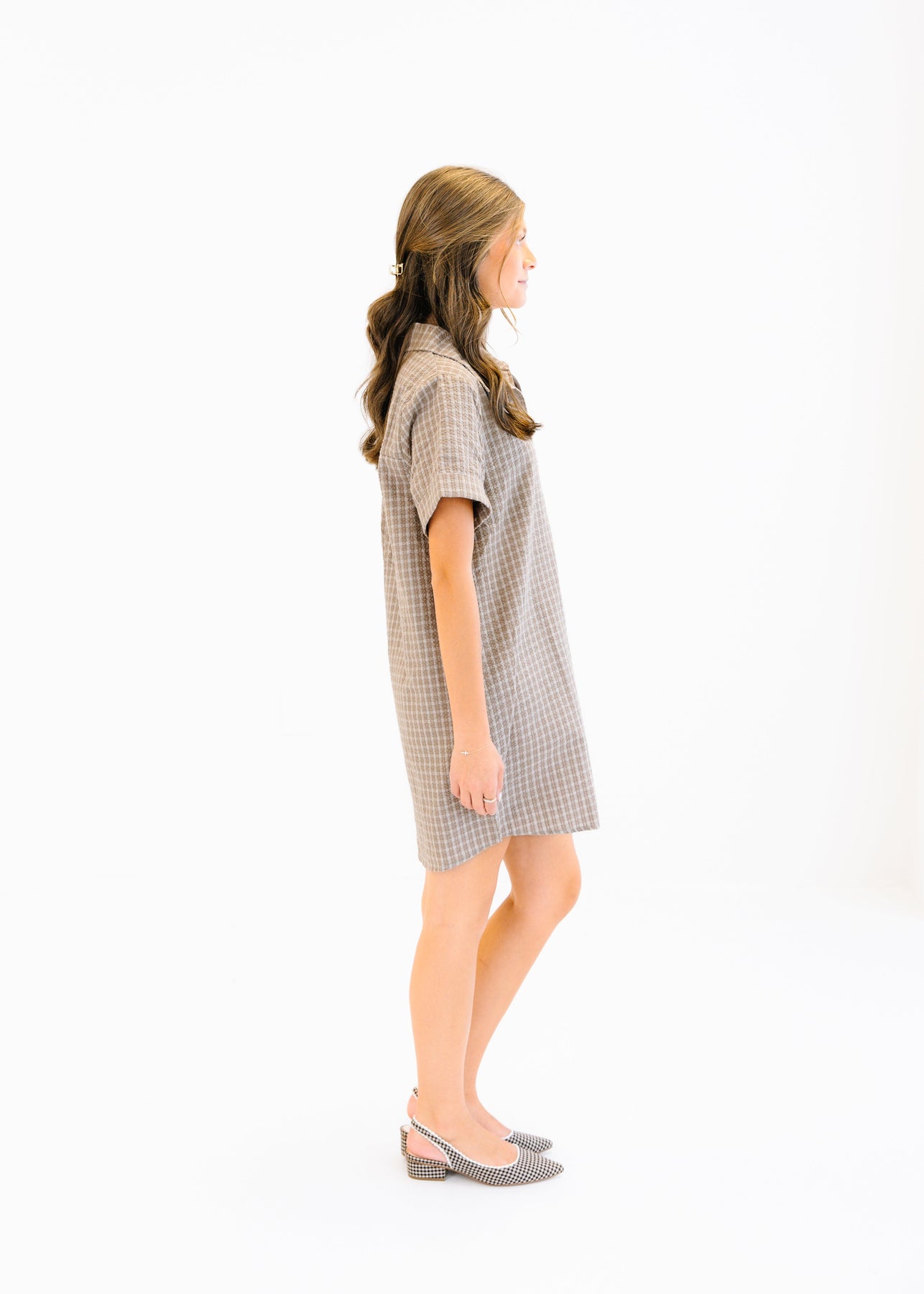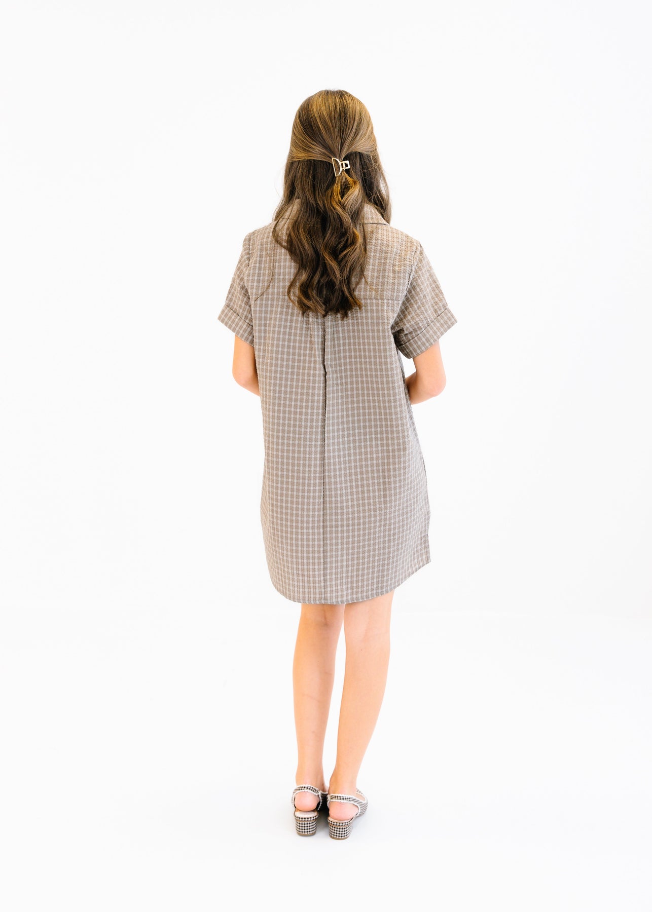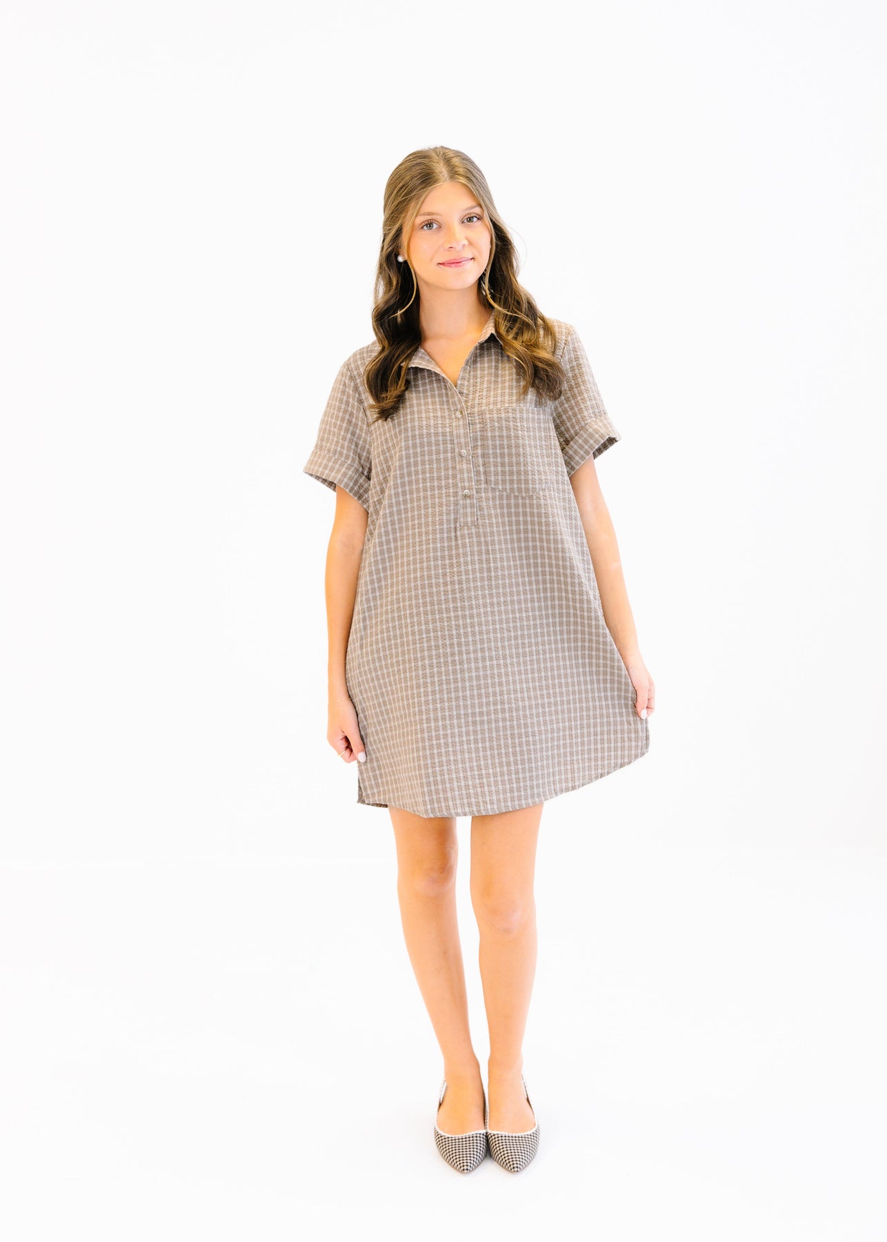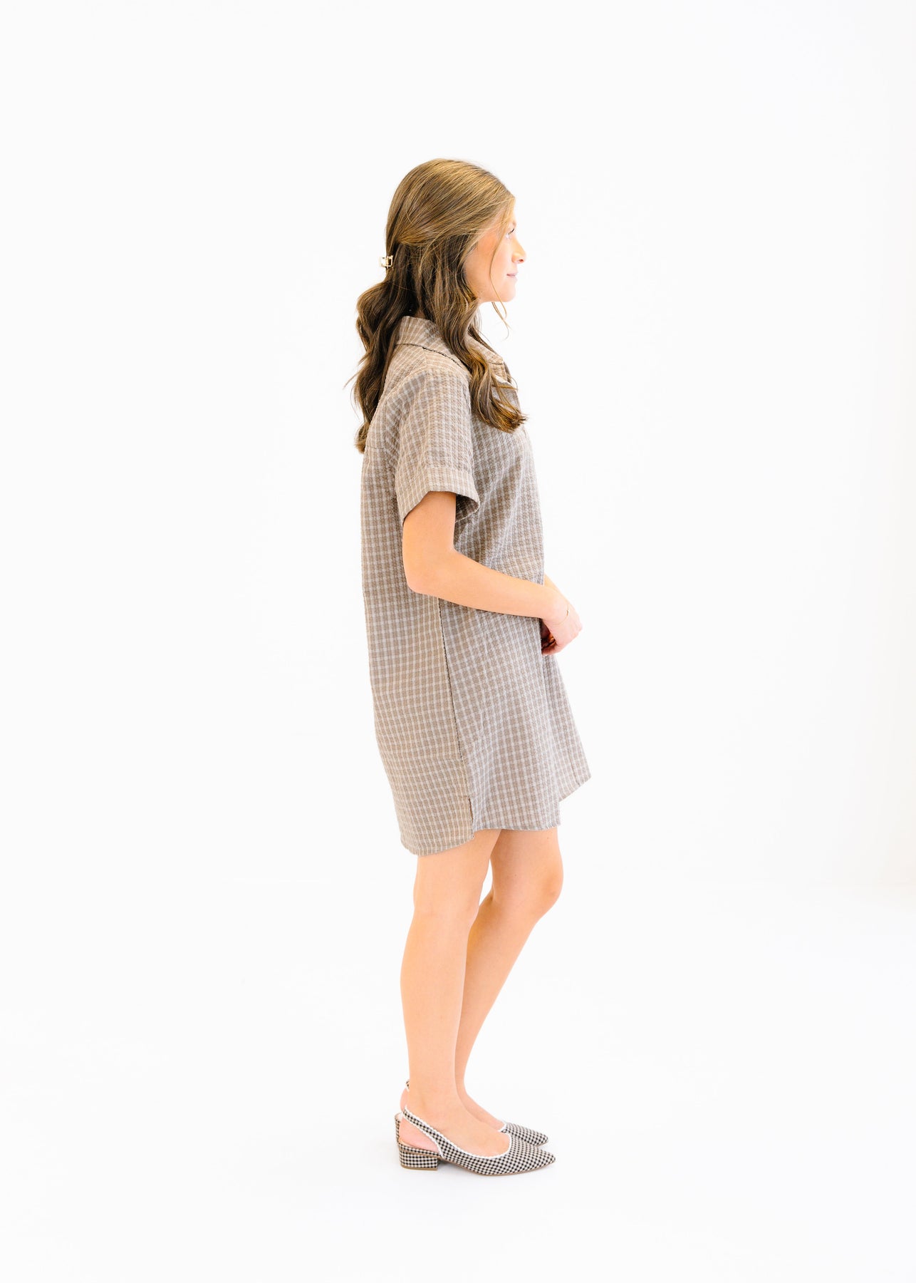 The Ruby Plaid Shirt Dress offers a perfect blend of comfort and casual charm. Designed with a classic collared neckline, button placket, and short sleeves, this dress features a subtle taupe gingham pattern for a timeless, laid-back look. Its relaxed fit makes it ideal for everyday wear—pair with sneakers for daytime outings or dress it up with sandals and accessories for an elevated casual style.