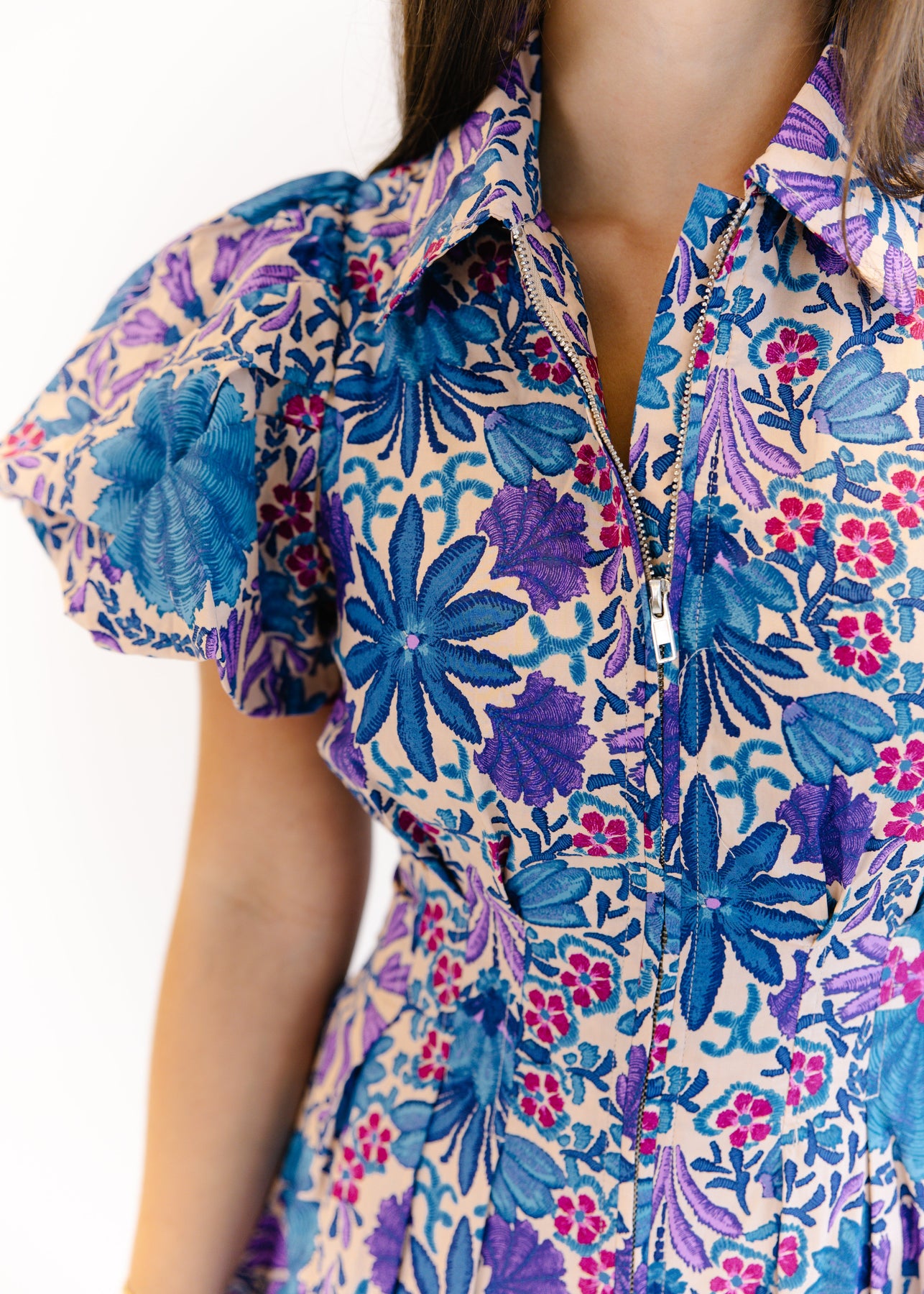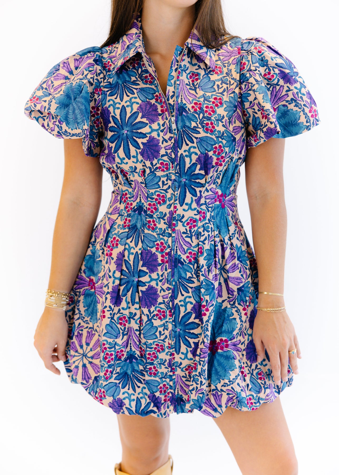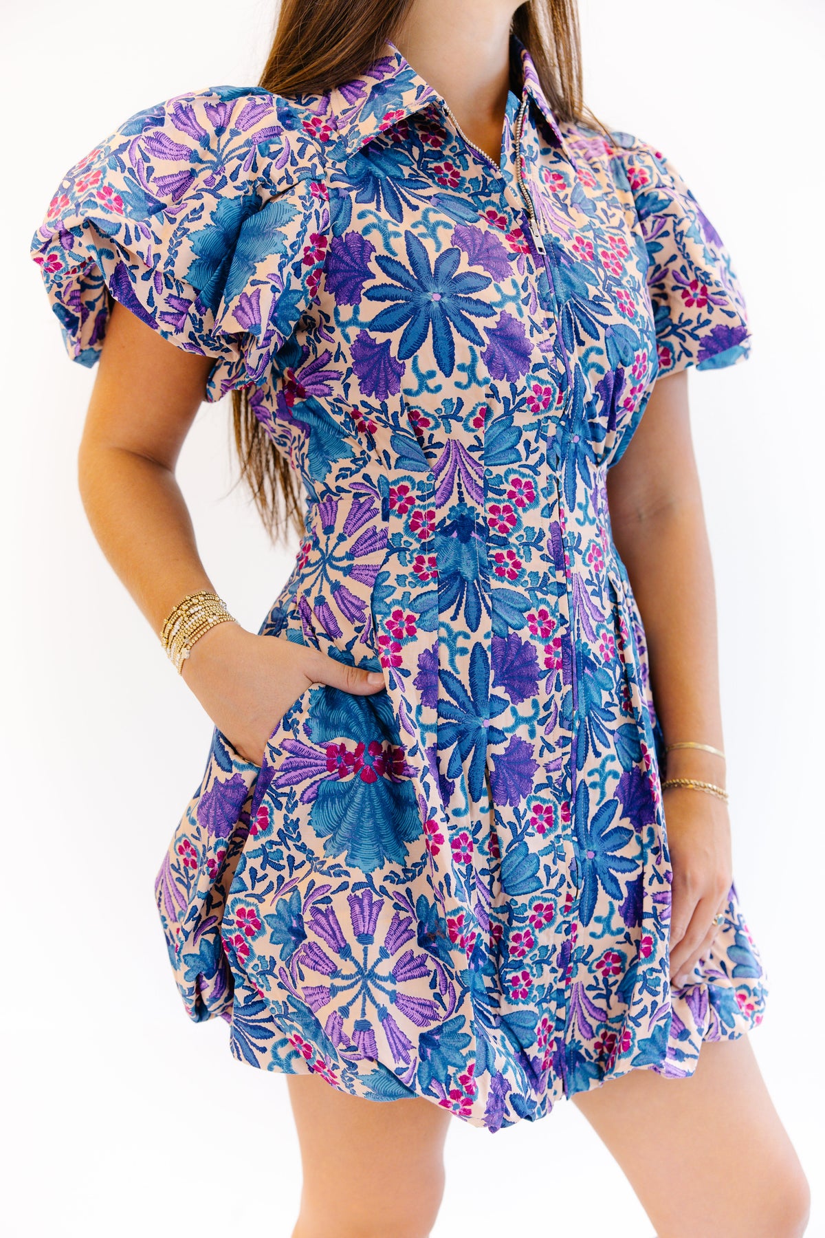 The Sadie Puff Sleeve Mini Dress is a vibrant statement piece with a playful silhouette. Featuring dramatic puff sleeves and a tailored fit through the bodice, this dress flares into a flattering mini skirt. Its bold floral print in shades of blue, purple, and pink adds a lively, artistic touch, while the front zipper closure brings a modern edge. Perfect for daytime outings or evening events, this dress pairs beautifully with heels or sandals for a polished, standout look.