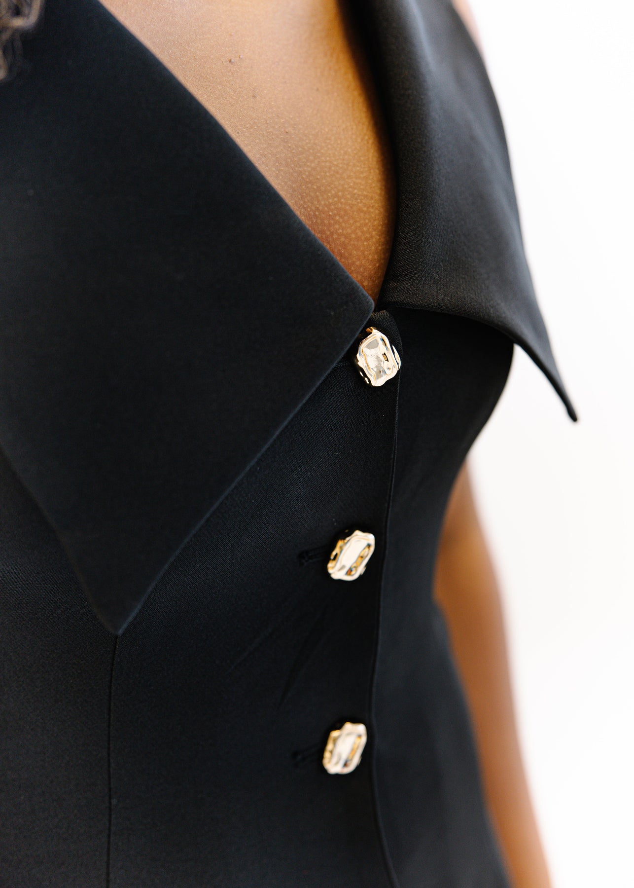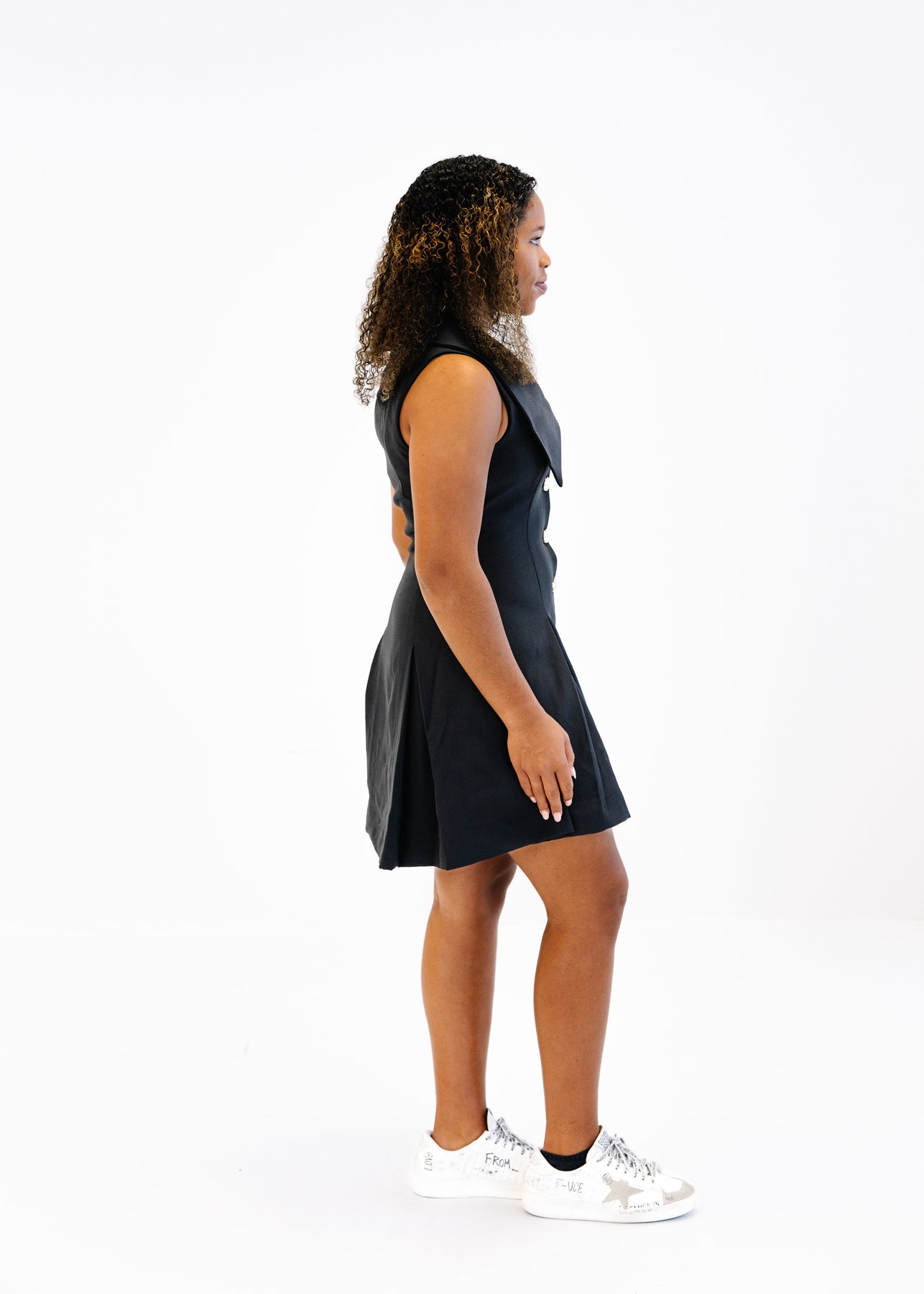 The Vivienne Button Front Mini Dress blends tailored sophistication with a modern, playful silhouette. Designed with a structured fit-and-flare cut, this mini dress features a striking oversized collar and a row of bold, textured buttons down the front for a refined touch. The pleated skirt adds subtle movement, while the sleeveless design makes it perfect for layering or wearing solo. Pair Vivienne with heels for a polished evening look or style it with ankle boots for a chic daytime outfit.