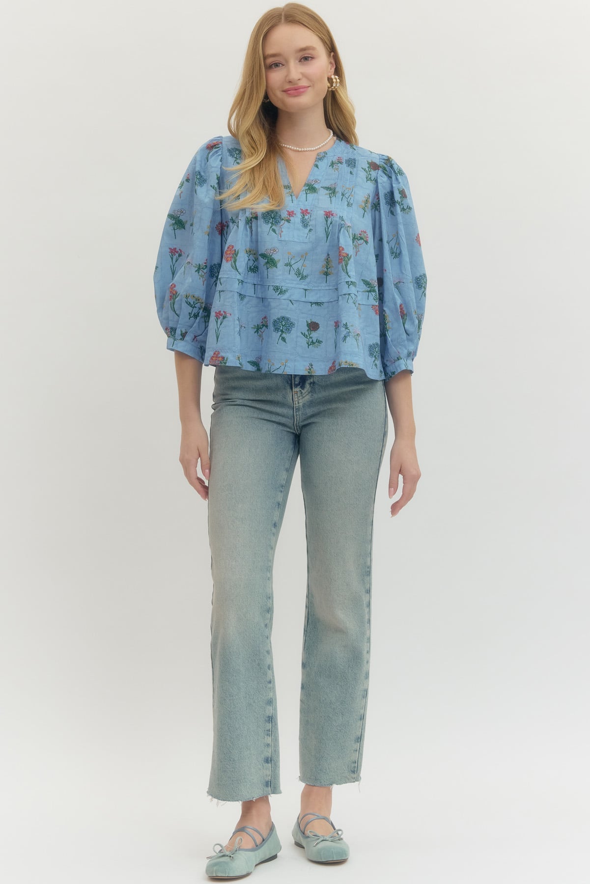 This top brings an easy mix of charm and everyday wearability. Designed with a soft floral print, it features a flattering v neck and relaxed fit that feels comfortable without looking oversized. The puff sleeves add a touch of volume and interest, while the lightweight fabric keeps it breezy and easy to style. Perfect for pairing with denim, trousers, or skirts, this top works just as well for casual days as it does for dressed-up plans. A versatile piece that adds personality to your everyday lineup. Floral print 3/4 puff sleeve top featuring pintuck detail at front and back. V-neckline. Unlined. Woven. Non-sheer. Lightweight. 100% Cotton. You will reach for this top again and again as you throw on your favorite jeans, you favorite mules, and think - ok what is that perfect transitional top I need to pull this together?
