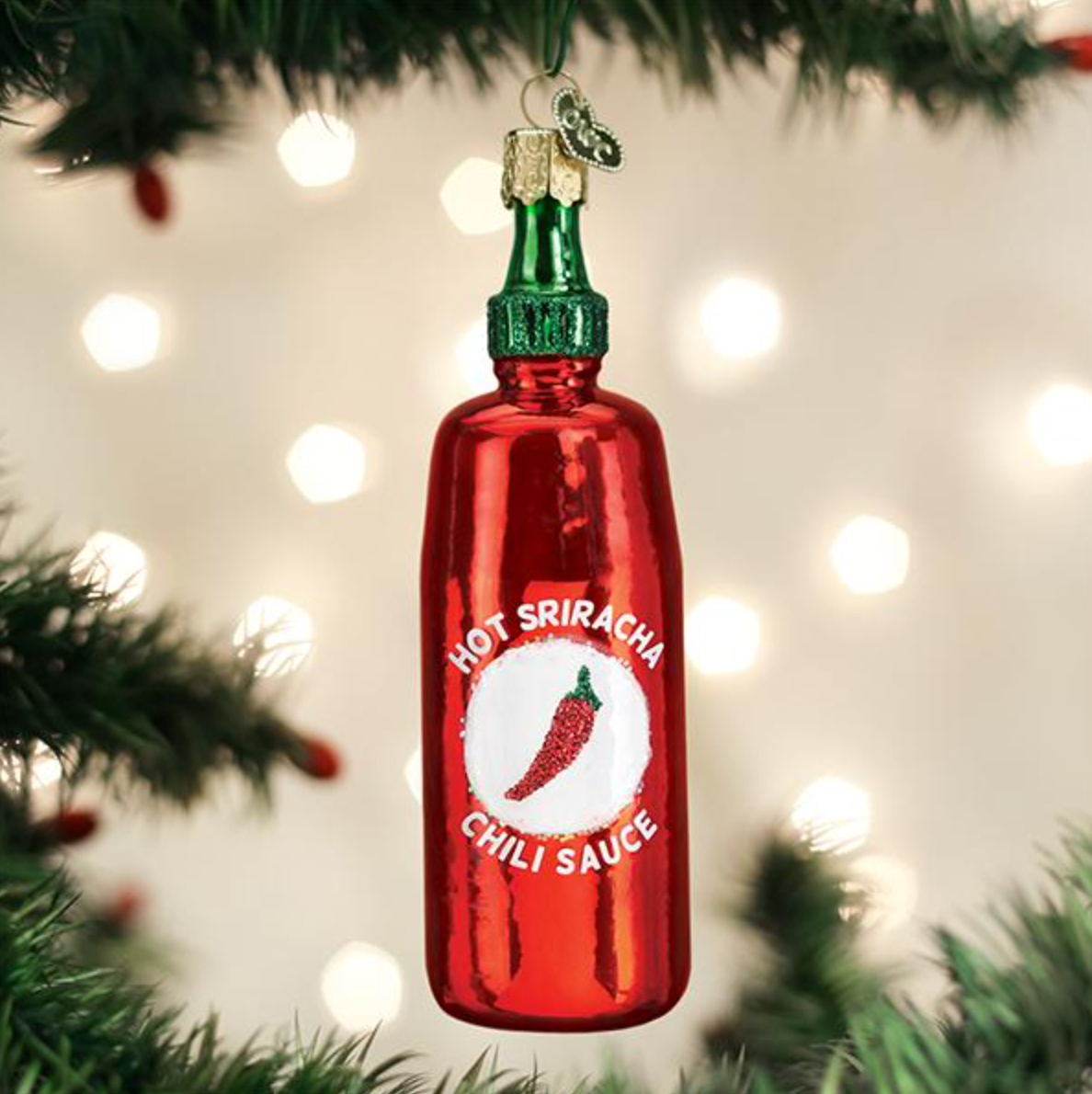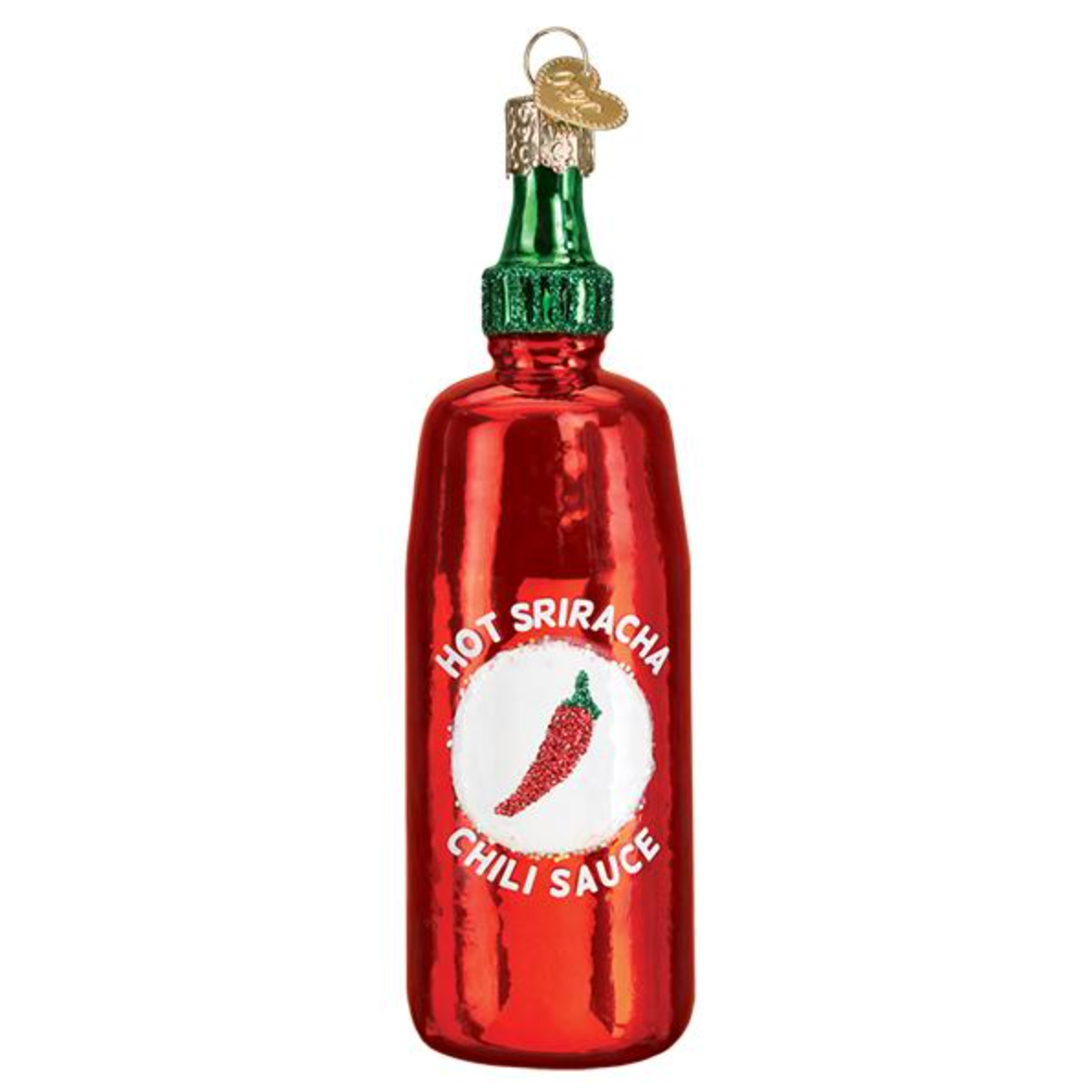 The Sriracha Ornament is a mouth-blown glass Christmas ornament that is hand-painted and hand-glittered.