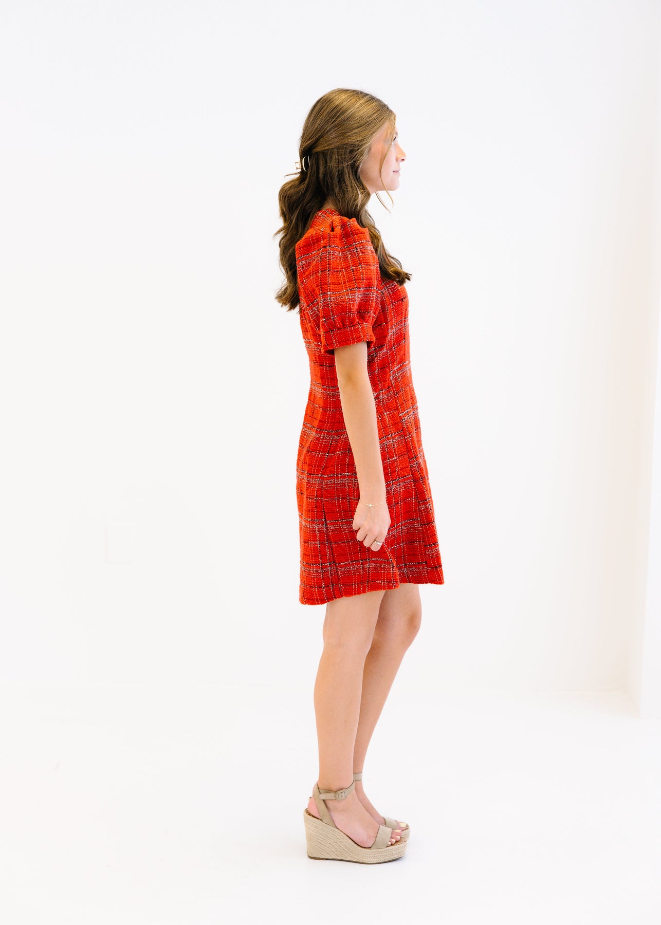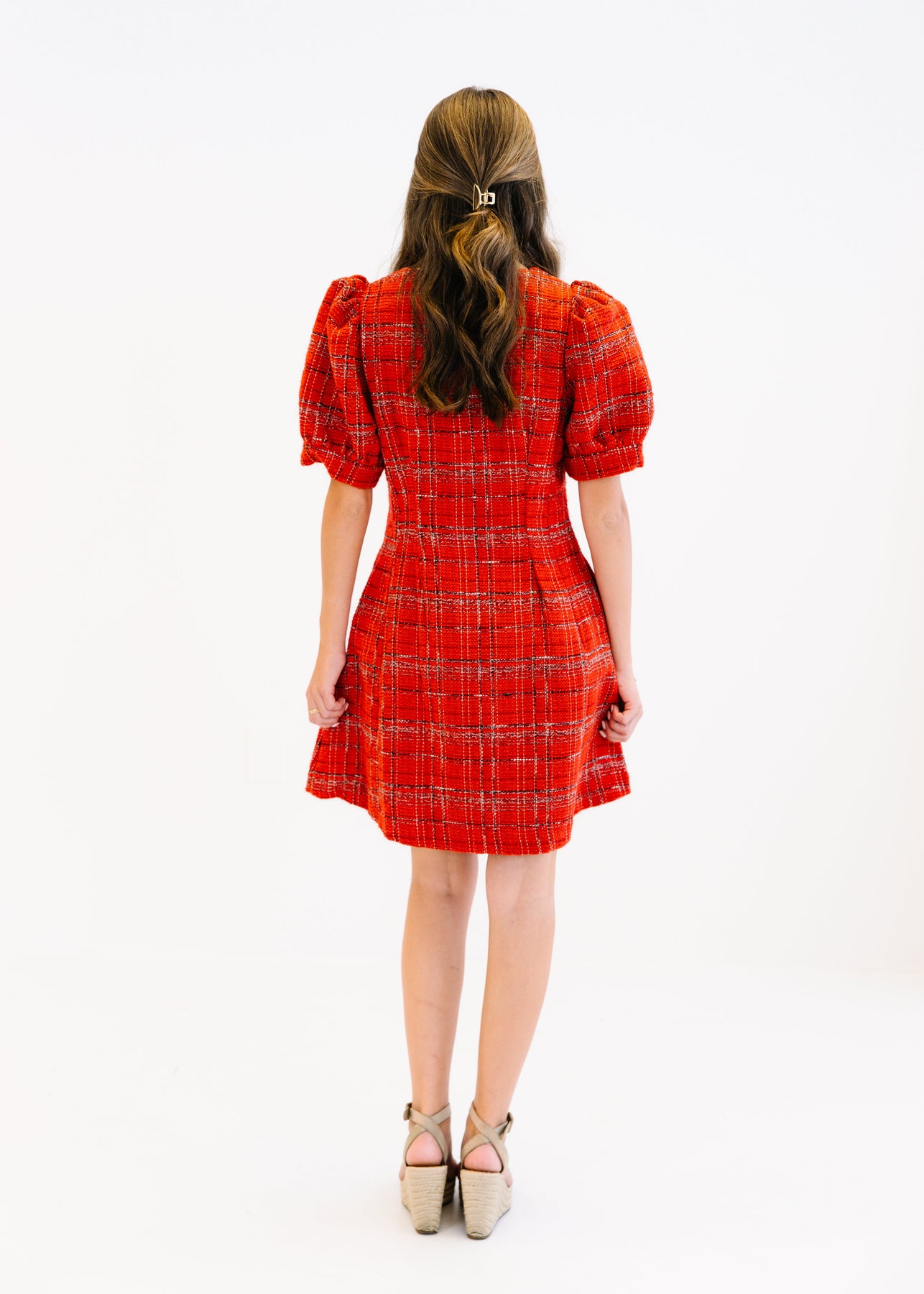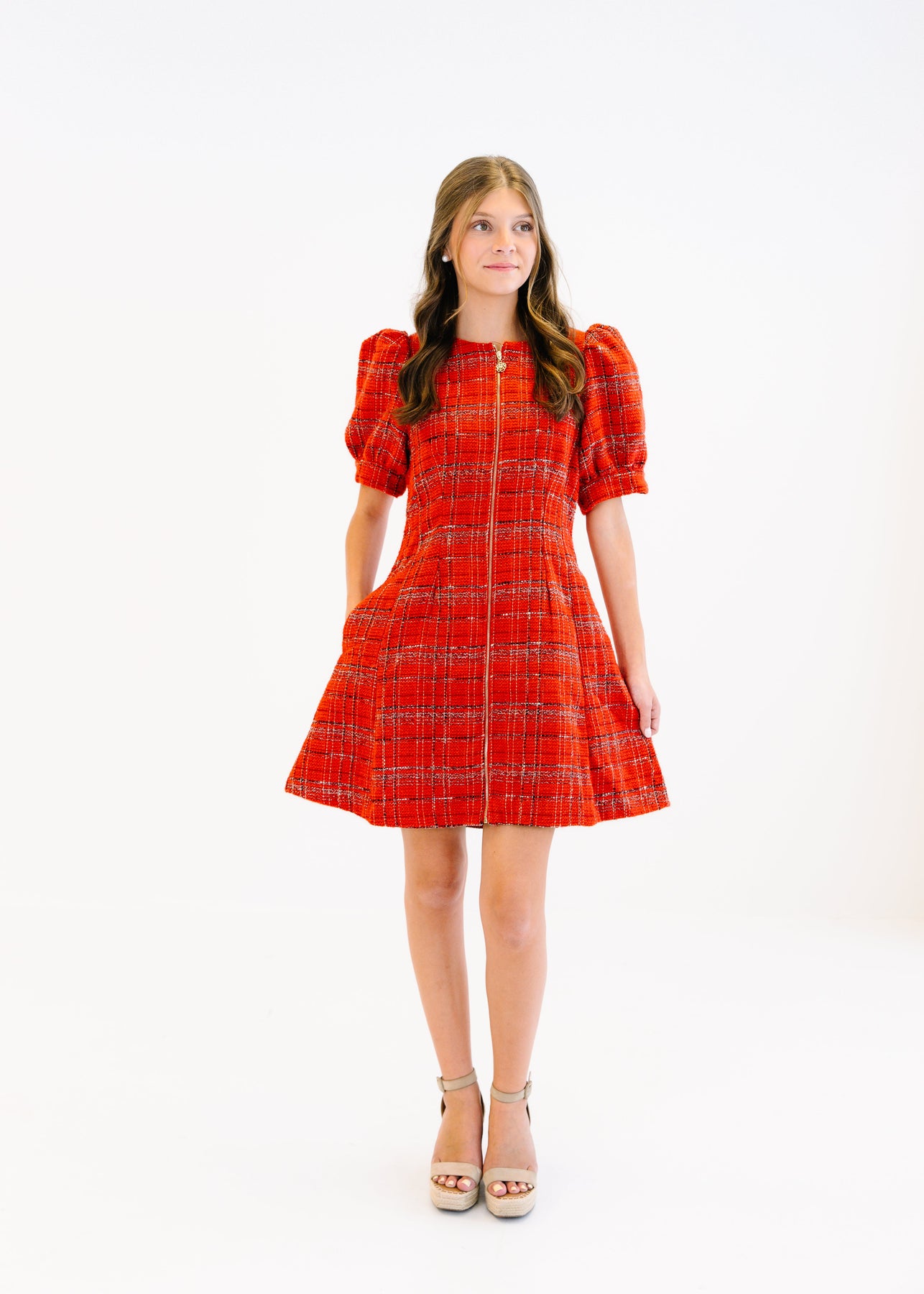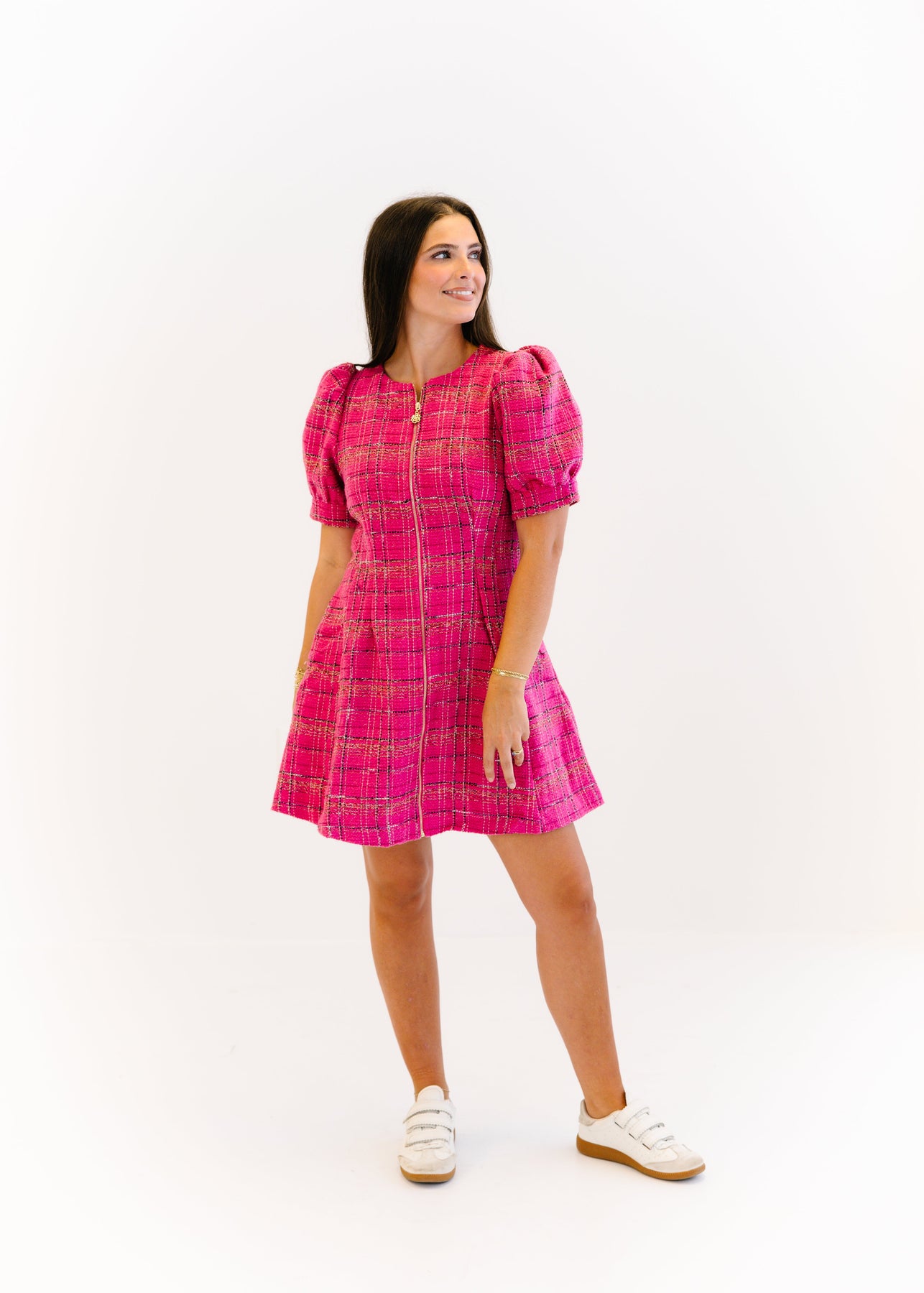 The Natalie Tweed Mini Dresss brings a chic, polished look with a playful pop of color. Crafted from a textured pink tweed fabric, this dress features voluminous puff sleeves and a tailored silhouette for a flattering fit. The front zip closure adds a modern touch, making it easy to wear and style. Perfect for brunch dates, parties, or a day out, pair it with strappy heels or ankle boots for a complete look.