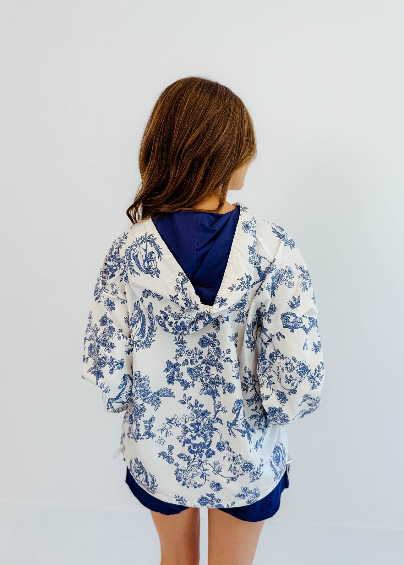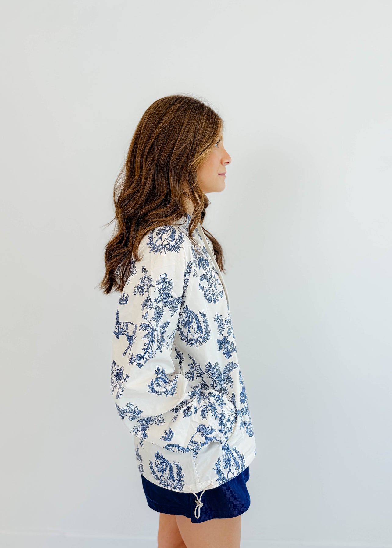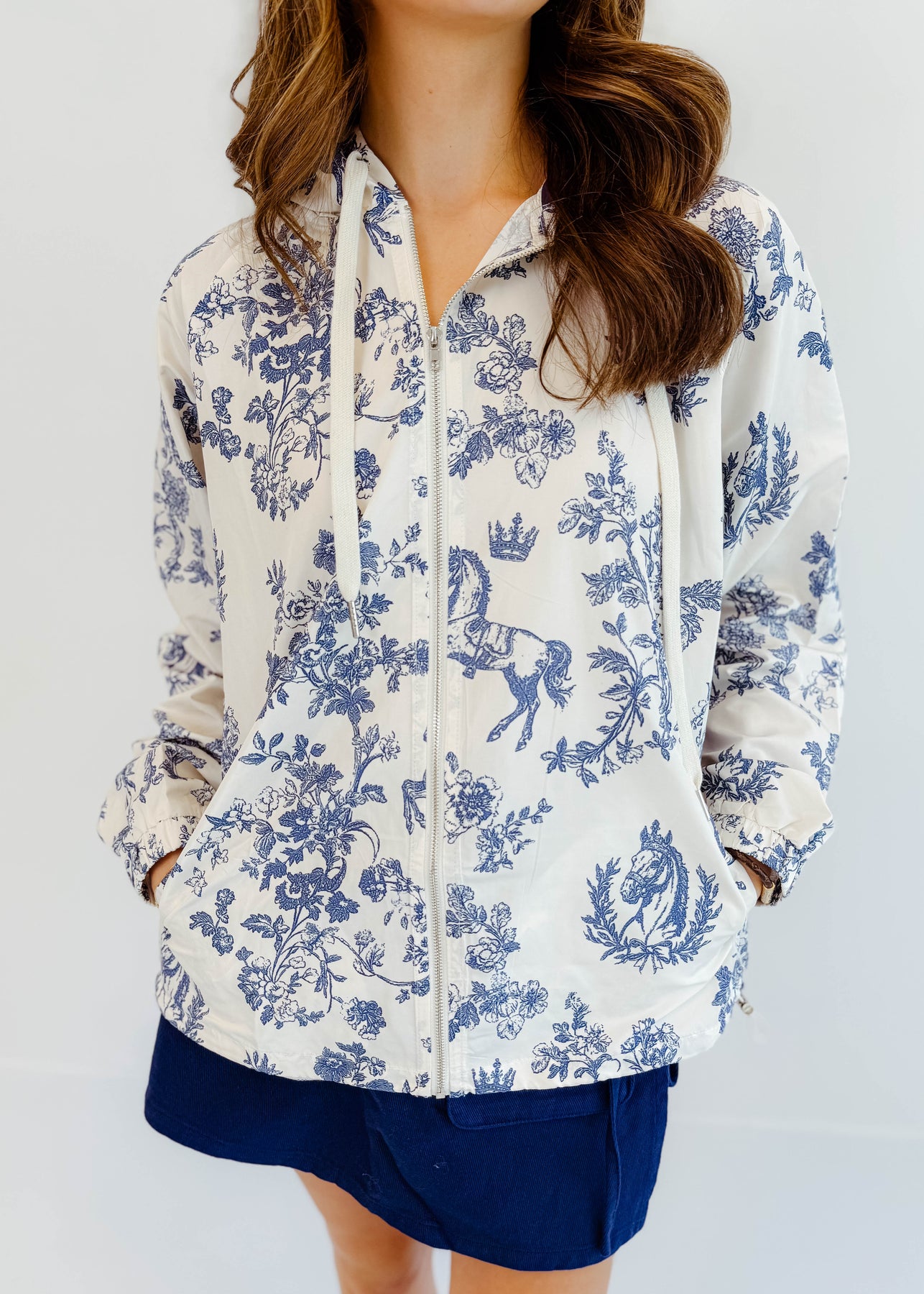 Sporty meets romantic in the Toile Zip-Up Windbreaker Jacket. This lightweight layer features a charming blue-and-white toile print, full front zip, and an adjustable drawcord hem for a customizable fit. Whether you're headed to pilates or grabbing coffee post-workout, this jacket adds a stylish edge to your athleisure look. Easy to pack and perfect for transitional weather.