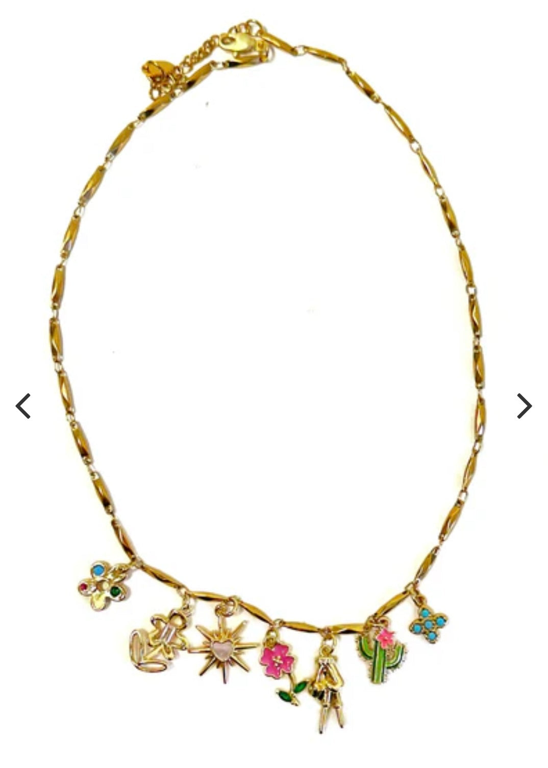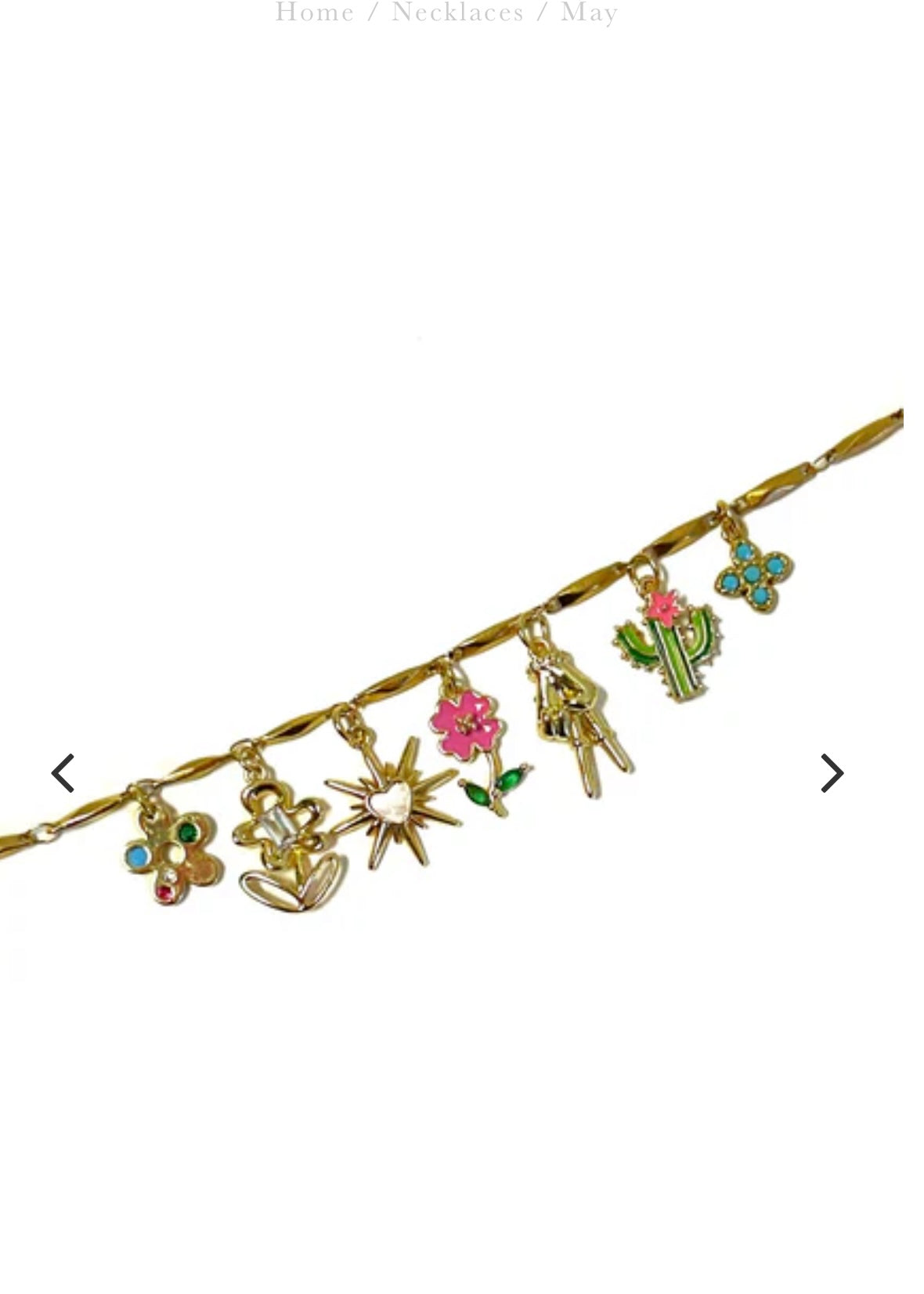 Add a splash of color to any outfit with the BPD May Necklace! This locally made charm necklace features fun, dainty charms and a touch of gold for a pop of playful style. Perfect for any quirky fashionista.