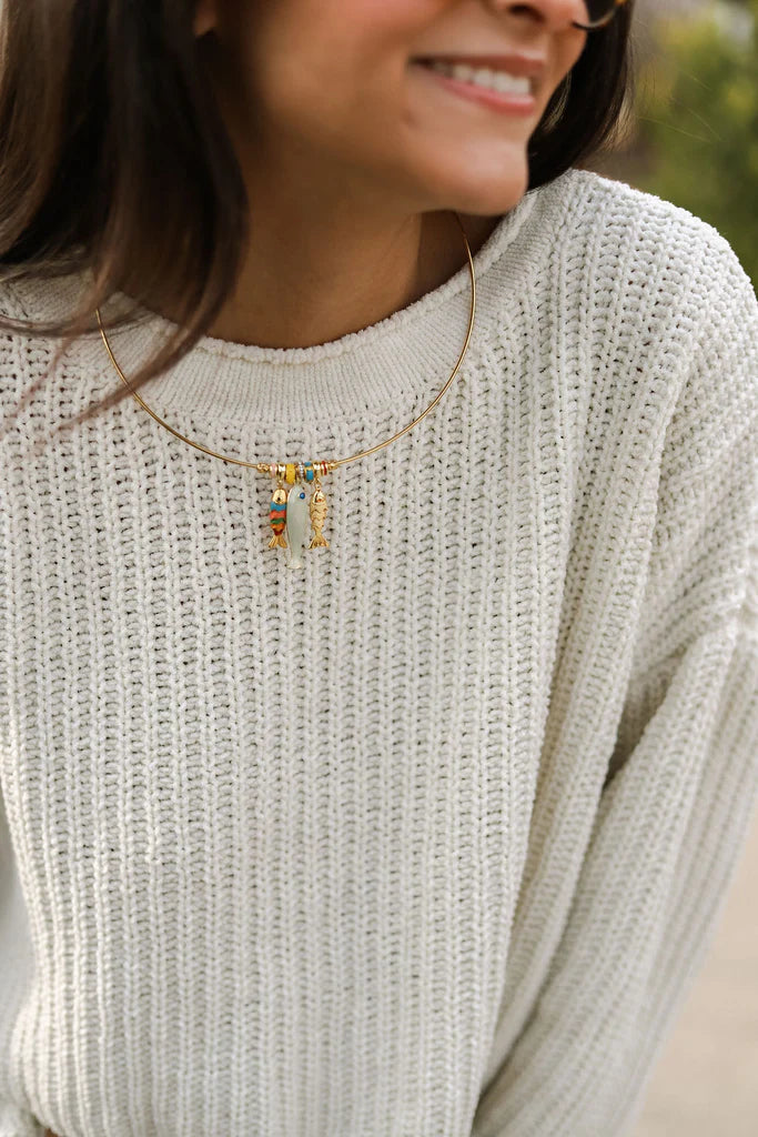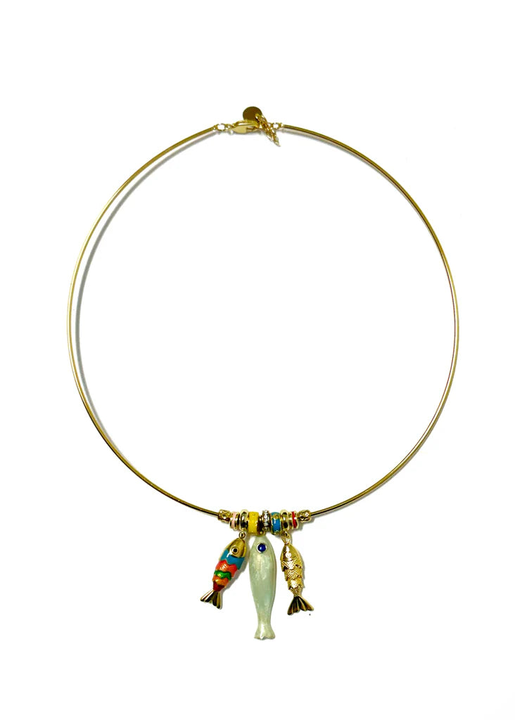Regular price $ 56.00A little coastal magic, right at your collarbone. The Dolan Collar Charm Necklace features a sleek gold collar base adorned with delicate fish charms and tiny pops of color that feel playful, sun washed, and full of personality.