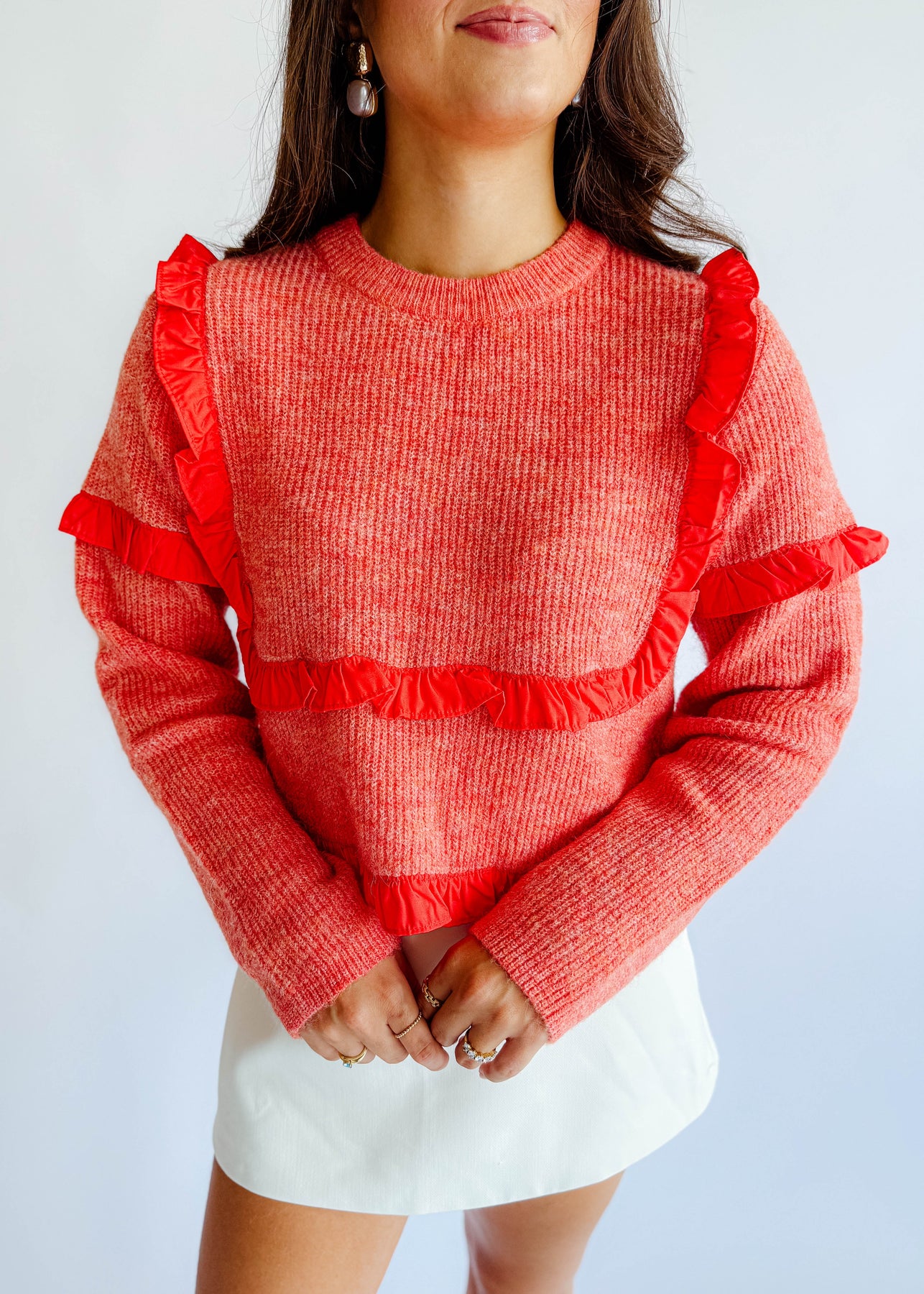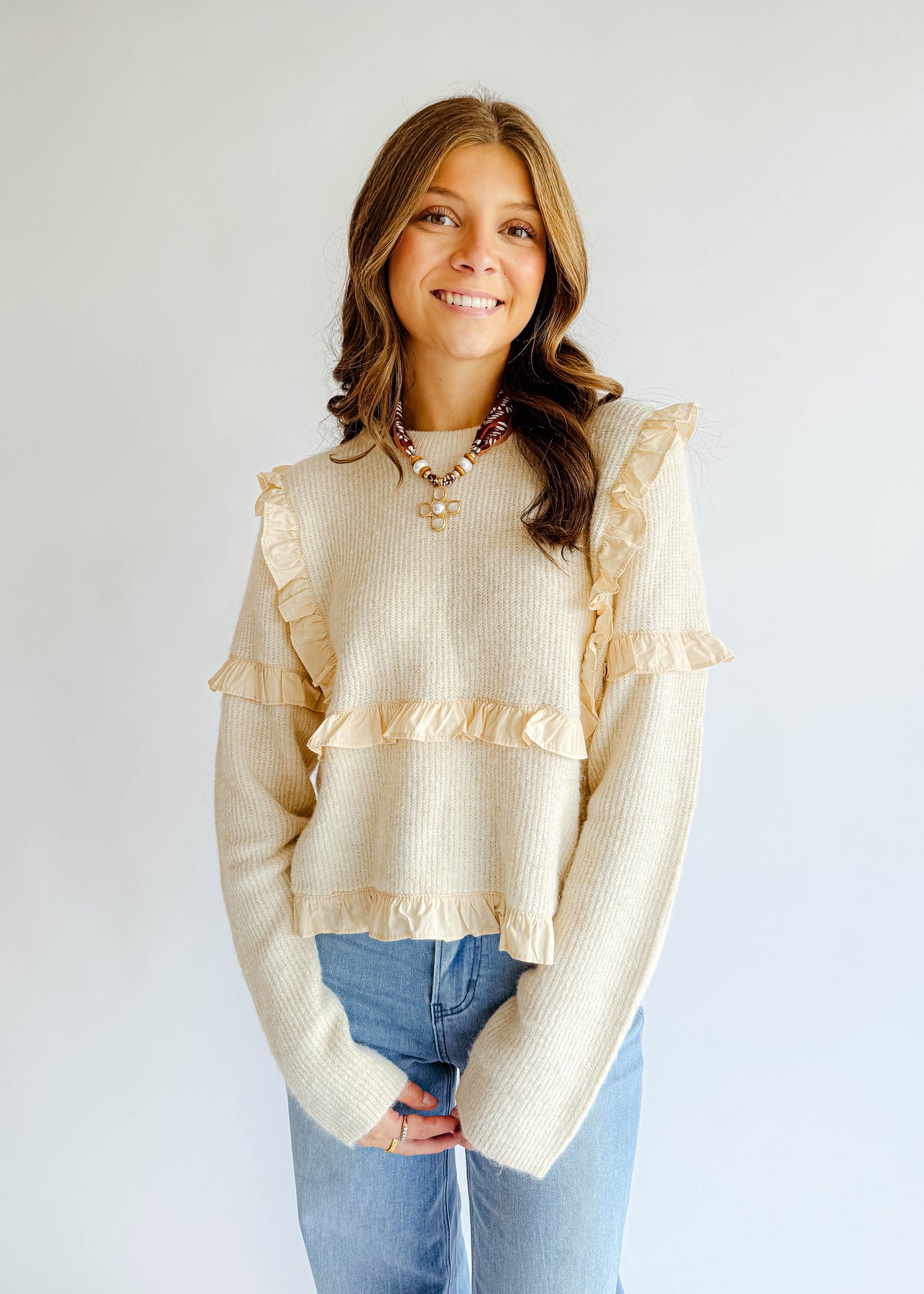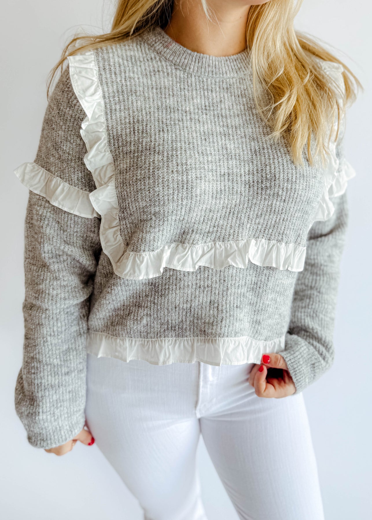 Elena's Ruffle Detail Sweater adds playful texture to cozy days. Designed with soft knit fabric and statement ruffle detailing, it offers a flattering cropped silhouette that pairs effortlessly with high-waisted jeans, skirts, or trousers. Perfect for layering or wearing solo, this sweater balances comfort with standout style for a chic everyday look.