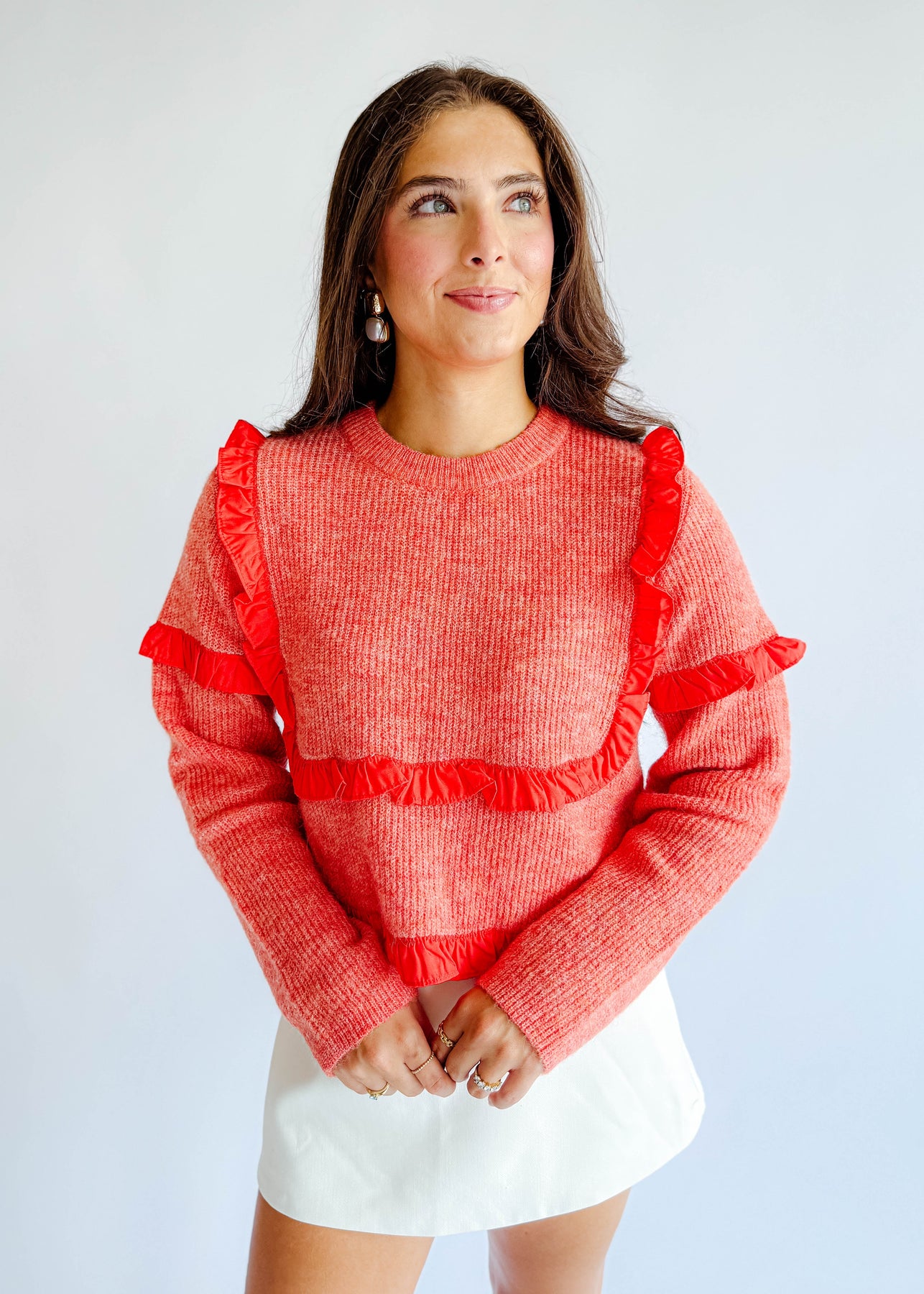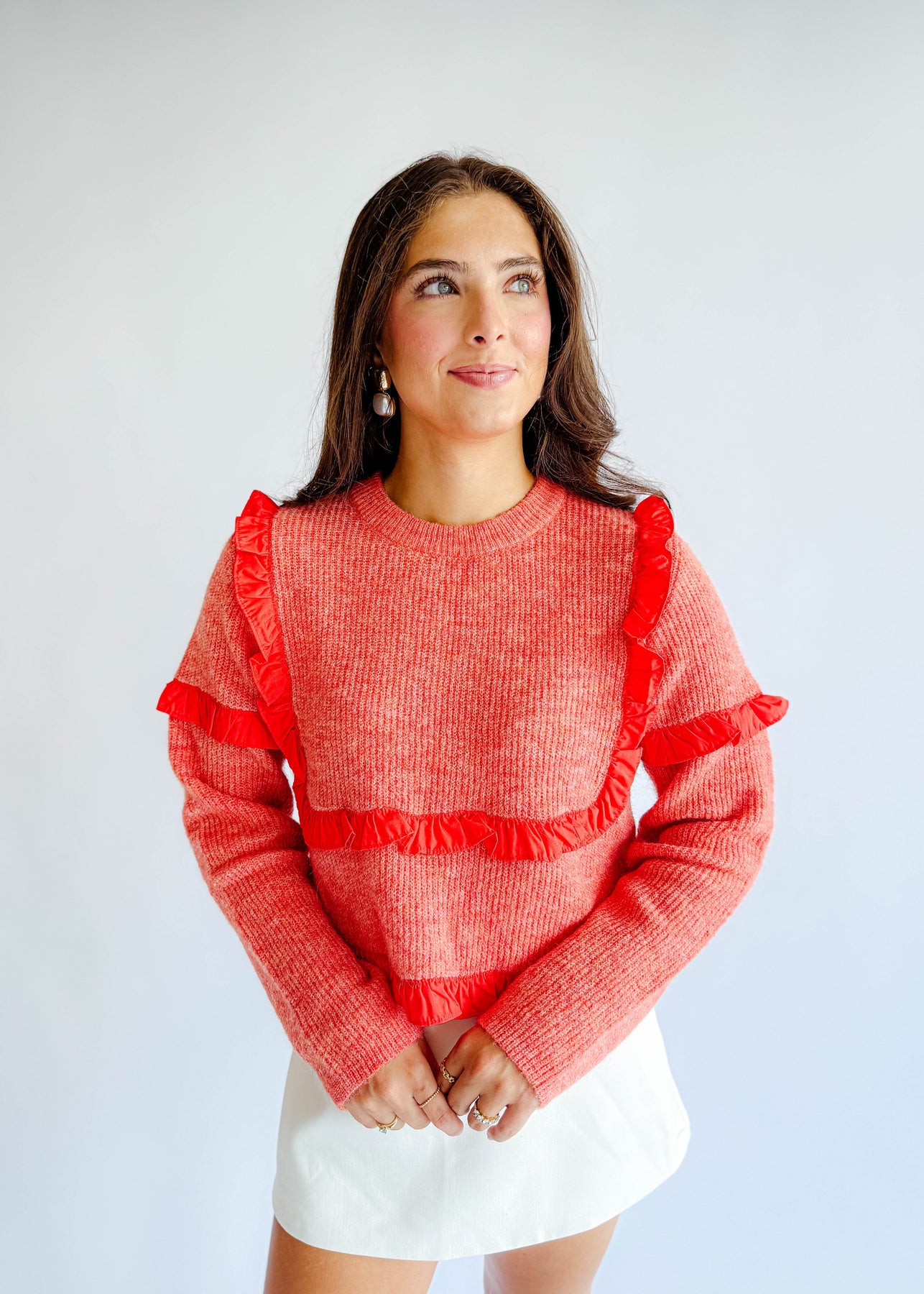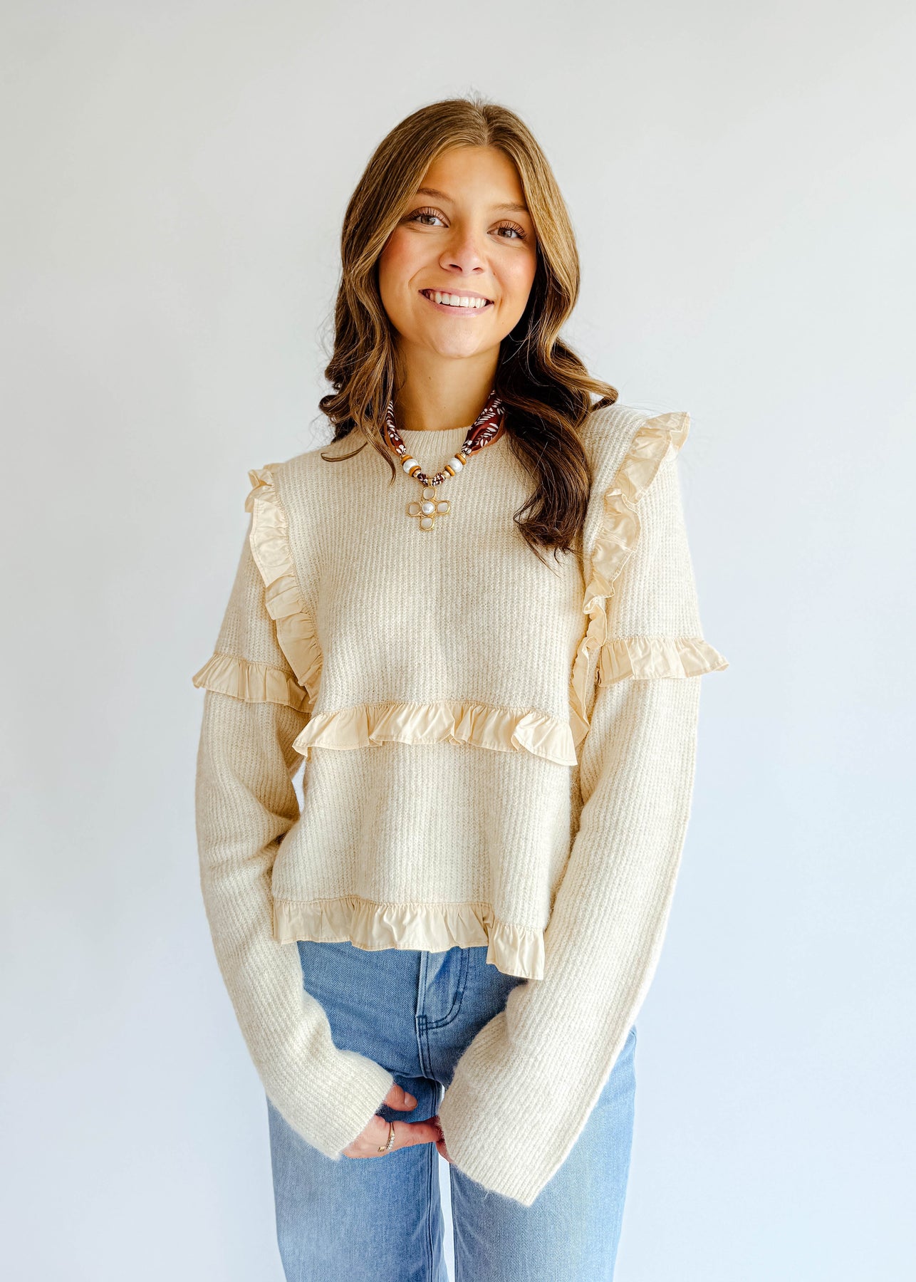 Elena's Ruffle Detail Sweater adds playful texture to cozy days. Designed with soft knit fabric and statement ruffle detailing, it offers a flattering cropped silhouette that pairs effortlessly with high-waisted jeans, skirts, or trousers. Perfect for layering or wearing solo, this sweater balances comfort with standout style for a chic everyday look.
