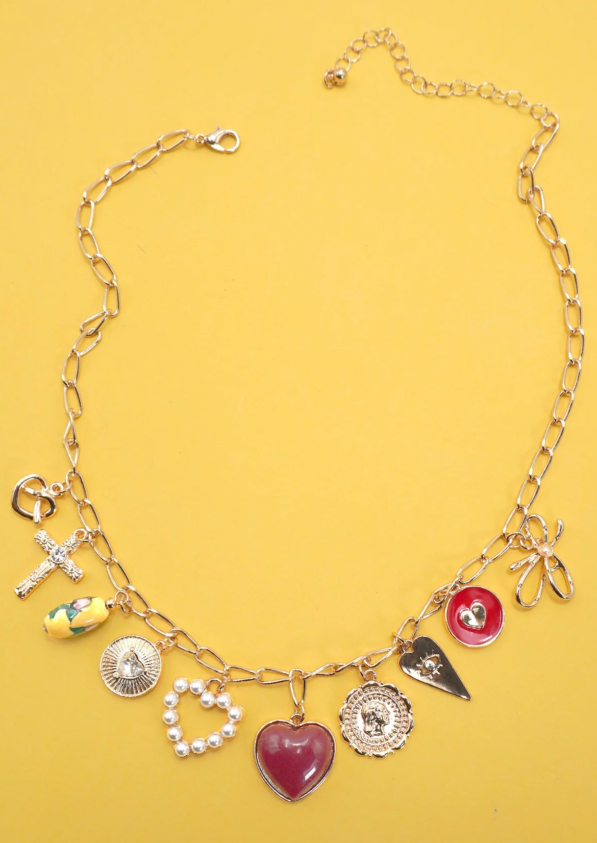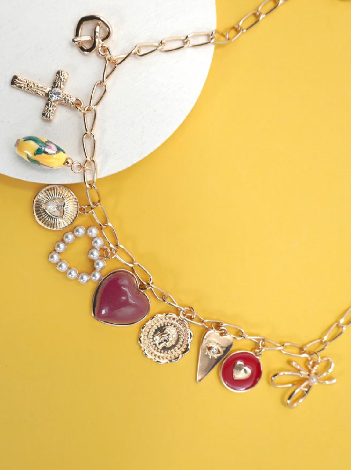 This stunning charm necklace combines a variety of meaningful and beautiful elements. Featuring a delicate bow, an intricate toile floral vase, a bold red heart, an elegant gold cross, and a pearl heart coin, each charm adds a unique flair to the necklace. The combination of floral, vintage, and religious motifs makes it perfect for anyone!