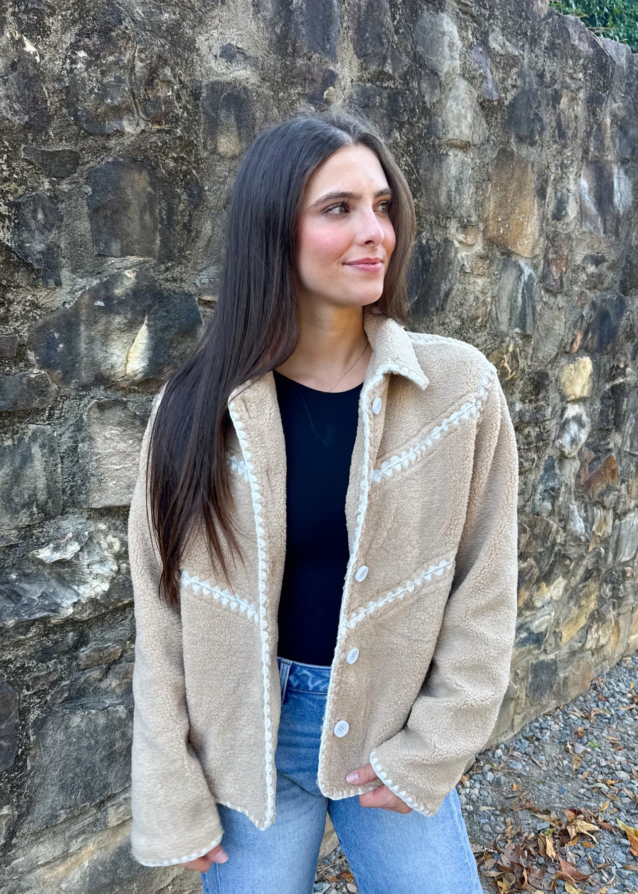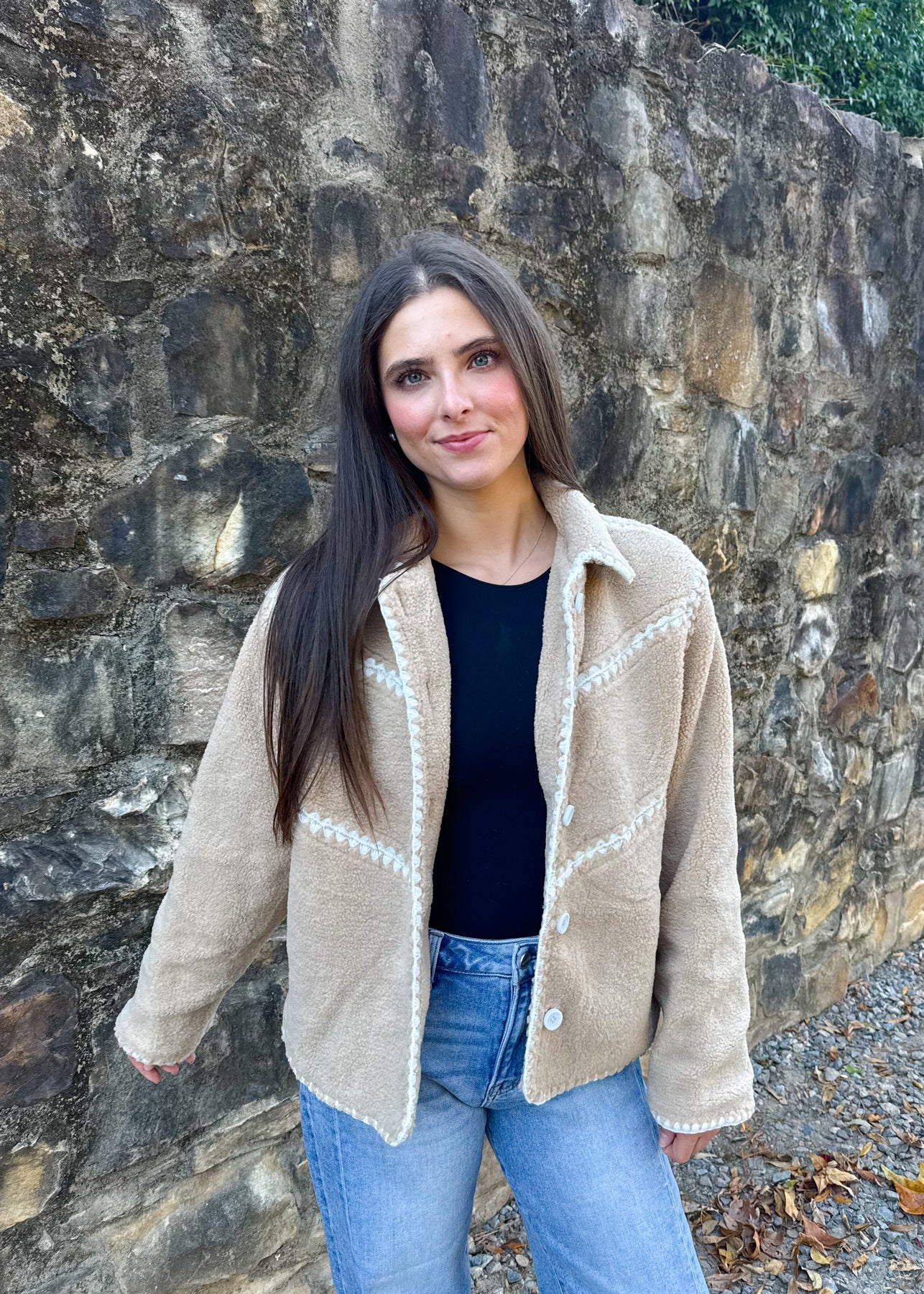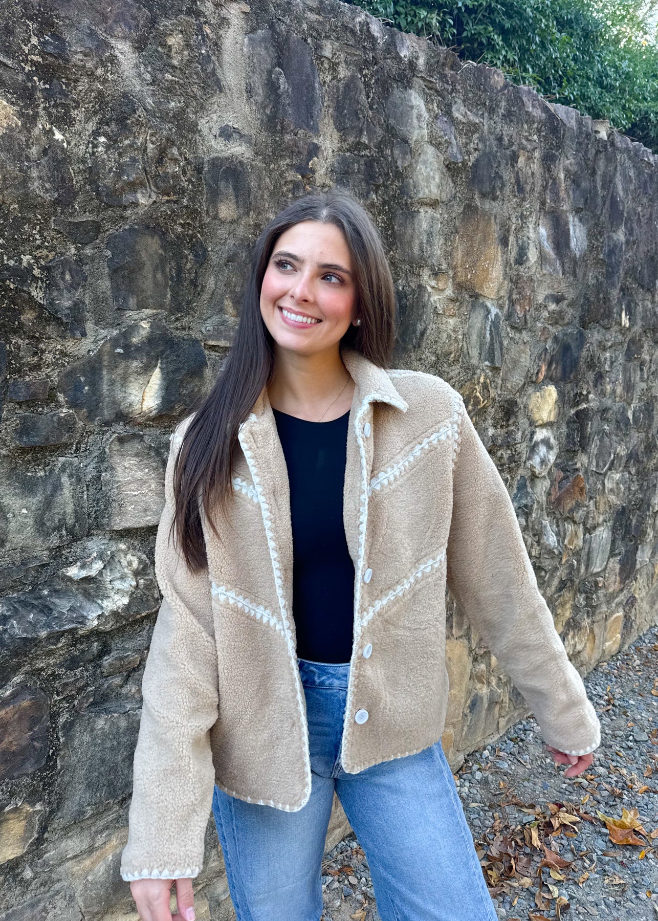 The Chloe Sherpa Button-Up Jacket is a cozy and stylish layering piece perfect for cooler days. Crafted from ultra-soft sherpa fabric, this jacket features a relaxed fit with button closures and subtle white stitched detailing in a chevron pattern for a touch of texture and style. The neutral taupe shade makes it versatile and easy to pair with any outfit, while the lightweight warmth keeps you comfortable all day long.