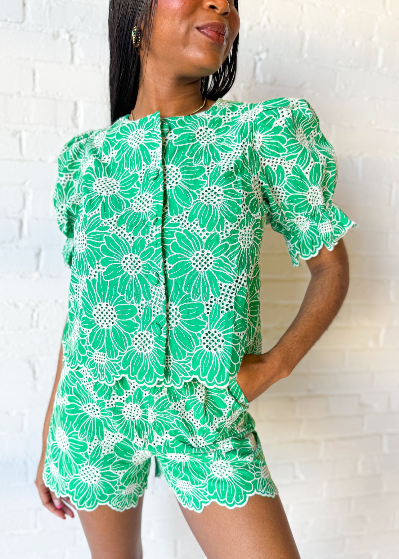 Soft and feminine with beautiful detail, the Elodie Lace Puff Sleeve Top is designed to elevate everyday looks. Featuring delicate lace fabric throughout, this top is finished with subtle puff sleeves and a scalloped hem for added charm. The button front design adds a classic touch while keeping the fit comfortable and easy to wear. Perfect for pairing with denim, skirts, or coordinating lace bottoms, this top works beautifully for brunch dates, special occasions, or dressed up casual days when you want something a little extra.